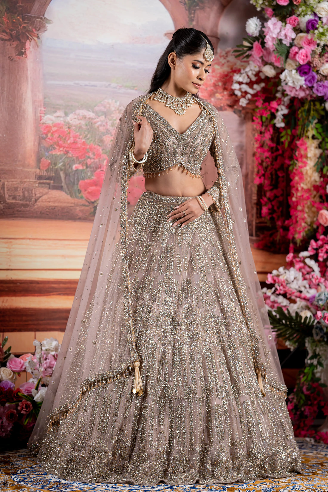 Dusty Taupe & Silver Linear Sequin Embroidered Bridal Lehenga