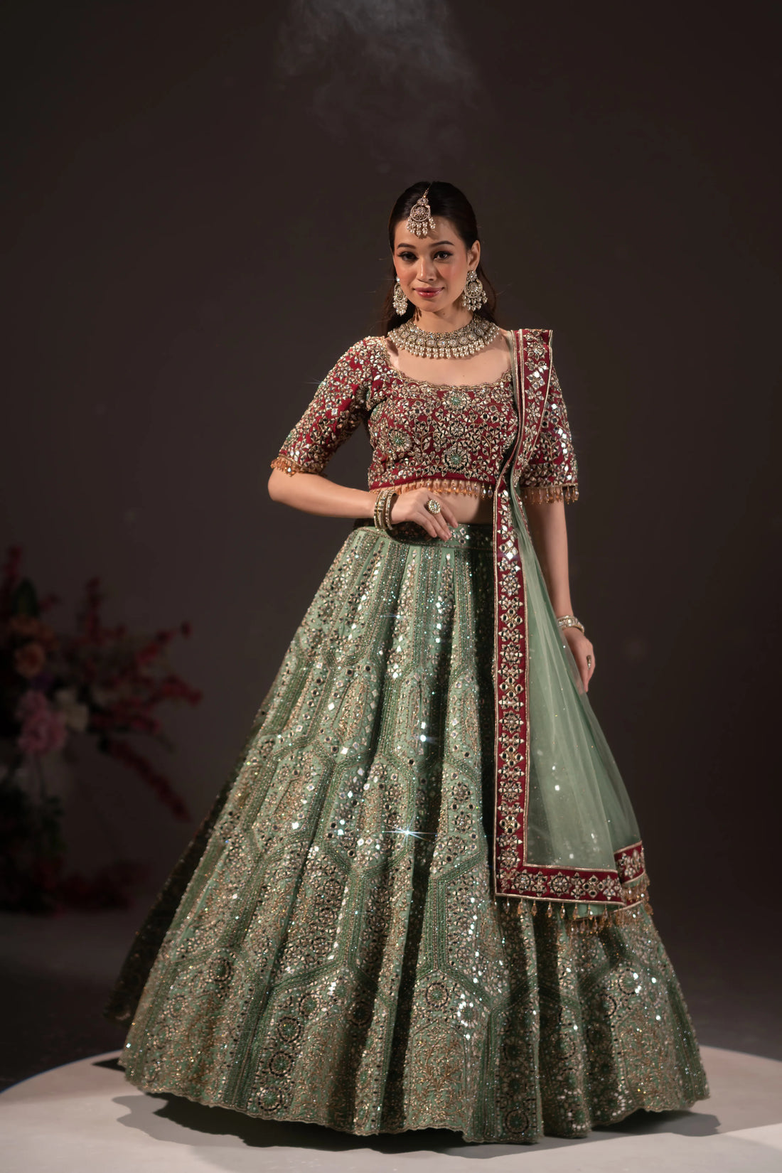 Seafoam Green & Maroon Contrast Mirror Work Bridal Lehenga