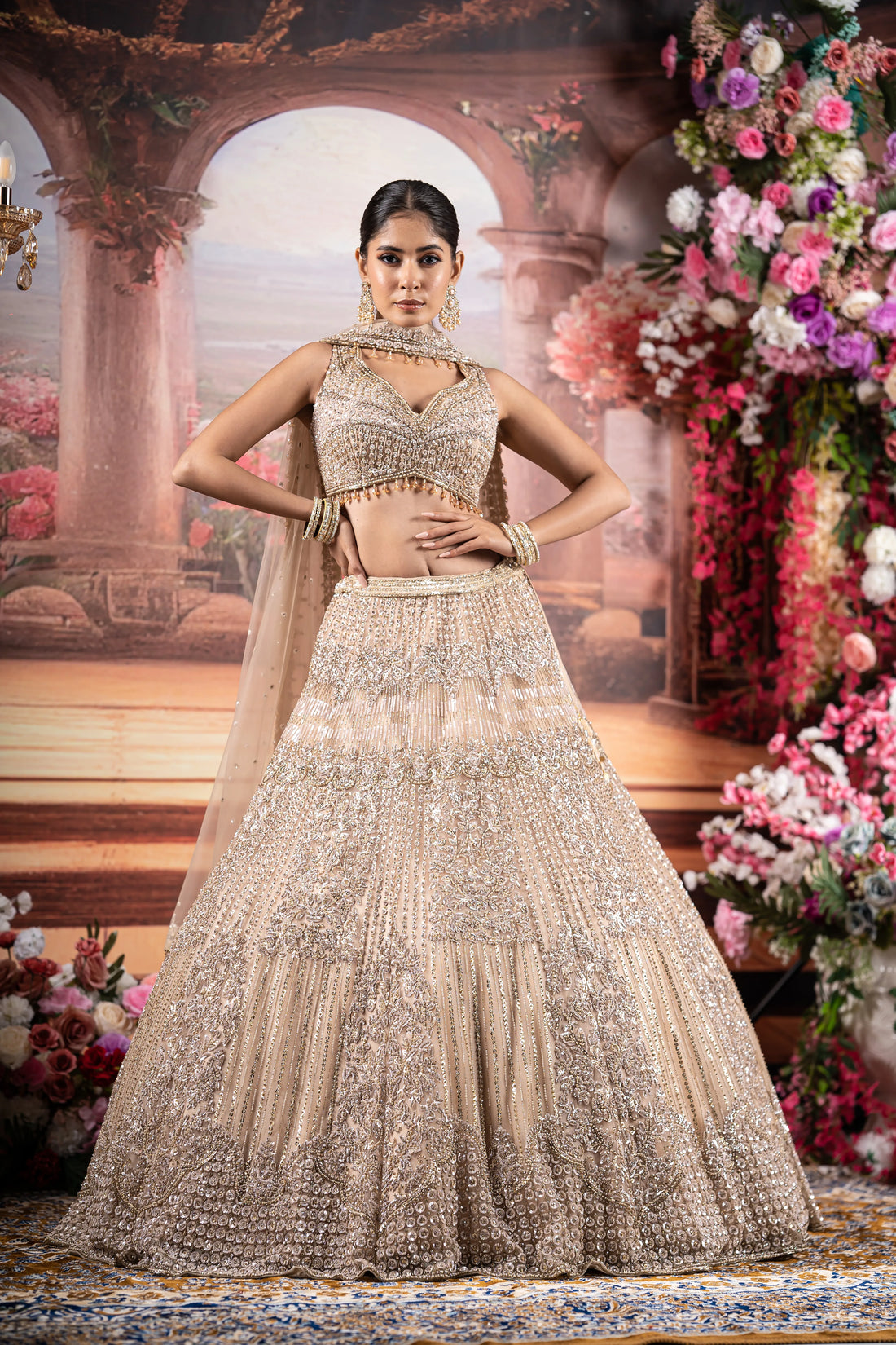 Champagne Beige Linear Sequin & Crystal Embroidered Bridal Lehenga