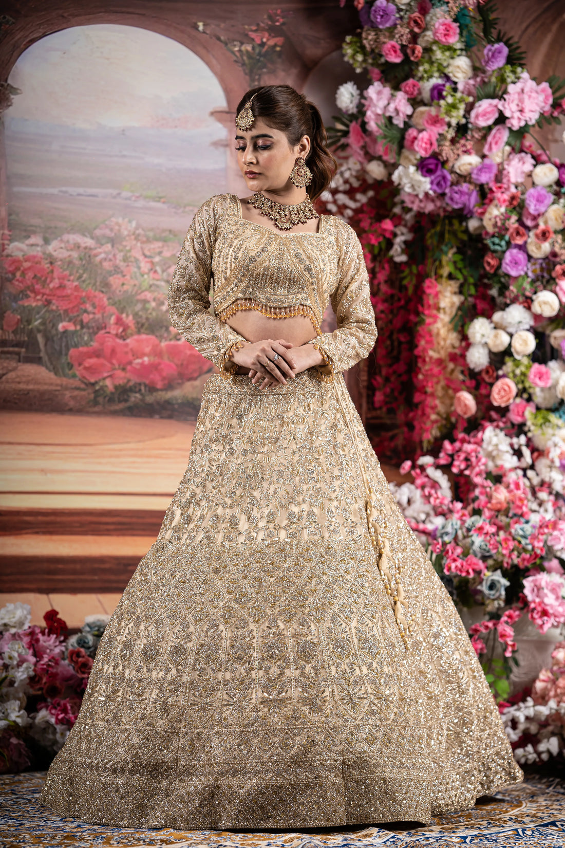 Champagne Gold Heavy Zardosi & Geometric Embroidered Bridal Lehenga