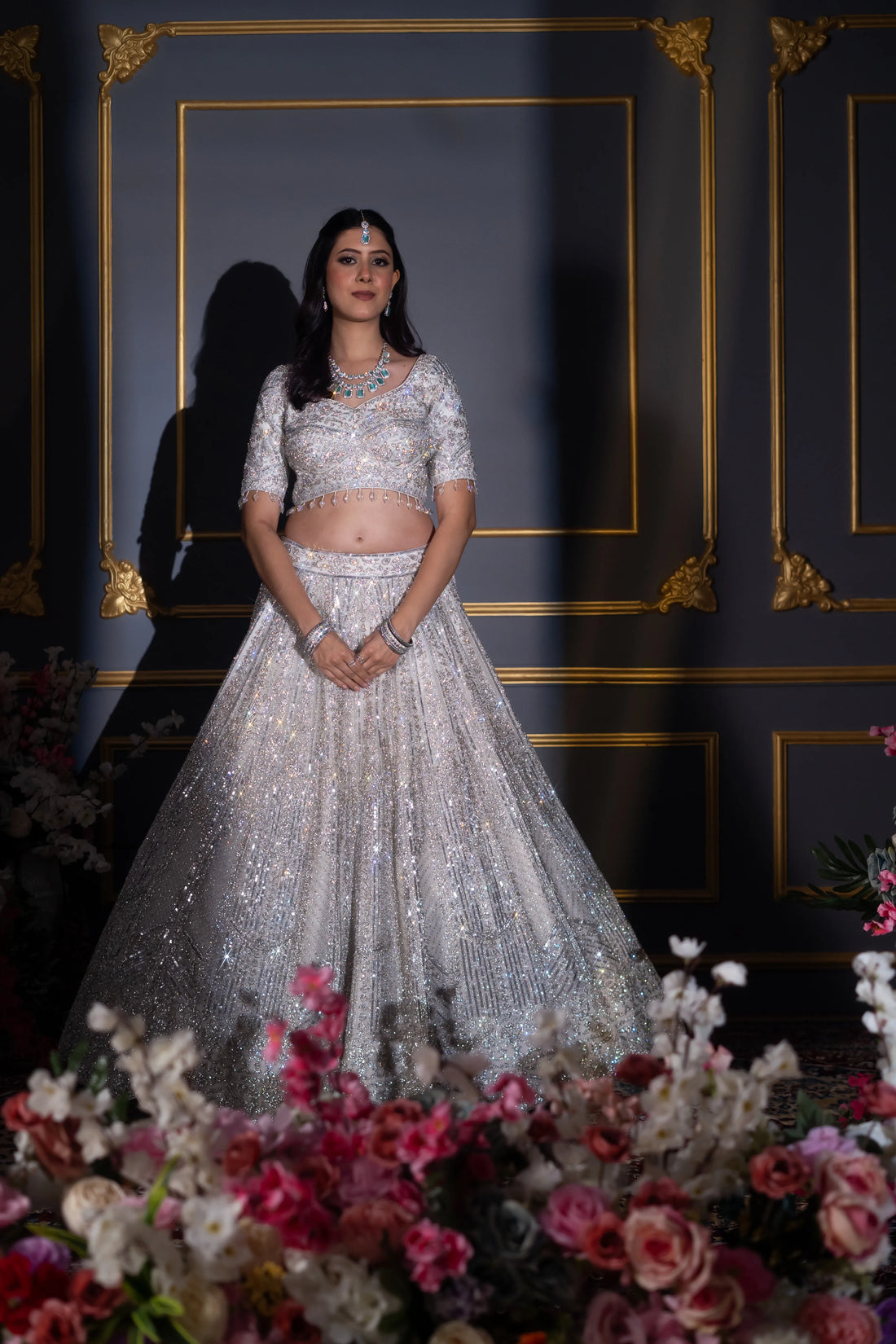Pristine Silver & Ivory Linear Sequin Embroidered Bridal Lehenga