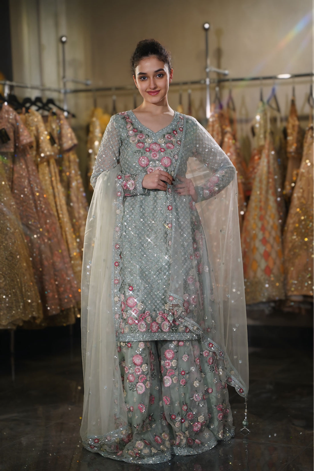 This collection reimagines traditional shararas through fluid drape, soft pastels, and handcrafted embroidery, made for women who dance through life’s grandest moments.
