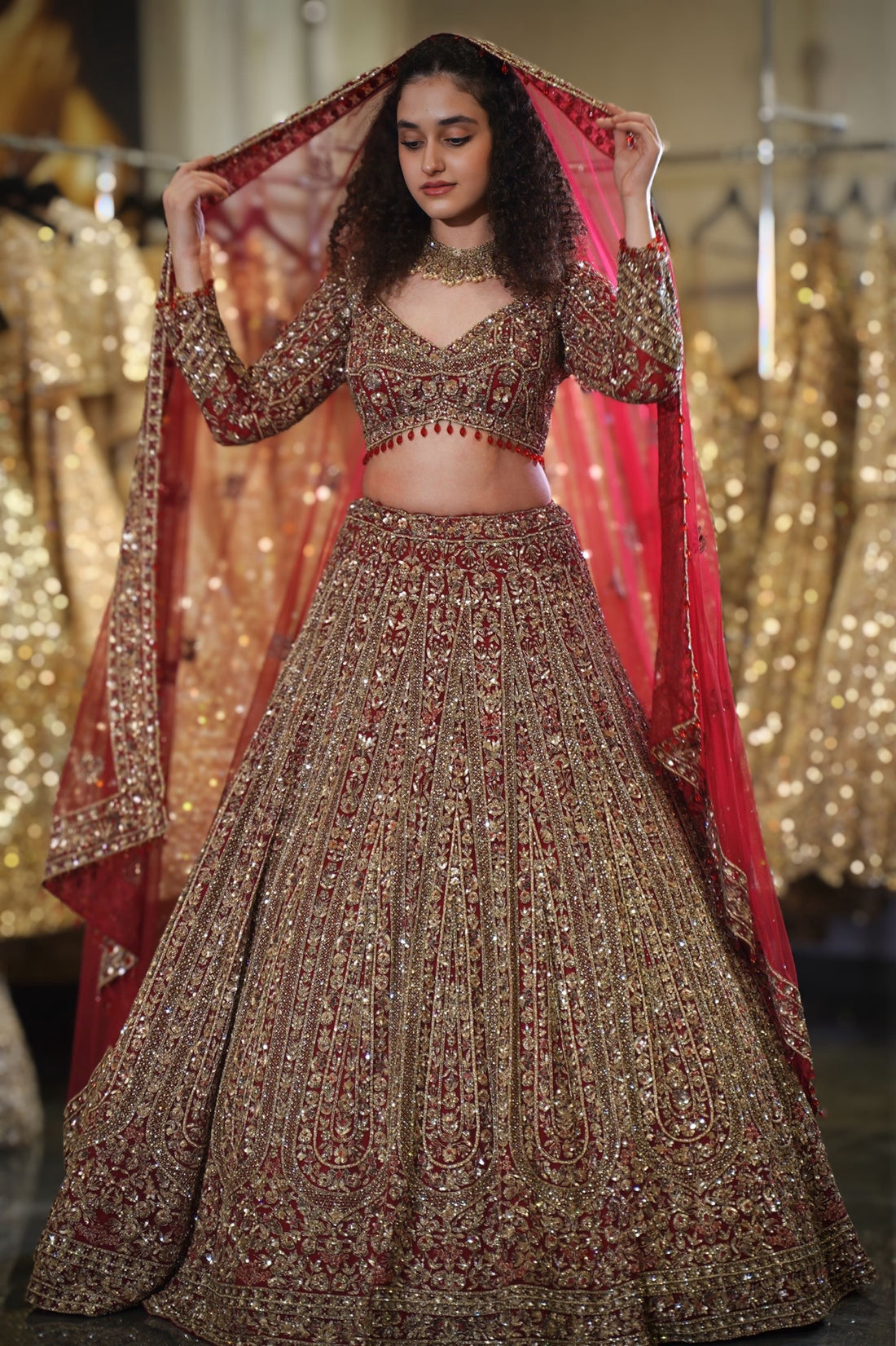 Deep Red Geometric Zardosi & Scalloped Embroidered Bridal Lehenga