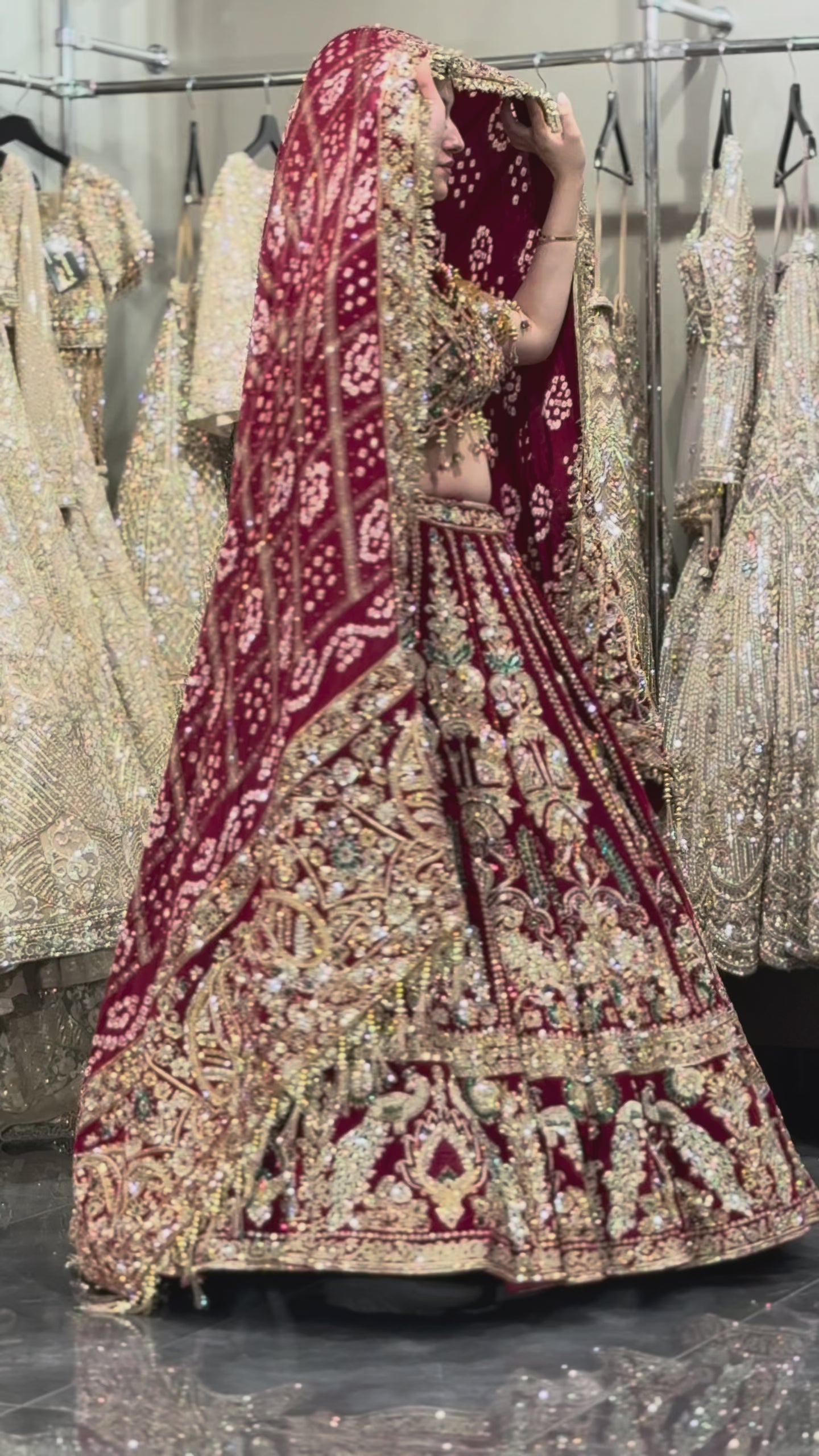 Deep Maroon Geometric Zardosi & Crystal Embroidered Bridal Lehenga