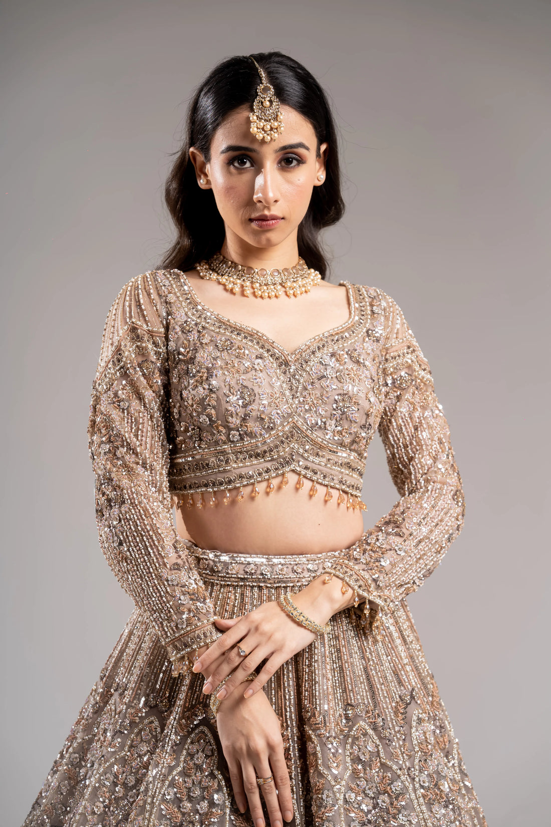 Dusty Taupe Champagne Scalloped Sequin Embroidered Bridal Lehenga