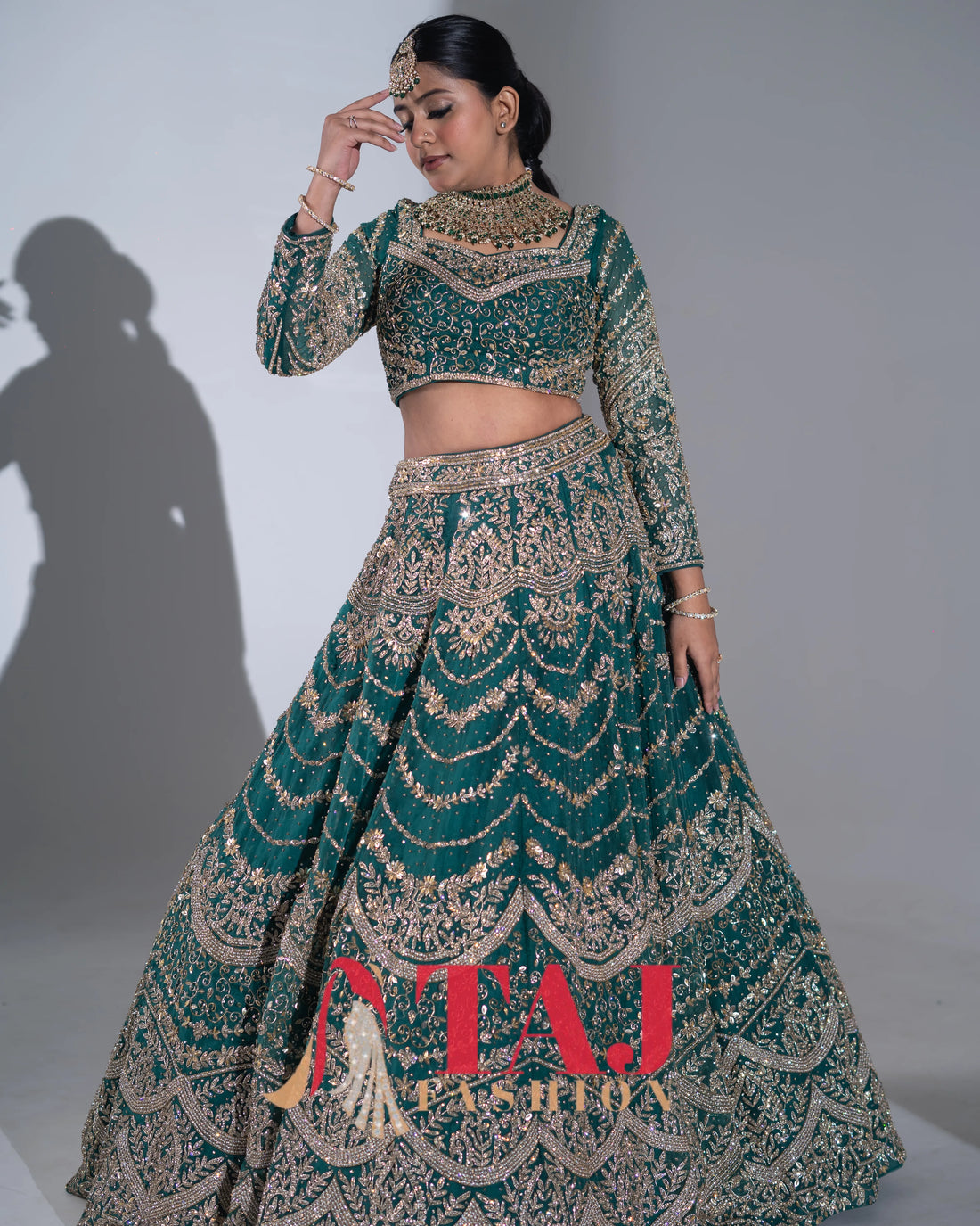 Emerald Green Scalloped Heavy Zardosi Embroidered Bridal Lehenga