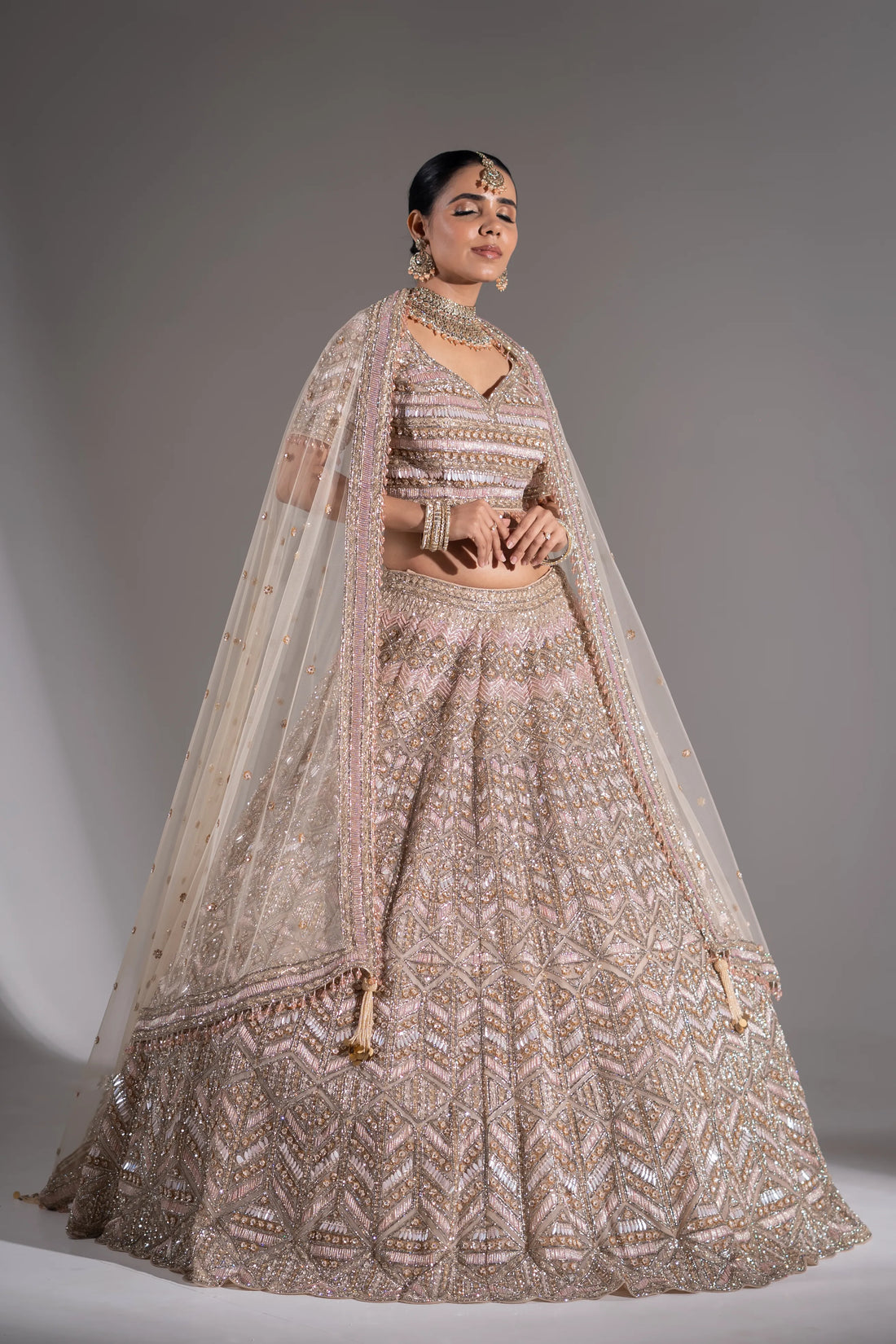 Blush Pink & Champagne Geometric Sequin Embroidered Bridal Lehenga