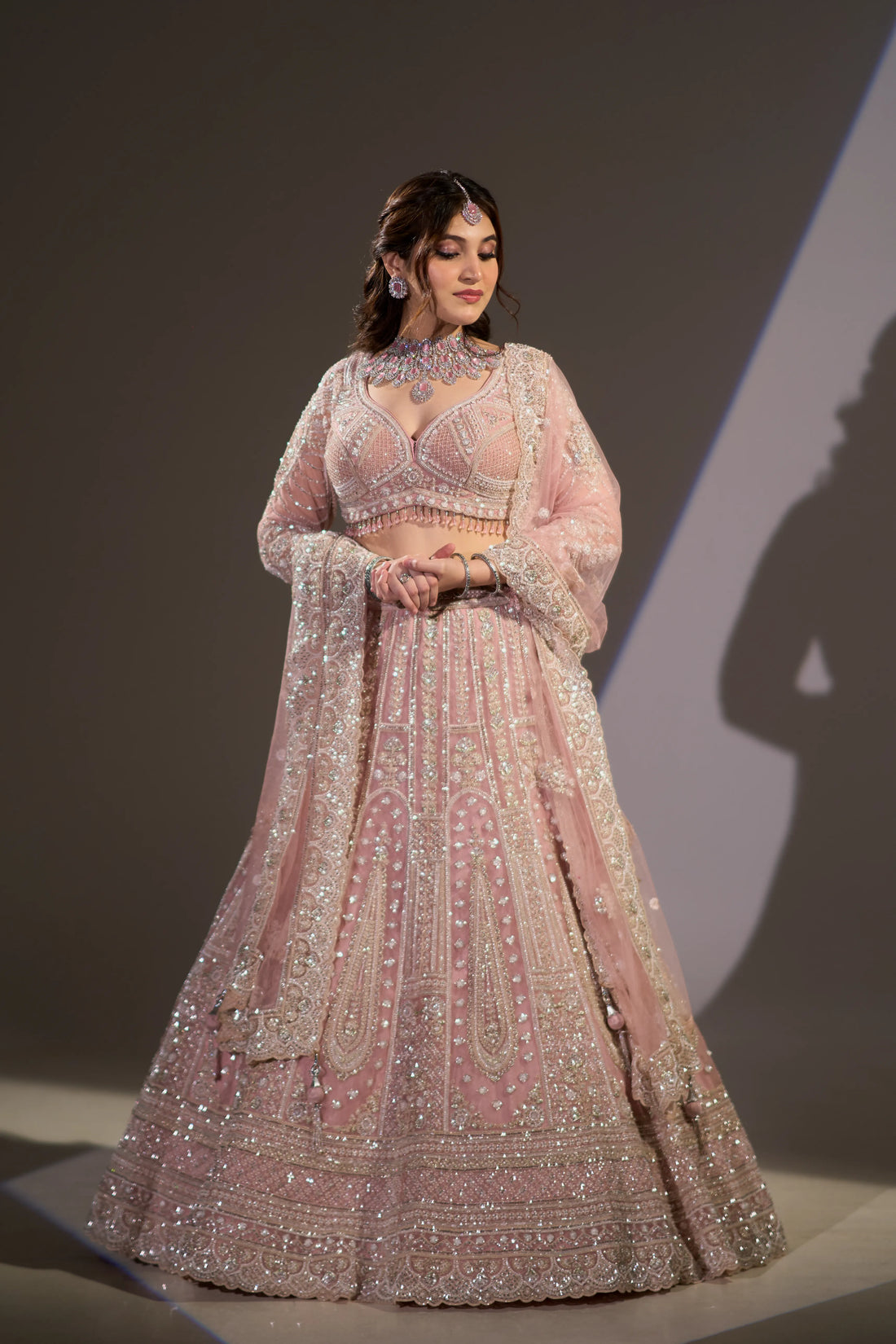 Pastel Pink Crystal & Silver Zari Embroidered Lehenga Set