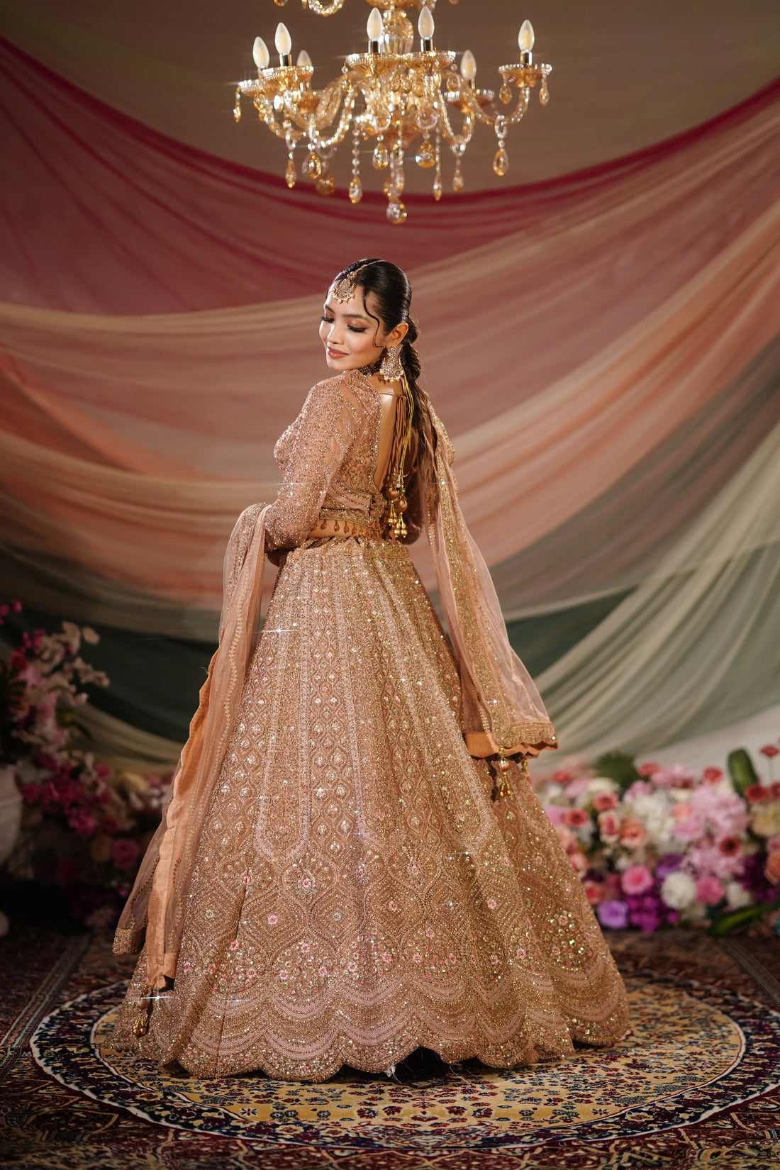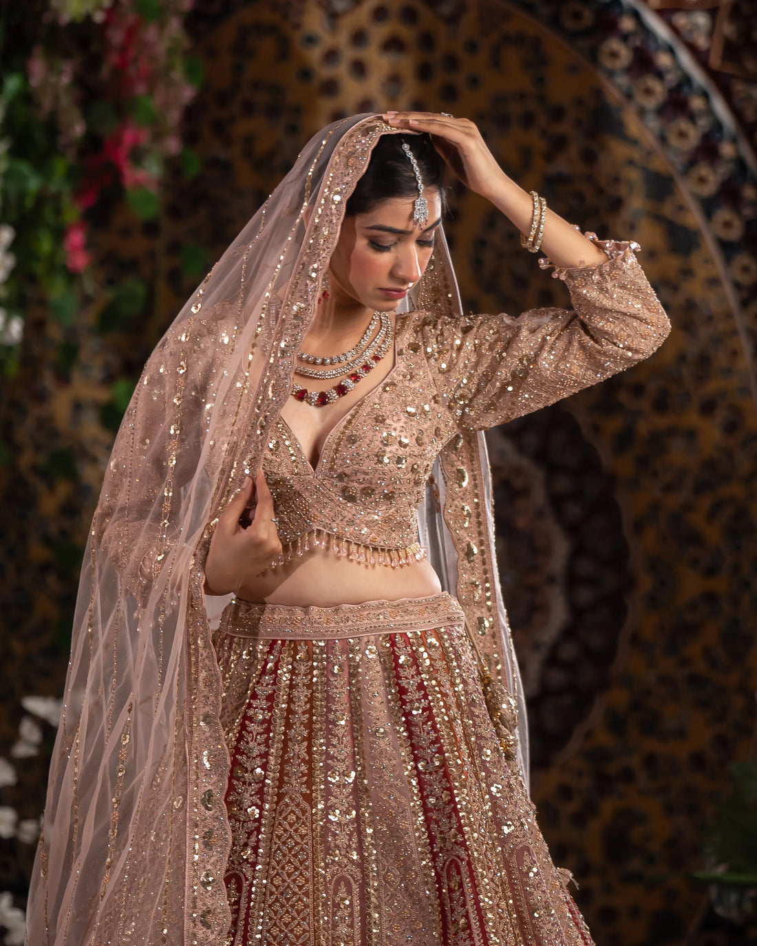 Antique Rose Gold & Deep Red Heavily Embellished Bridal Lehenga Set