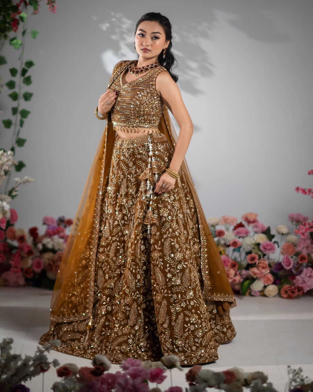 Antique Bronze Gold Zardosi & Sequin Embroidered Lehenga Set