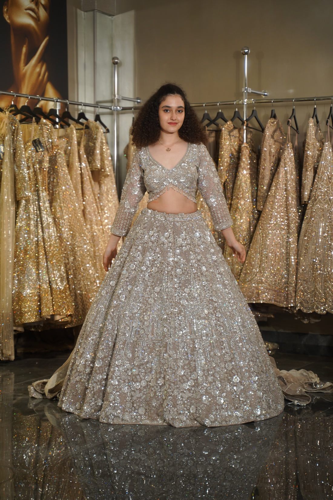 Platinum Silver Heavy Sequin & Crystal Embroidered Lehenga Set