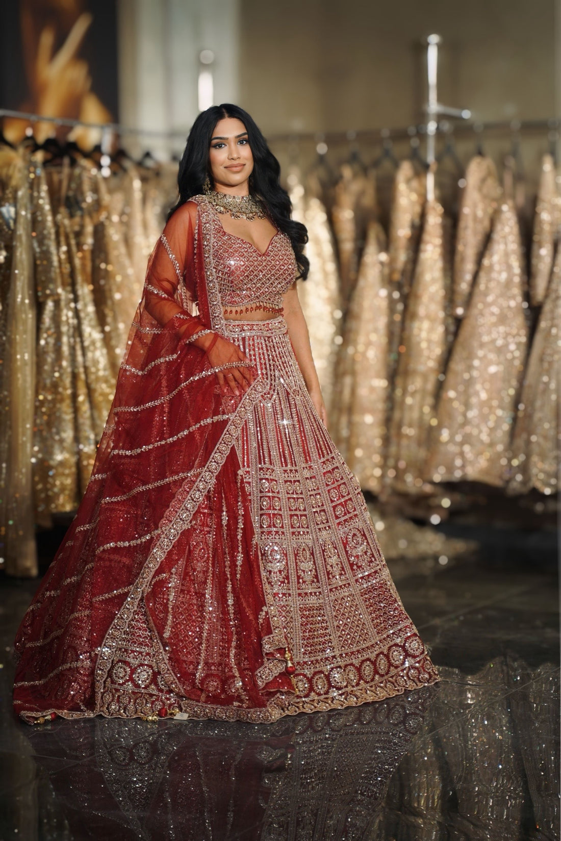 Deep Red Geometric Grid & Linear Sequin Embroidered Lehenga Set