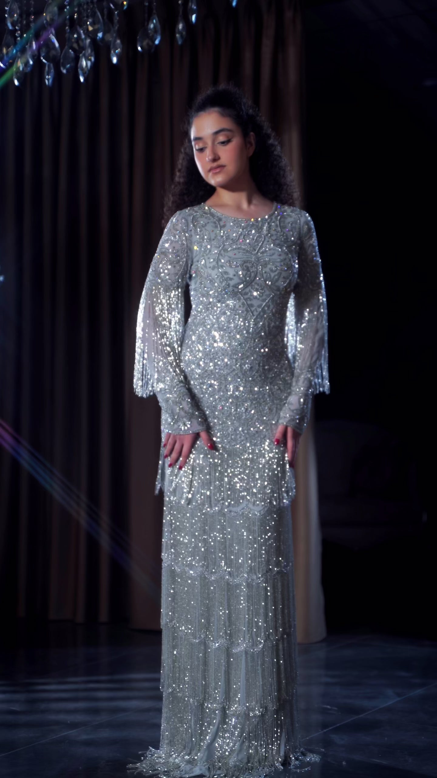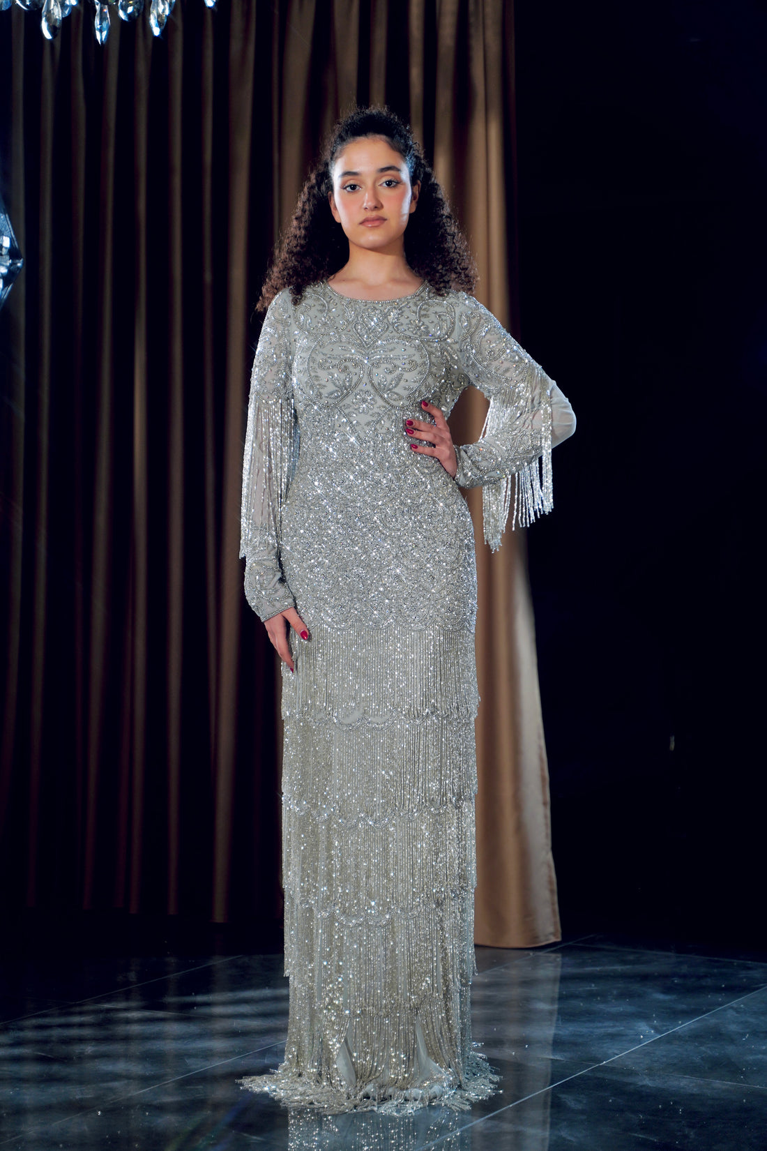 Silver Grey Tiered Beaded Fringe Evening Gown