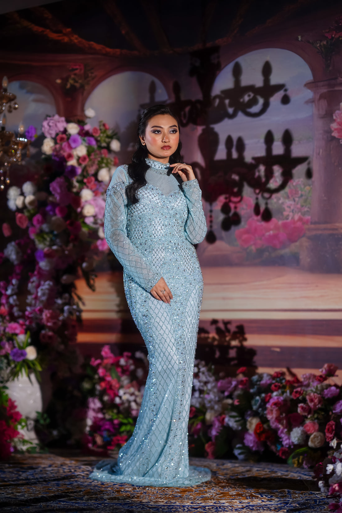 Ice Blue Geometric Lattice Embellished Evening Gown