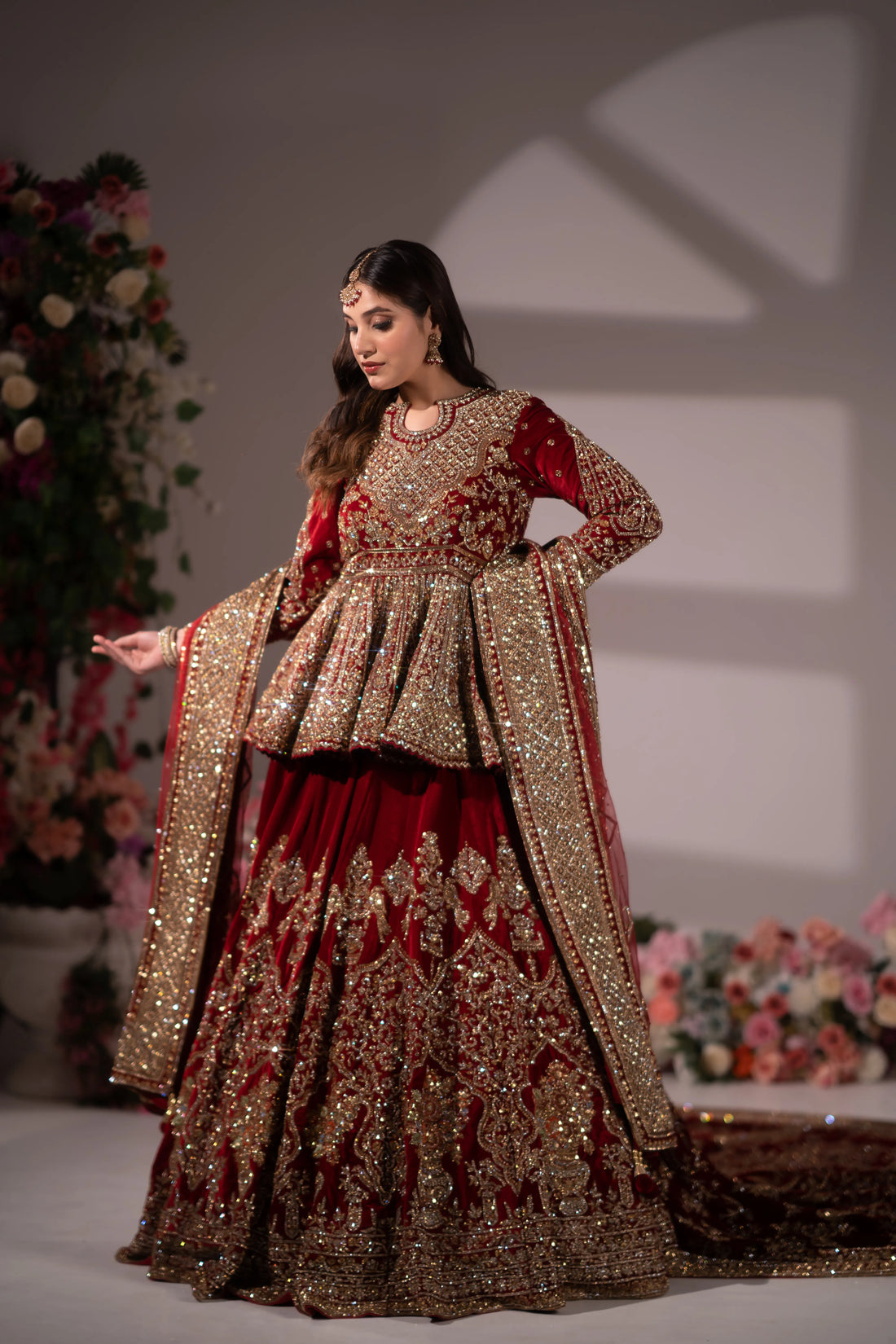 Deep Maroon Velvet Peplum Embroidered Bridal Lehenga