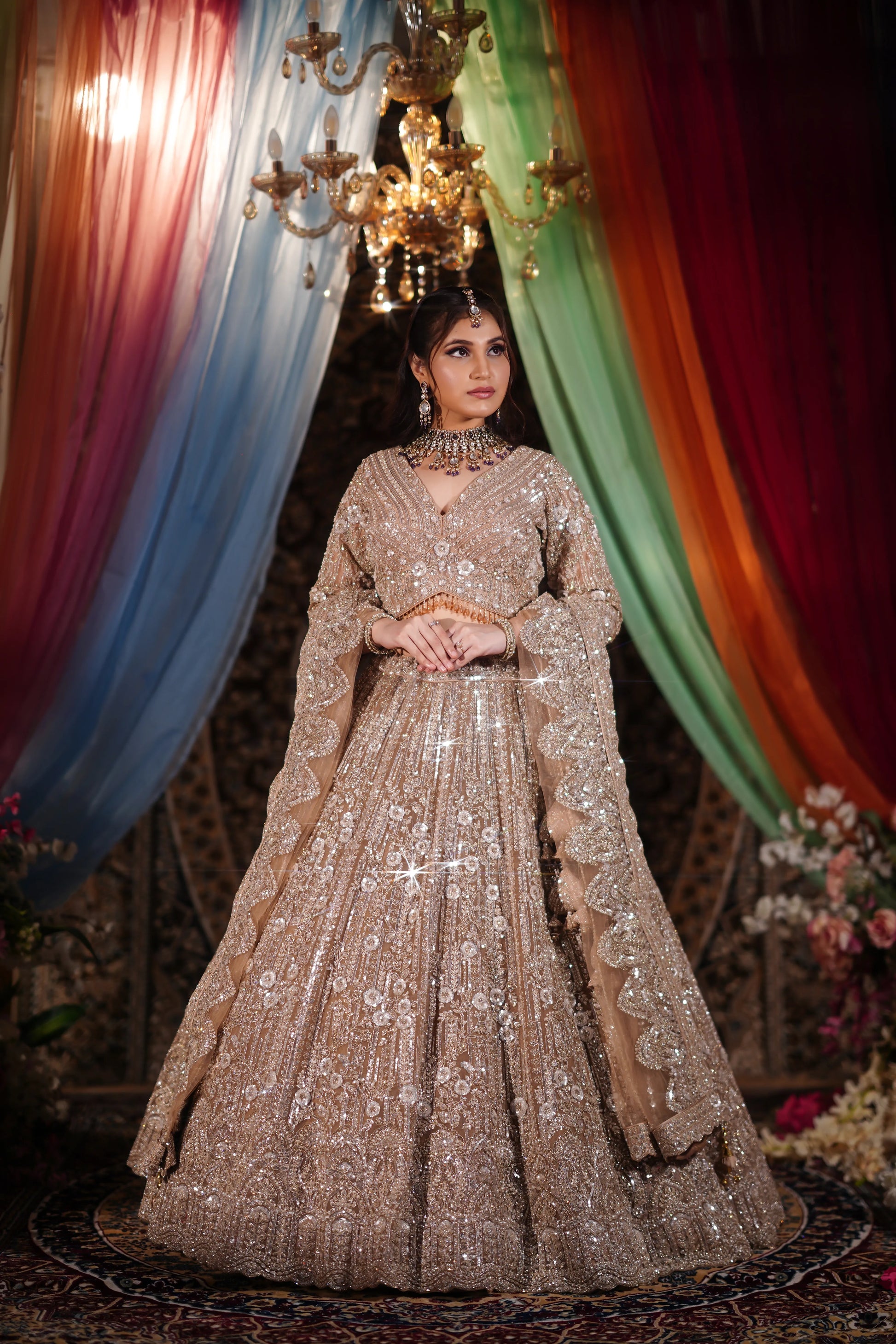 Color: Warm amber lehenga with ornate embellishment. Rich and dramatic.