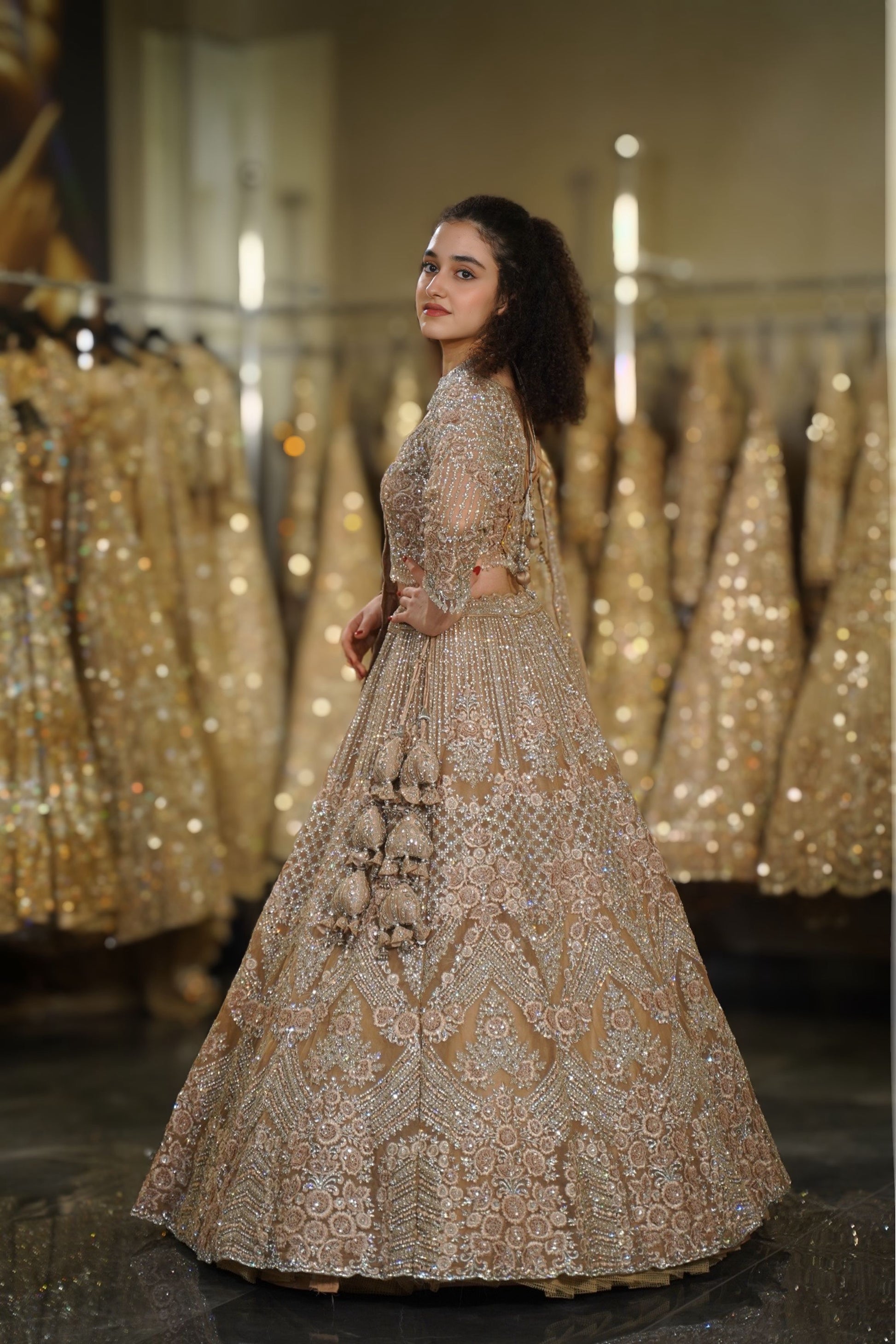 Champagne Beige Geometric Chevron & Floral Crystal Embroidered Lehenga Set