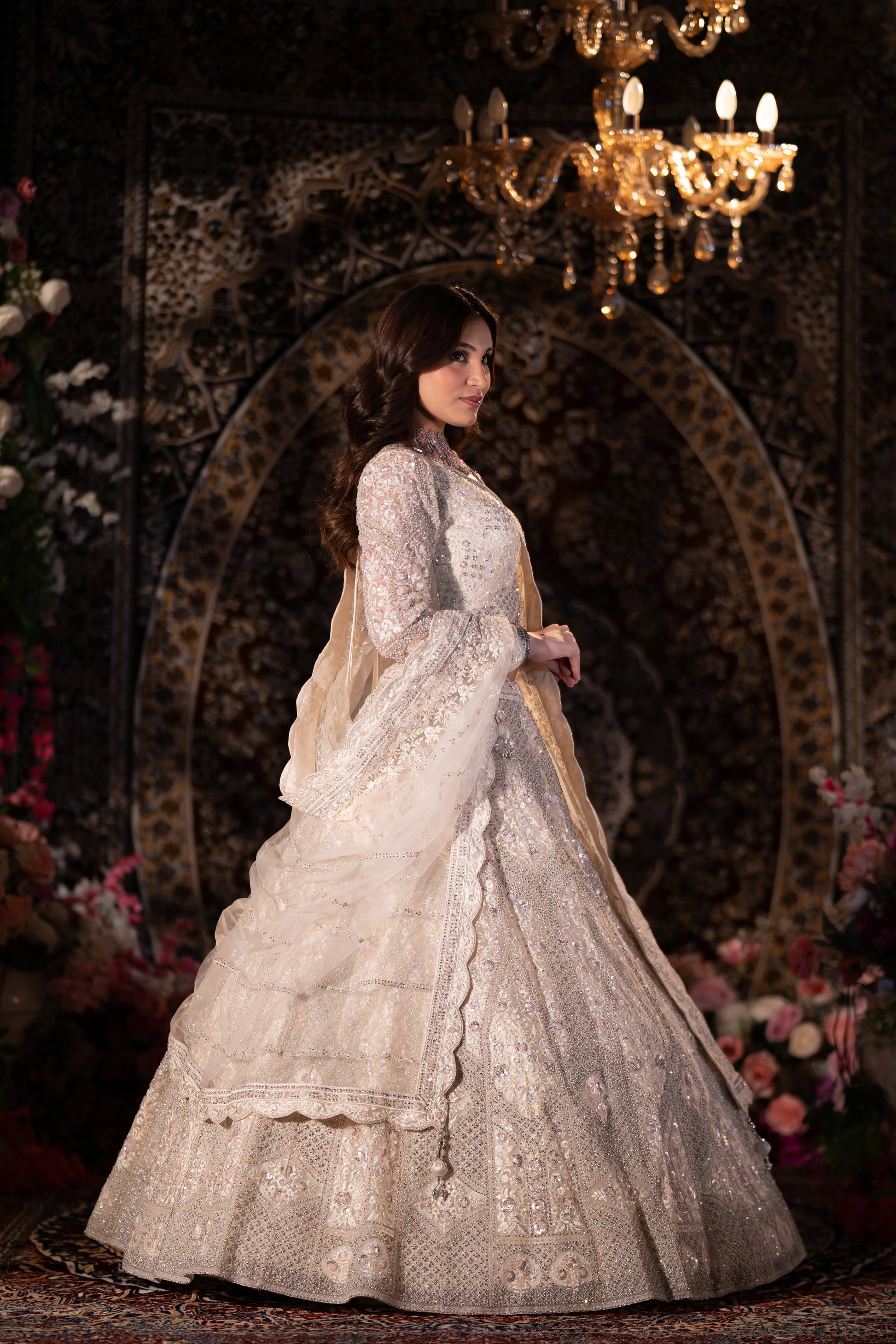 Radiate pure sophistication with this enchanting Ivory White Lehenga Set. This monochromatic masterpiece captures the essence of angelic beauty, blending traditional thread work with contemporary geometric patterns. Designed for the bride who prefers the timeless elegance of white, this ensemble offers a serene yet striking look, perfect for a day wedding, reception, or a grand engagement ceremony.