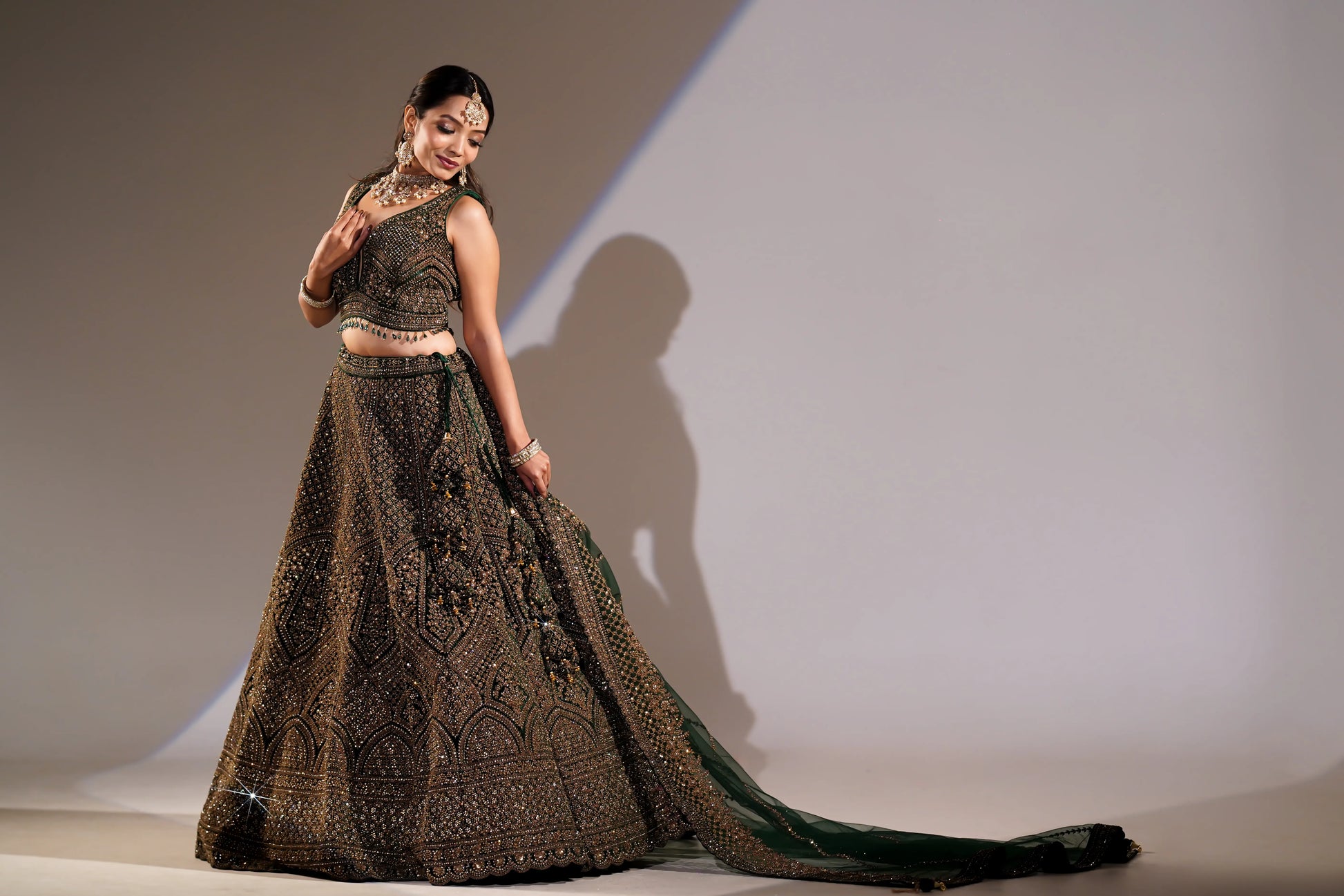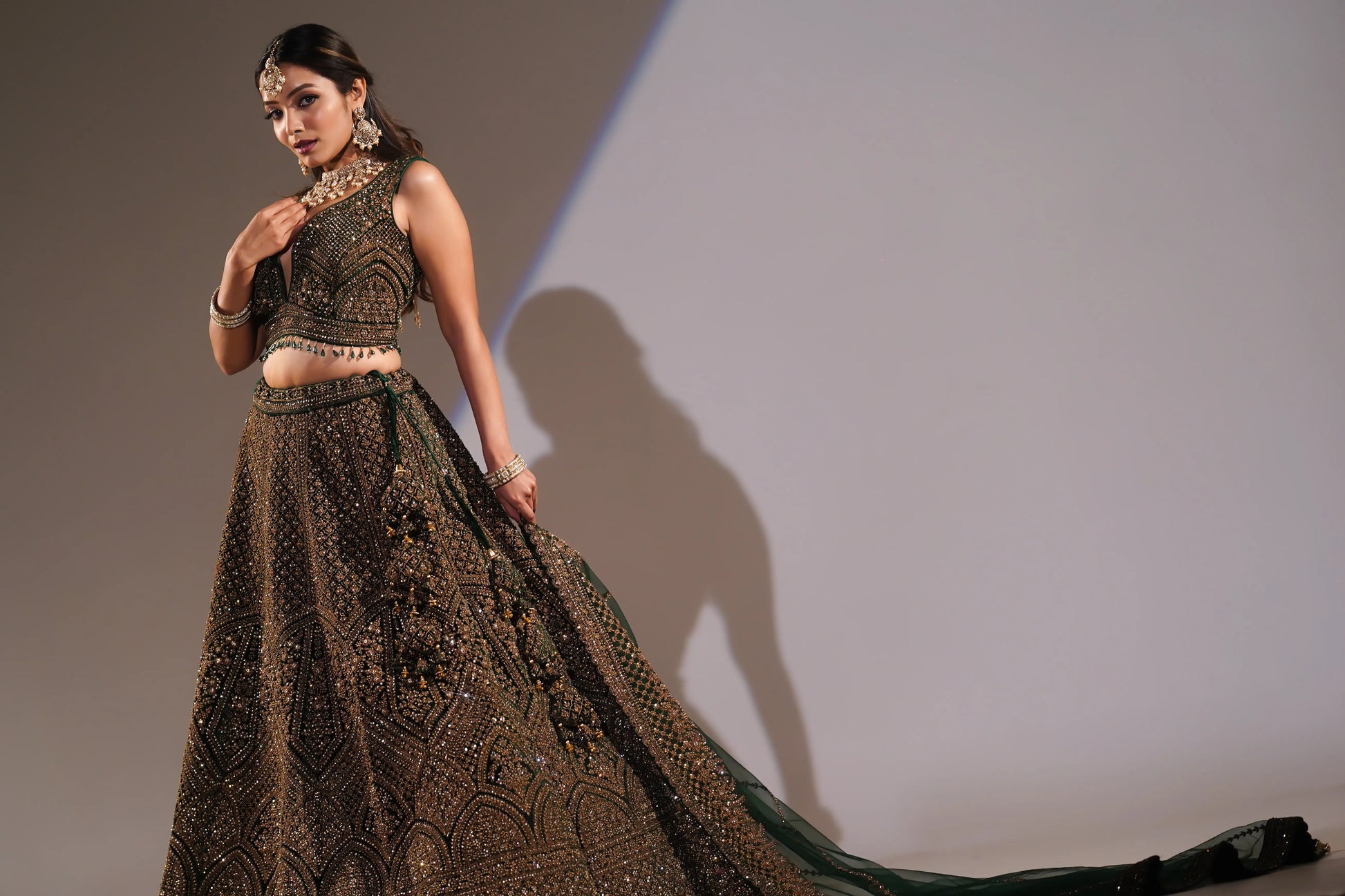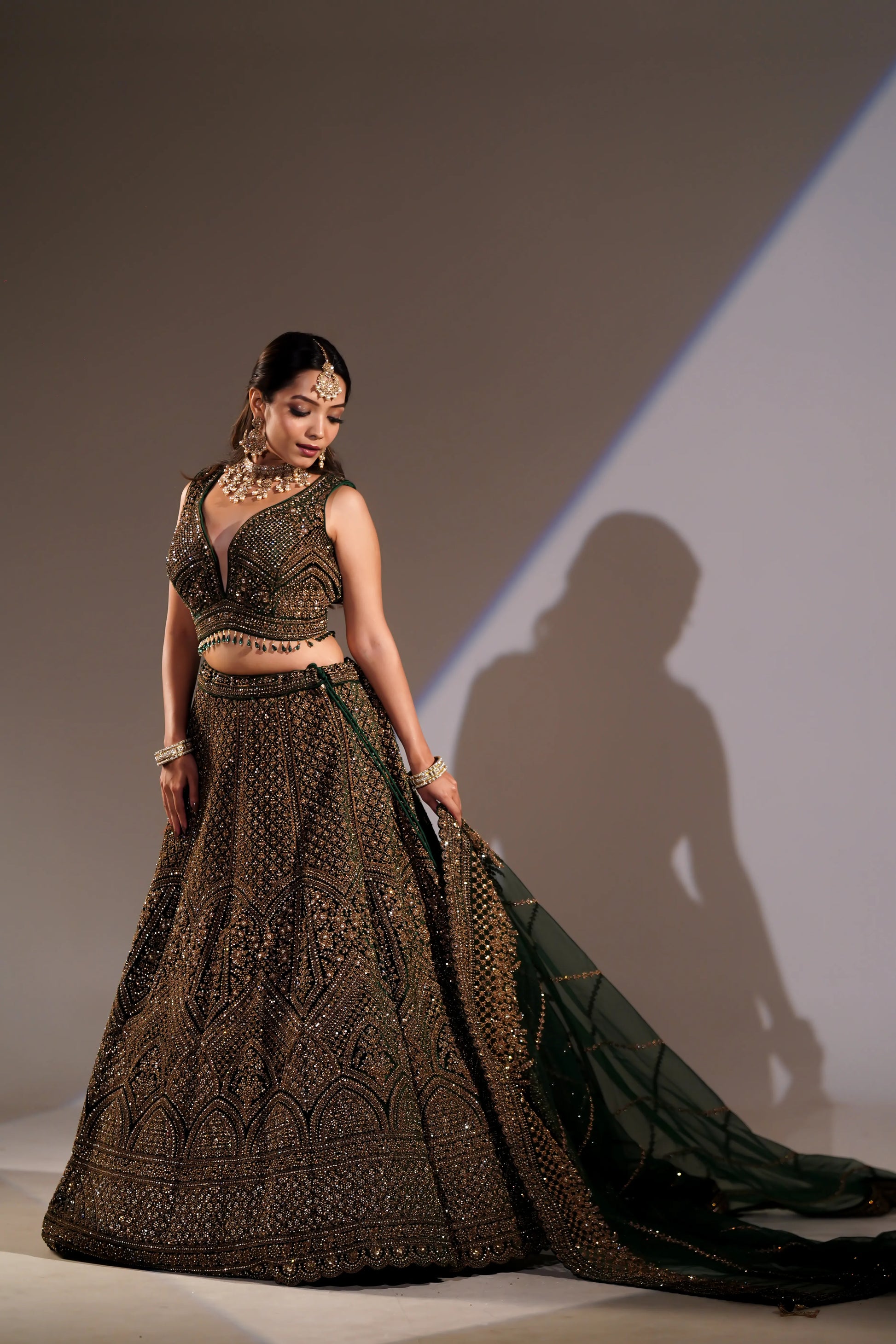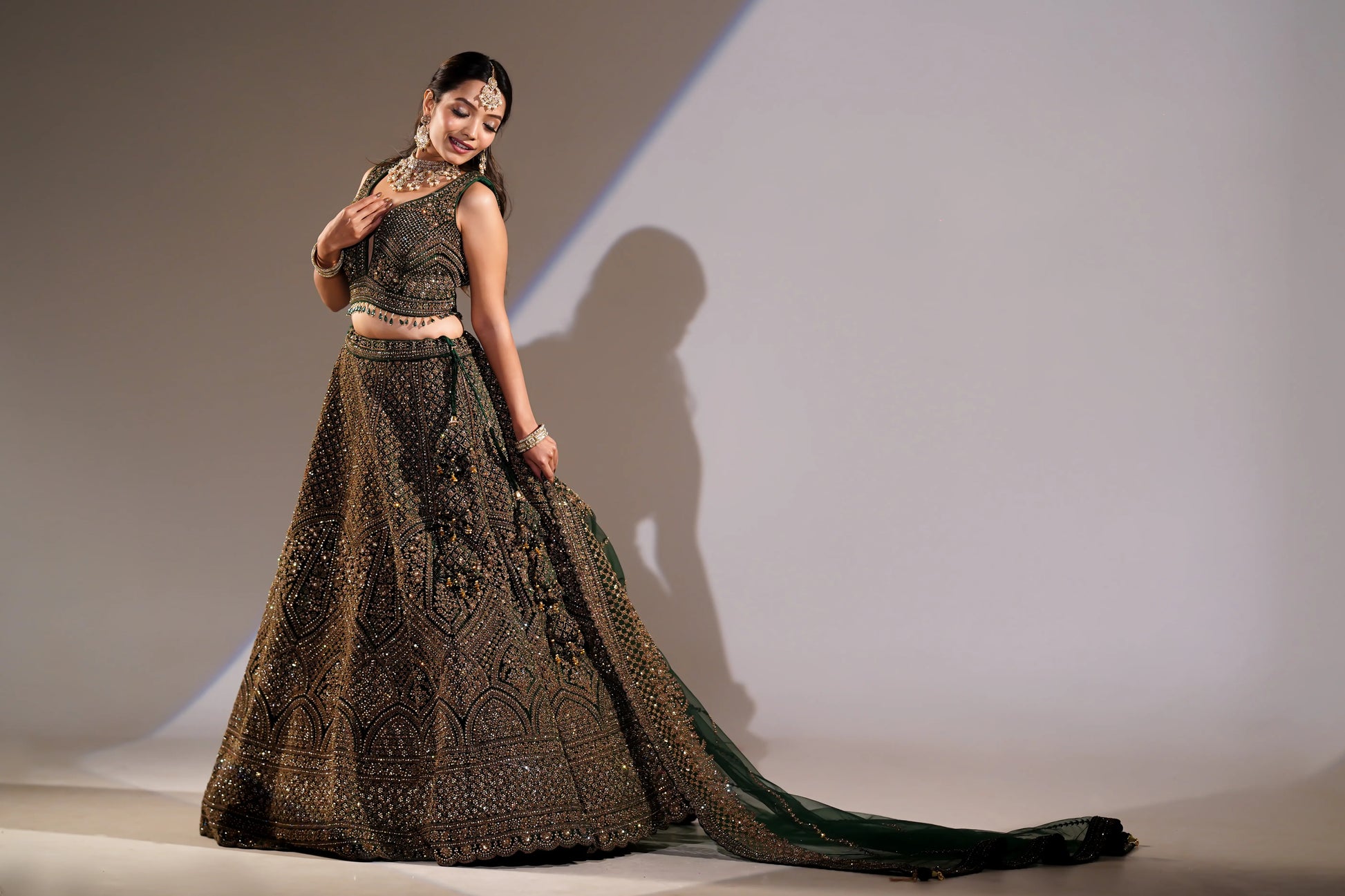 Exude royal authority with this breathtaking Emerald Green Lehenga Set. A color associated with luxury and royalty, this deep bottle green ensemble is elevated by heavy antique gold embroidery. It is designed for the bold bride who wants to blend traditional regal aesthetics with a modern, daring silhouette. Perfect for a winter wedding or a grand reception where you want to command the spotlight.