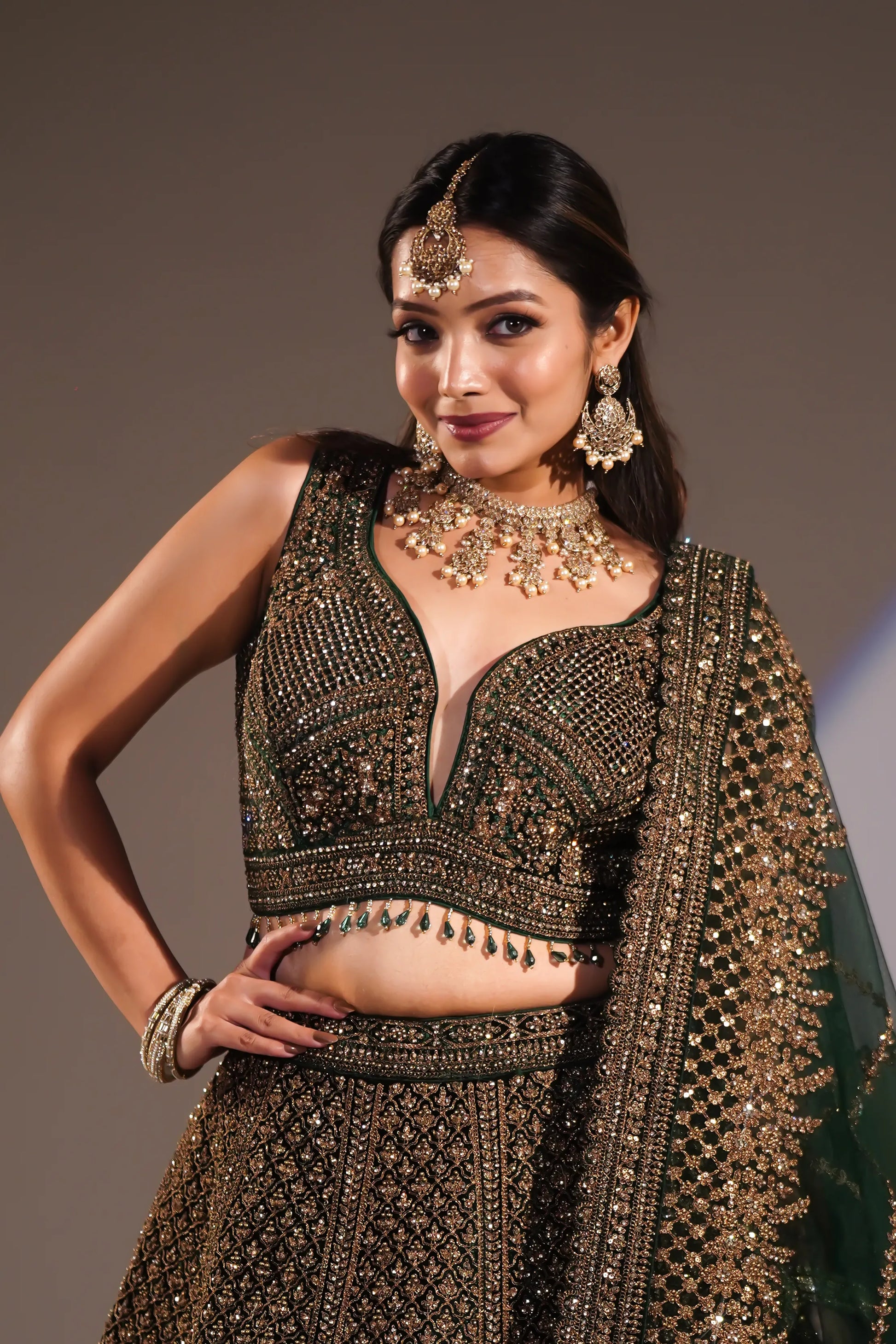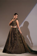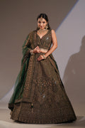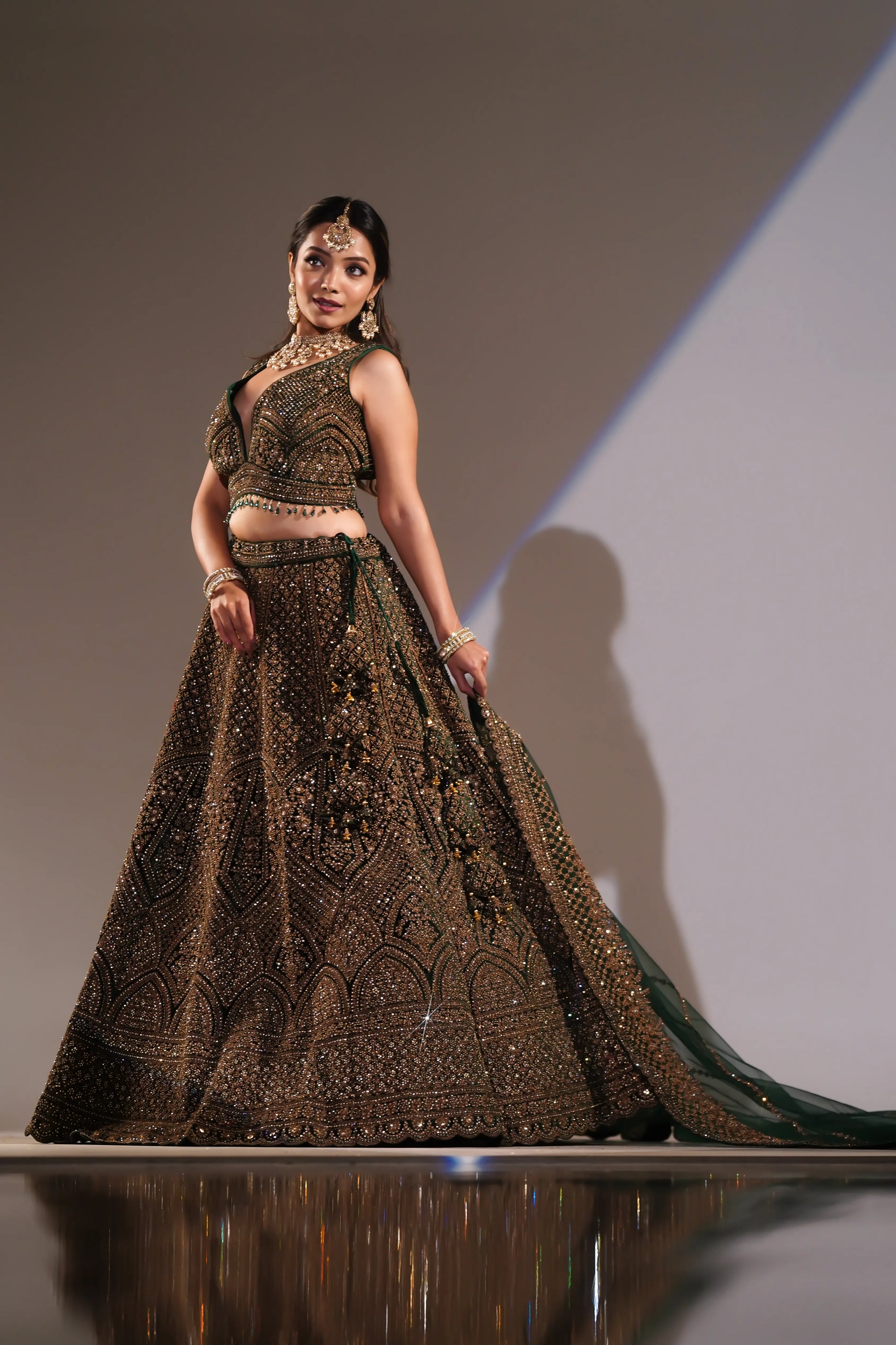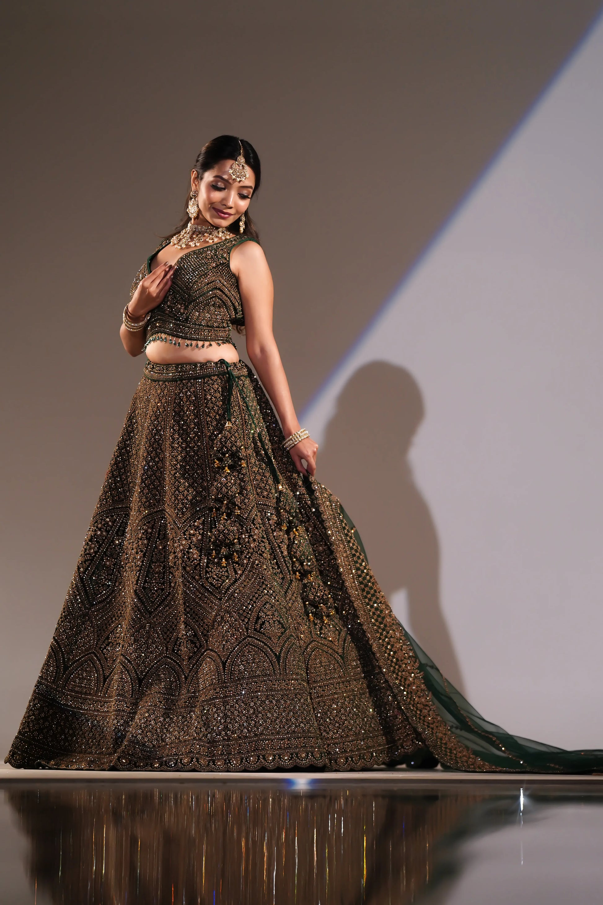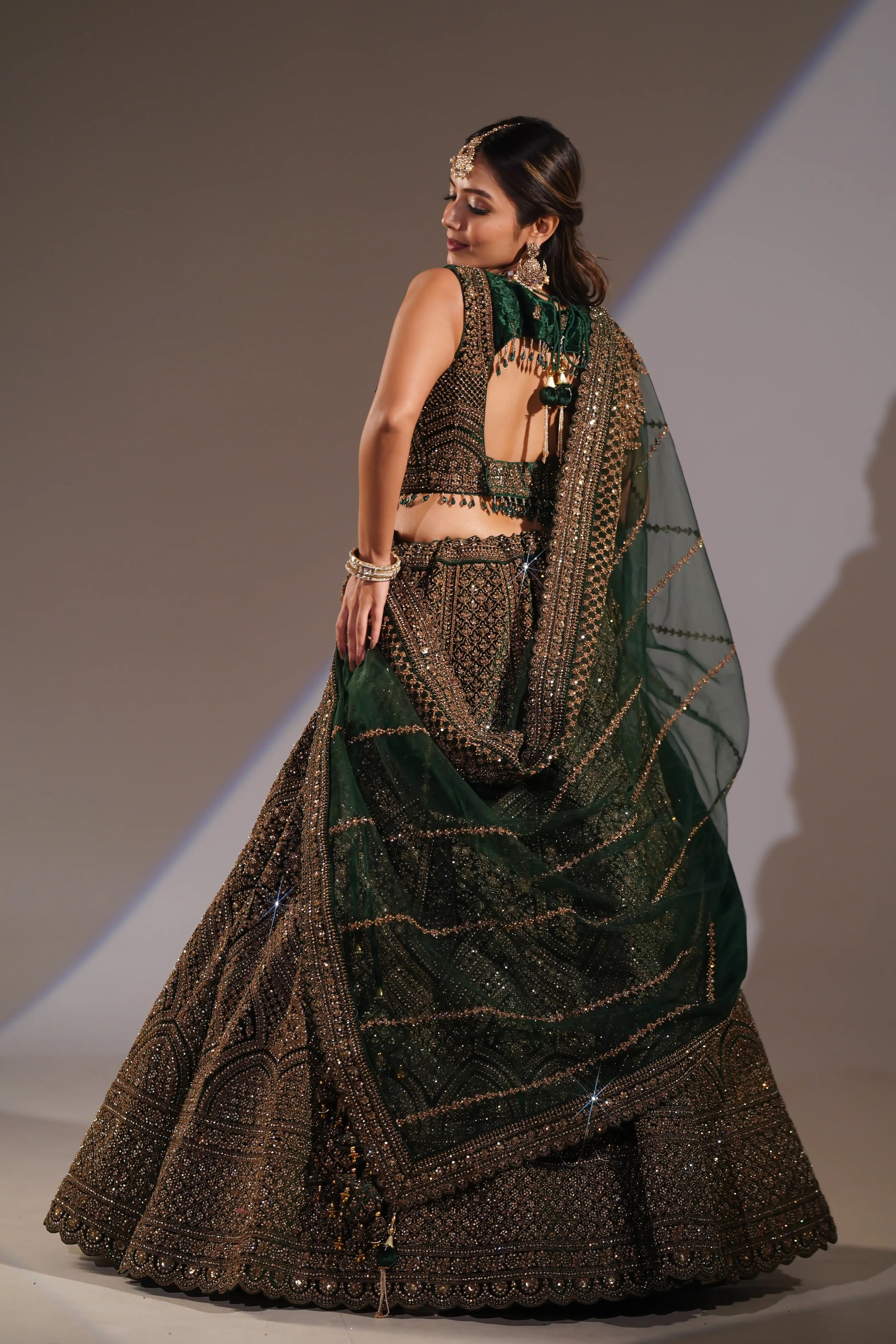 Exude royal authority with this breathtaking Emerald Green Lehenga Set. A color associated with luxury and royalty, this deep bottle green ensemble is elevated by heavy antique gold embroidery. It is designed for the bold bride who wants to blend traditional regal aesthetics with a modern, daring silhouette. Perfect for a winter wedding or a grand reception where you want to command the spotlight.