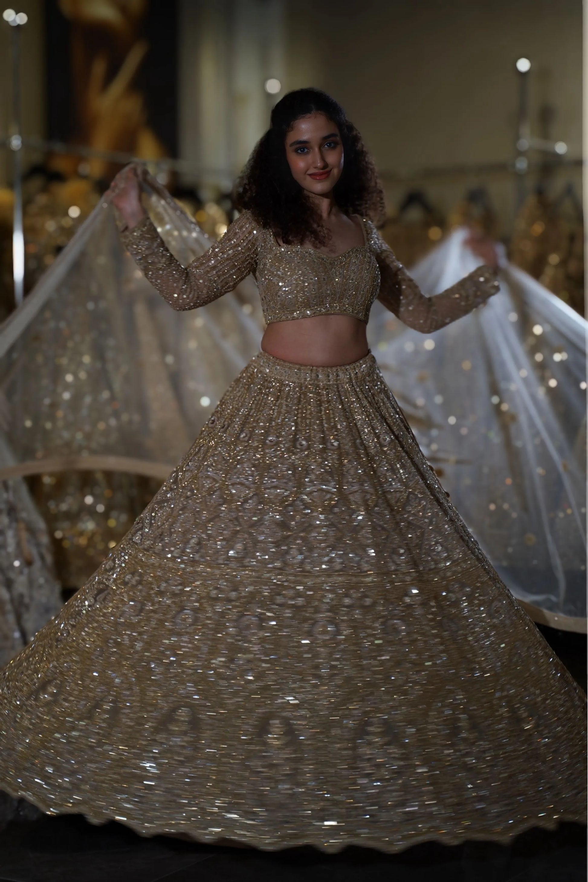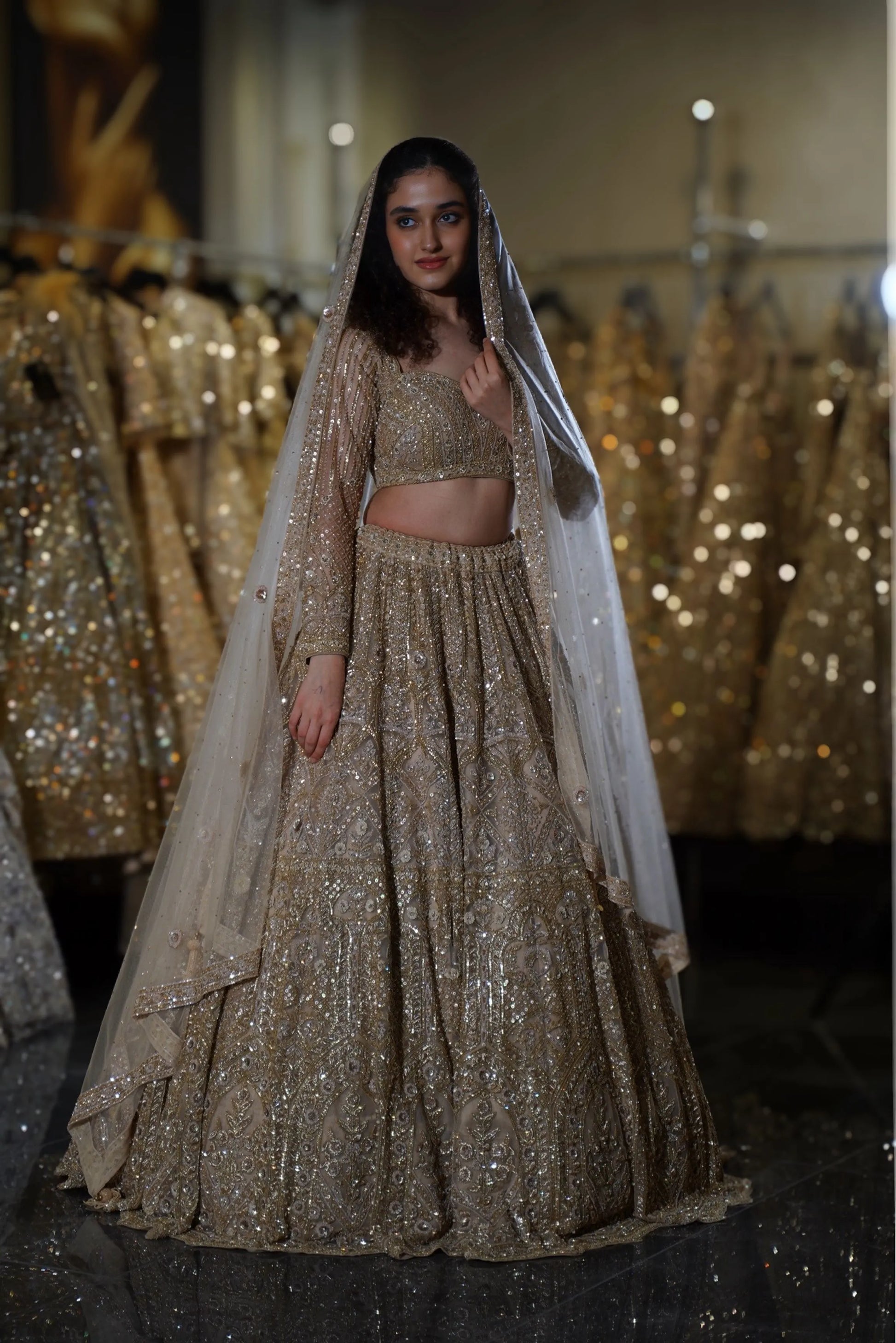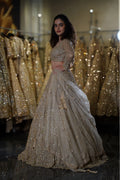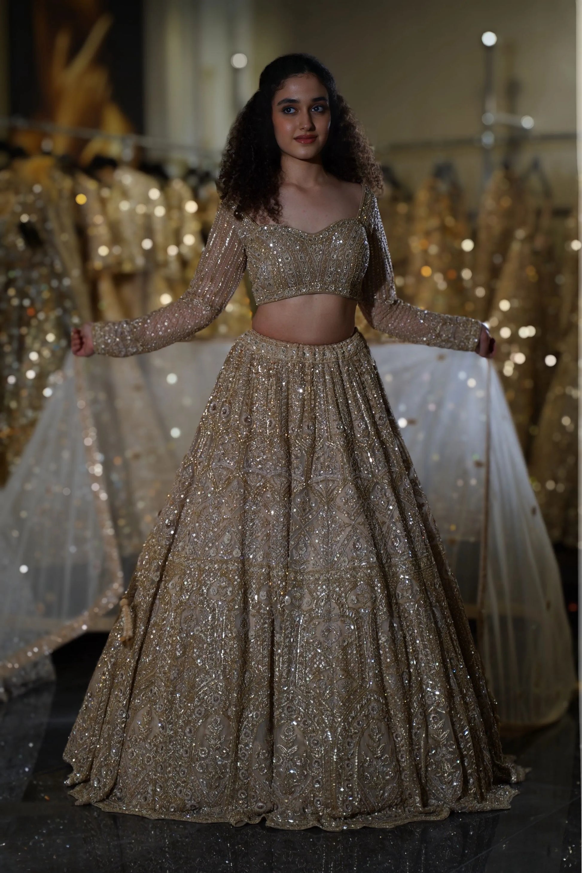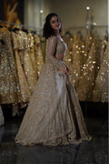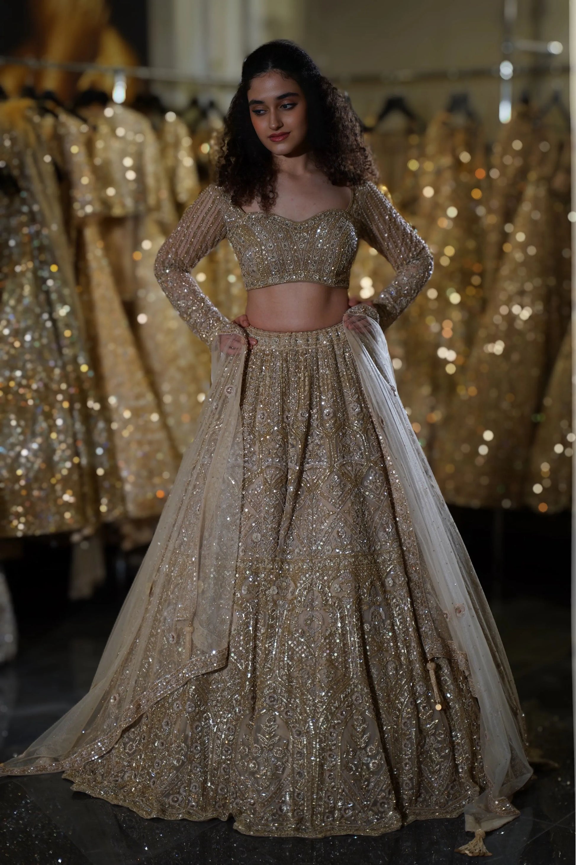 Step into your fairytale moment with this breathtaking Champagne Gold Lehenga. This opulent ensemble combines soft champagne tones with heavy gold sequin work, creating a look that radiates warmth and luxury. Perfect for the bride who desires to shine with sophisticated glamour while maintaining an elegant, romantic aesthetic at her wedding celebrations.