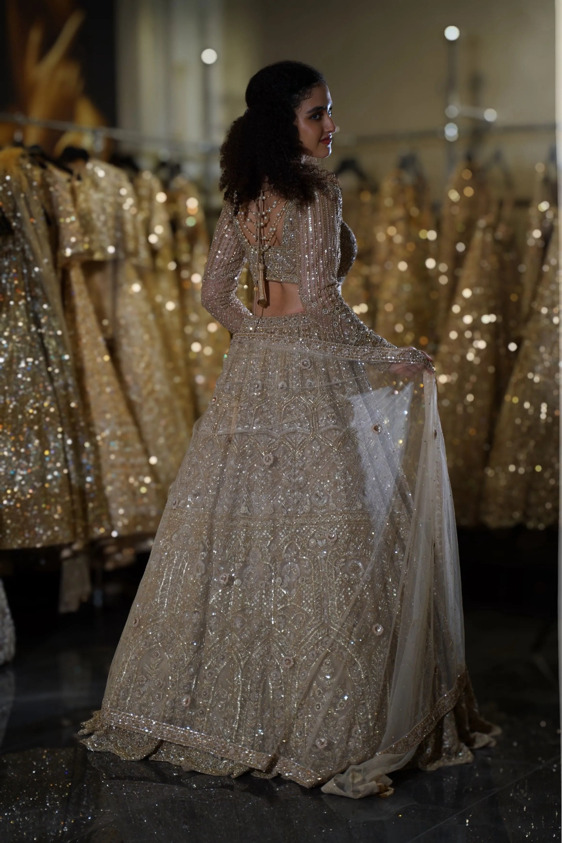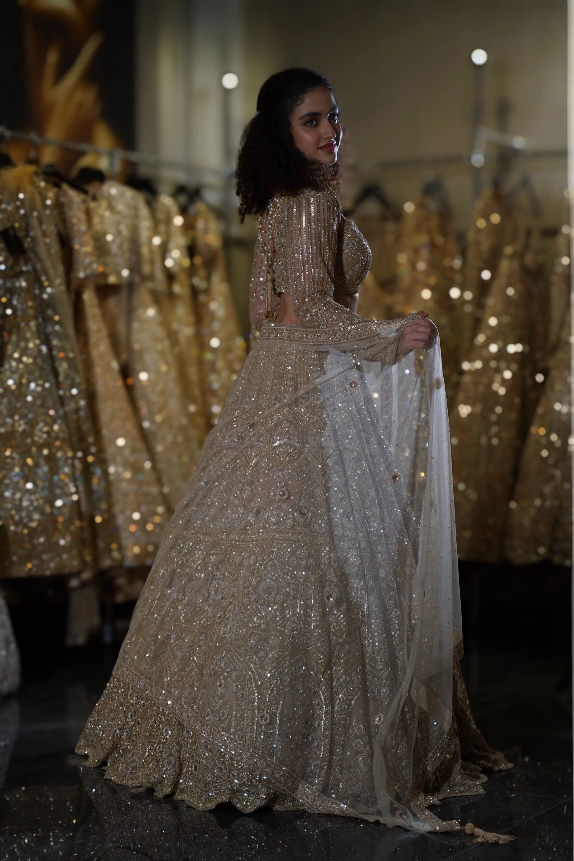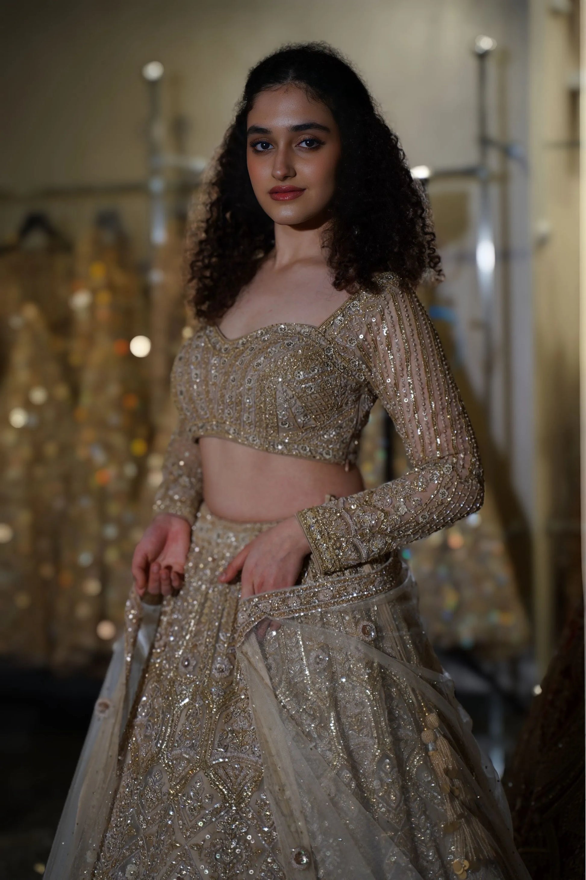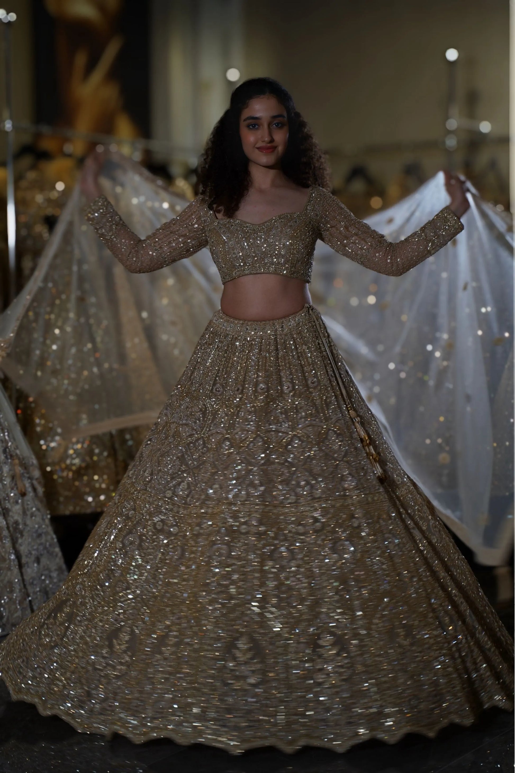Step into your fairytale moment with this breathtaking Champagne Gold Lehenga. This opulent ensemble combines soft champagne tones with heavy gold sequin work, creating a look that radiates warmth and luxury. Perfect for the bride who desires to shine with sophisticated glamour while maintaining an elegant, romantic aesthetic at her wedding celebrations.