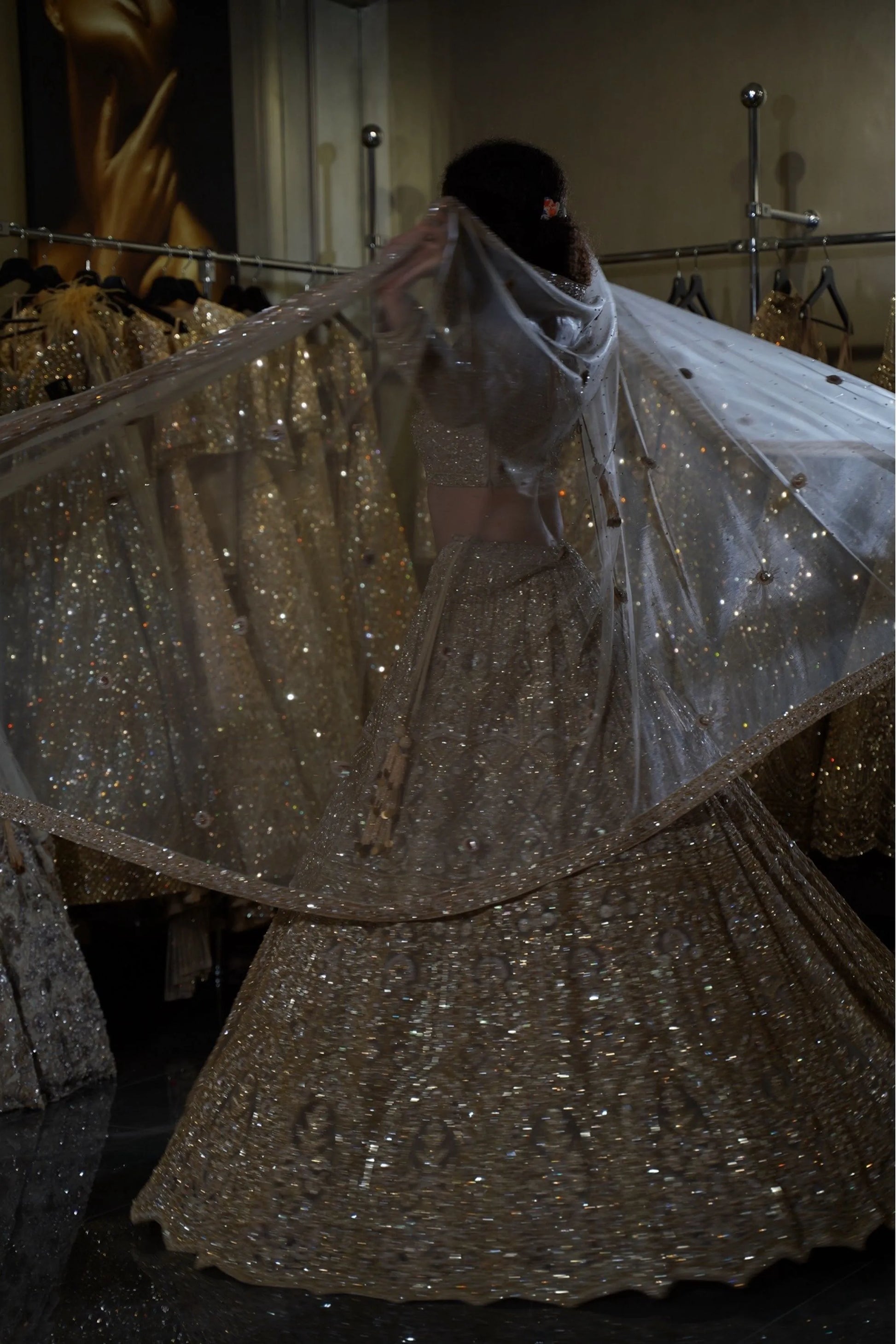 - Vertical Sequin Lines: Strategic linear patterns on the lehenga creating an elongating effect