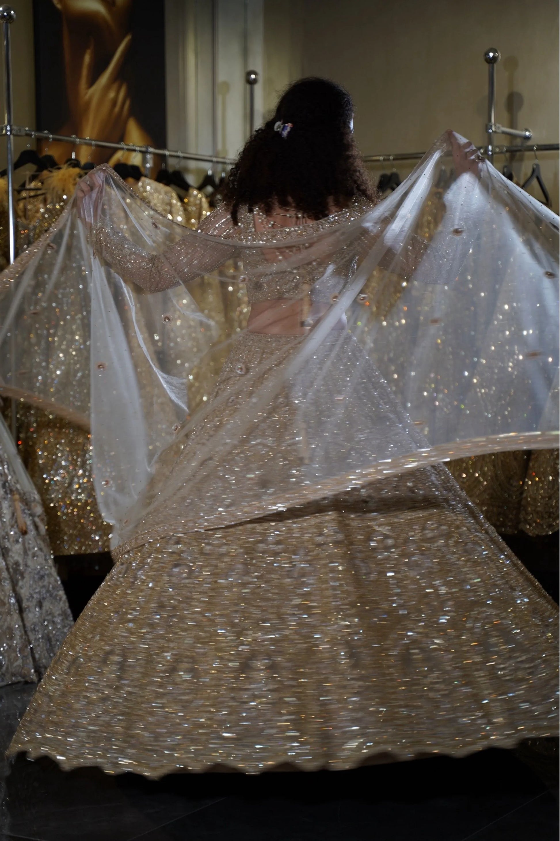 | Lehenga (Skirt) | Full A-line lehenga with heavy gold sequin embroidery, vertical pattern detailing, and elaborate border |