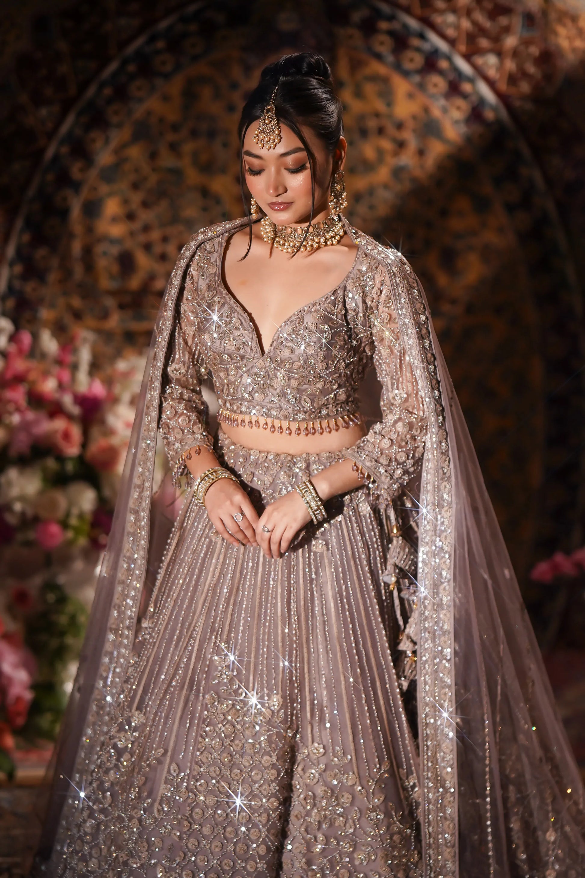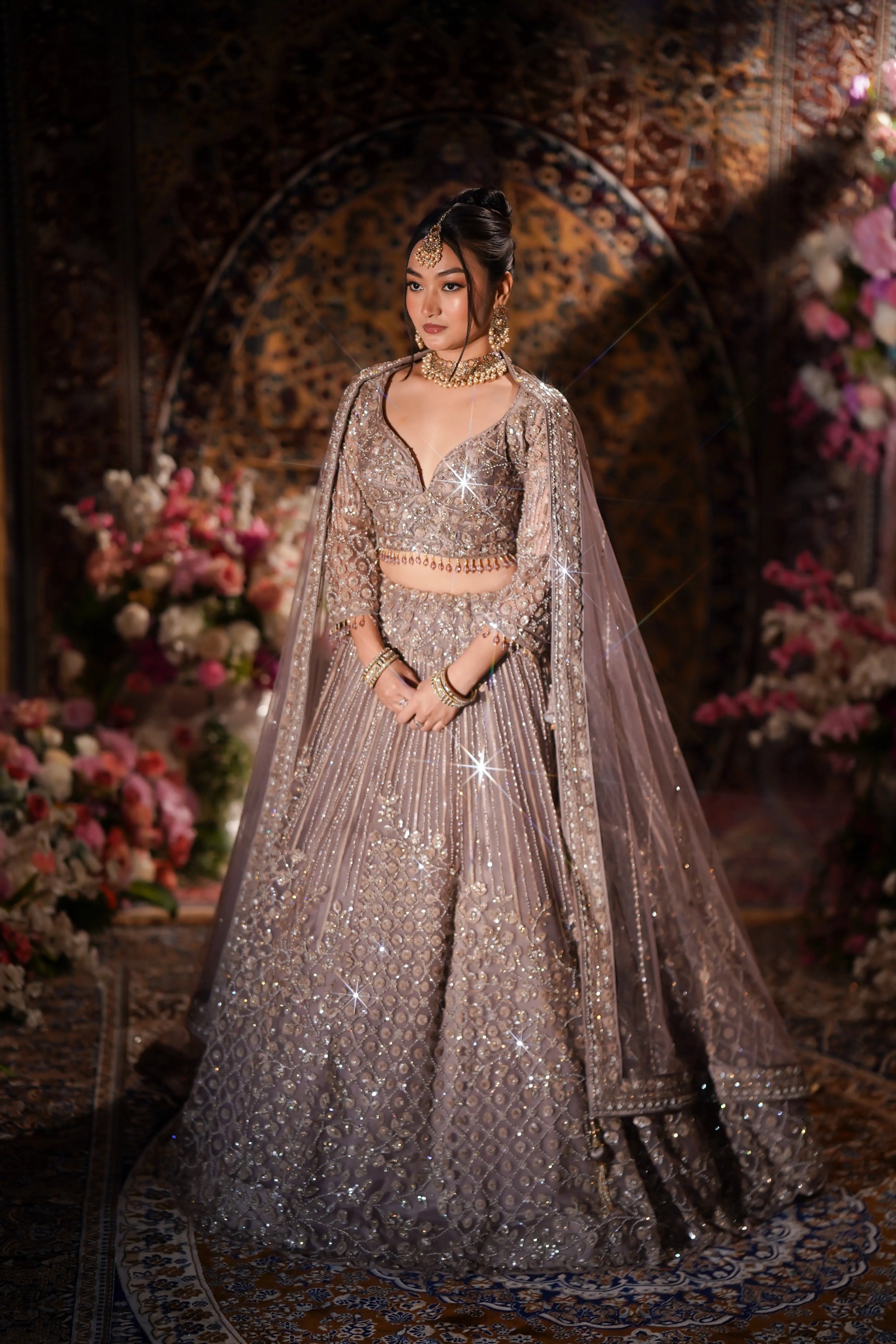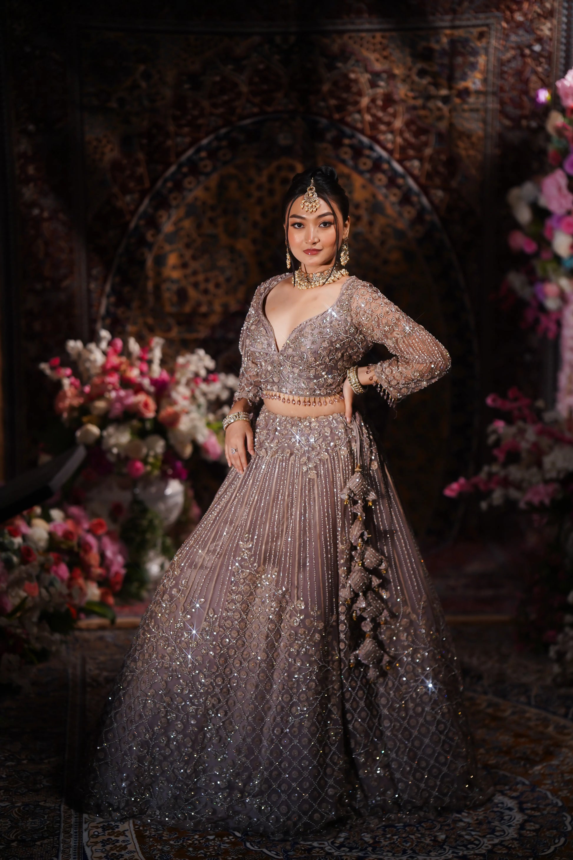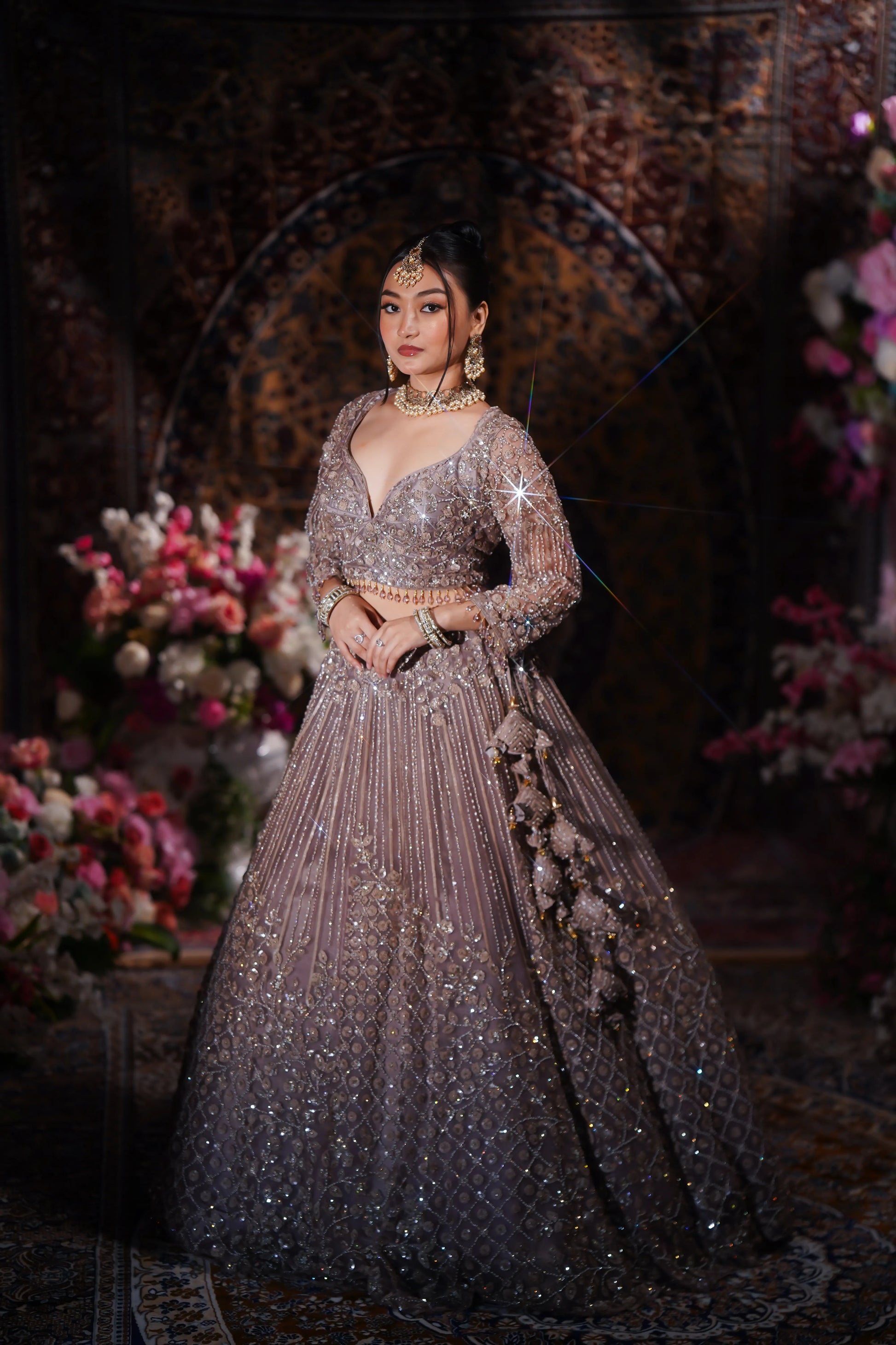 Radiate ethereal beauty with this breathtaking Dusty Mauve Lehenga Set. This majestic ensemble features intricate crystal and sequin embroidery that mimics a starry night, combining understated hues with high-impact shine. Perfect for the sophisticated bride or bridesmaid looking to make a grand entrance at receptions and engagement ceremonies.
