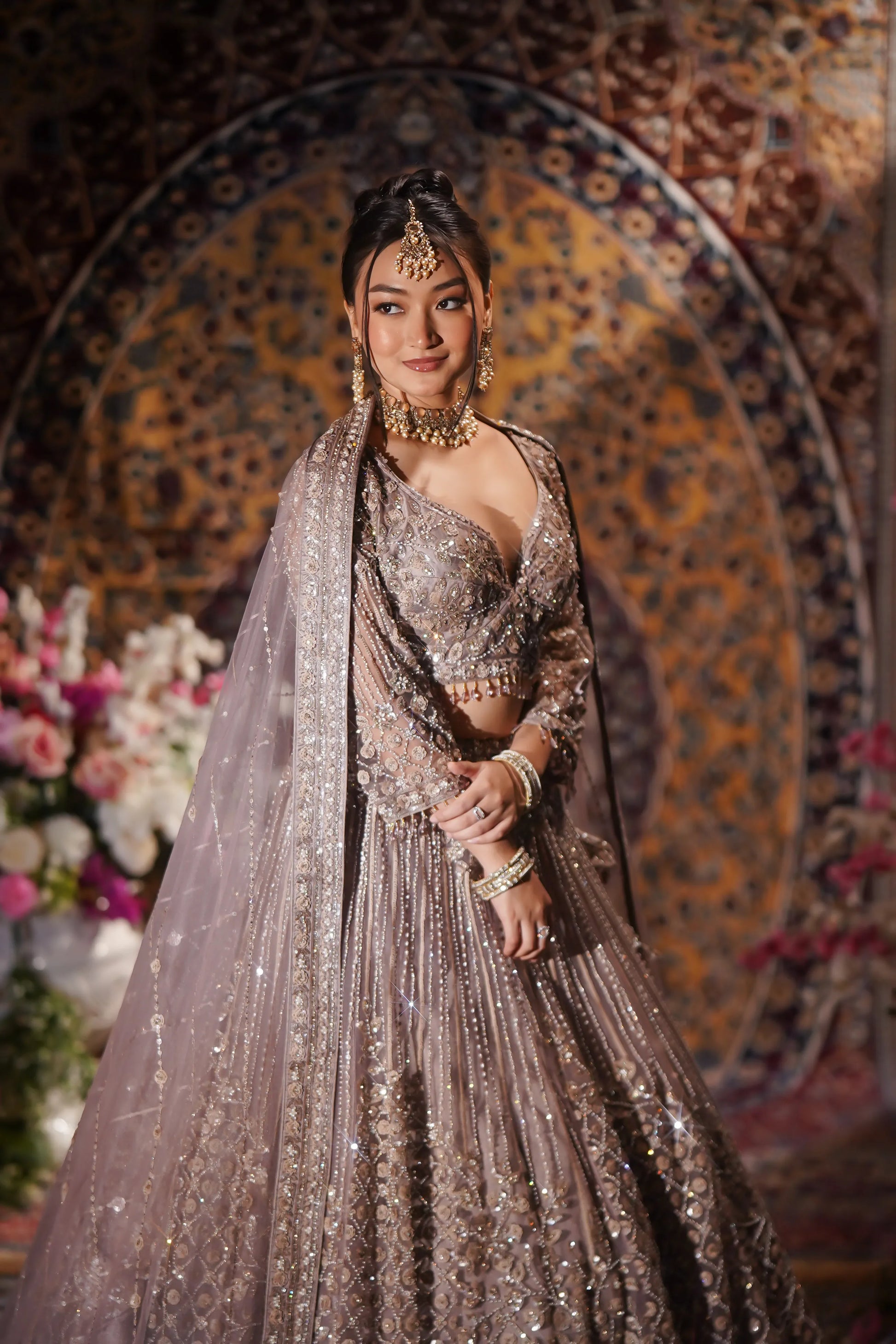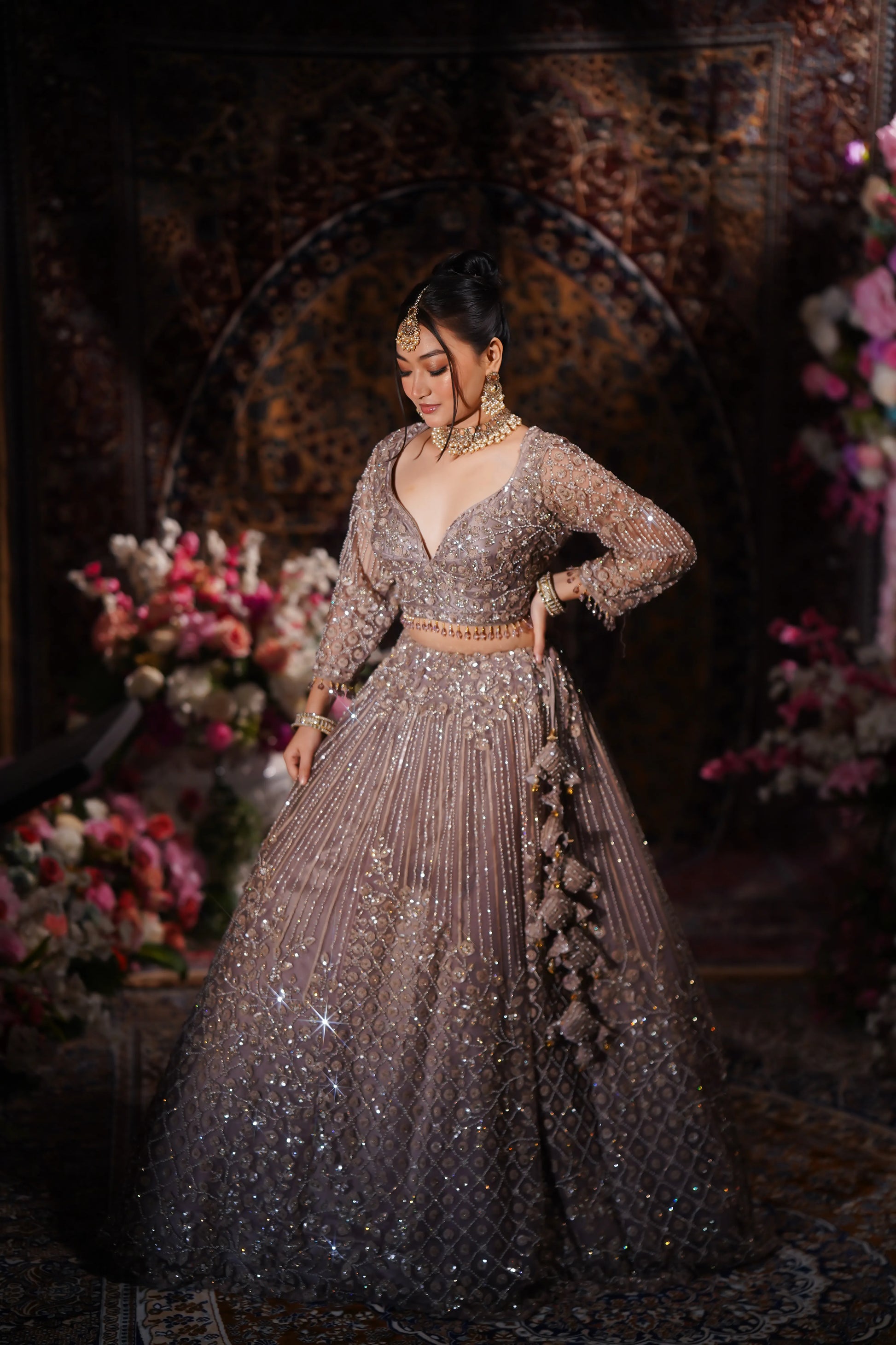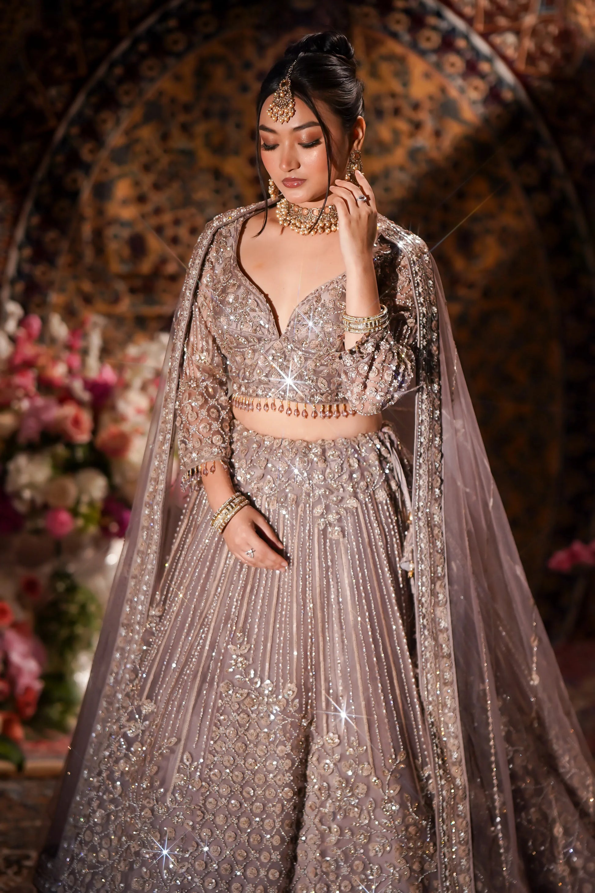 Radiate ethereal beauty with this breathtaking Dusty Mauve Lehenga Set. This majestic ensemble features intricate crystal and sequin embroidery that mimics a starry night, combining understated hues with high-impact shine. Perfect for the sophisticated bride or bridesmaid looking to make a grand entrance at receptions and engagement ceremonies.