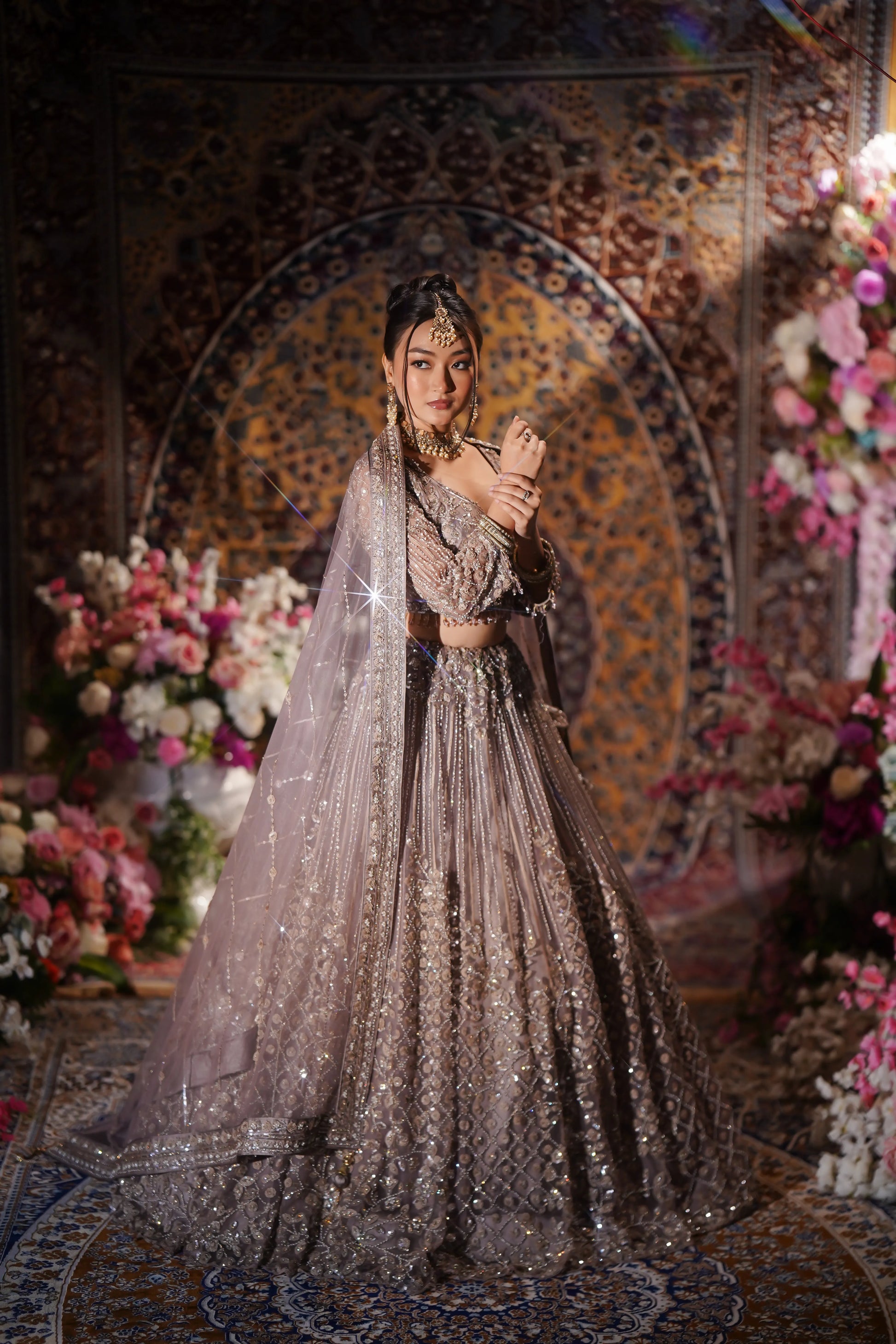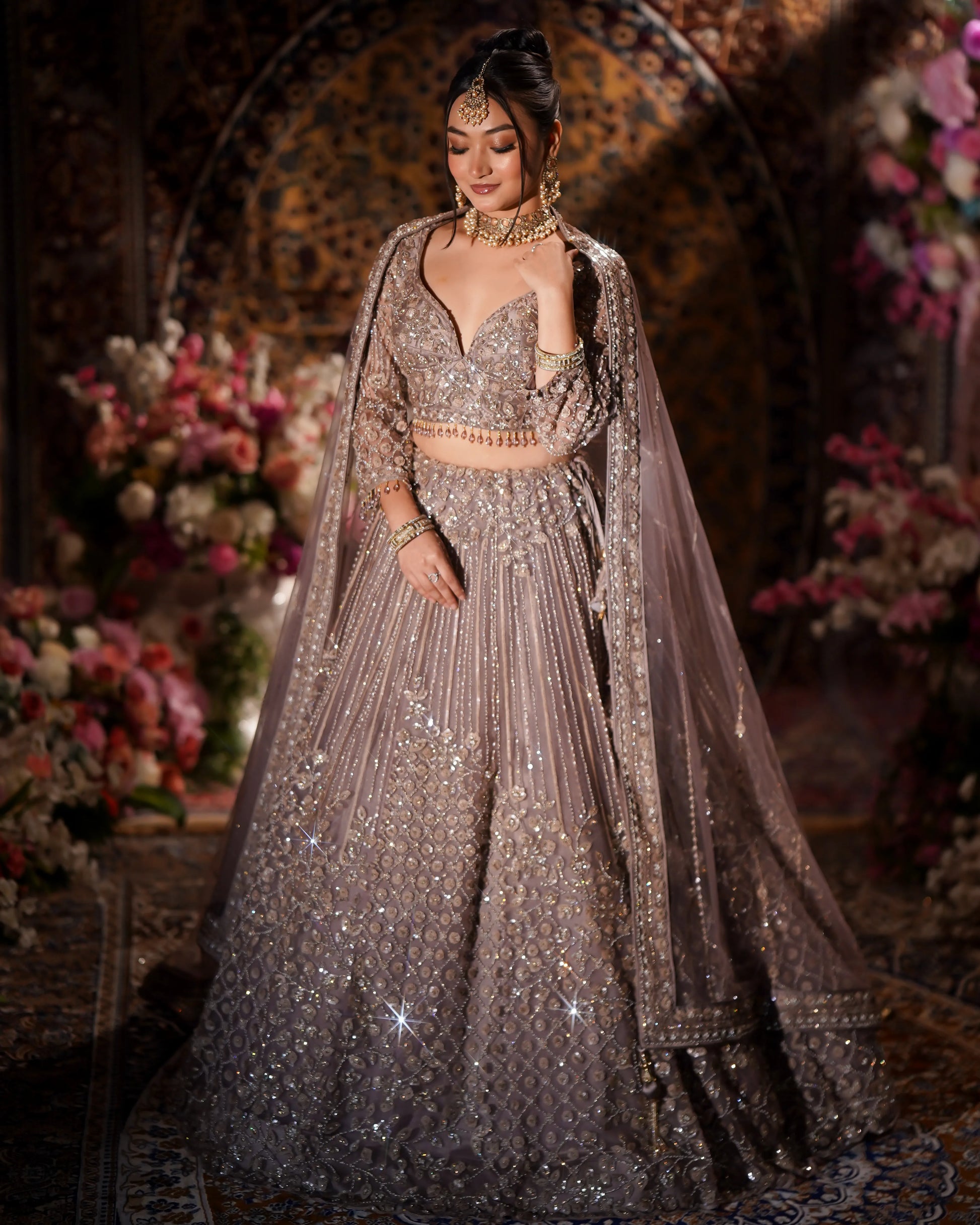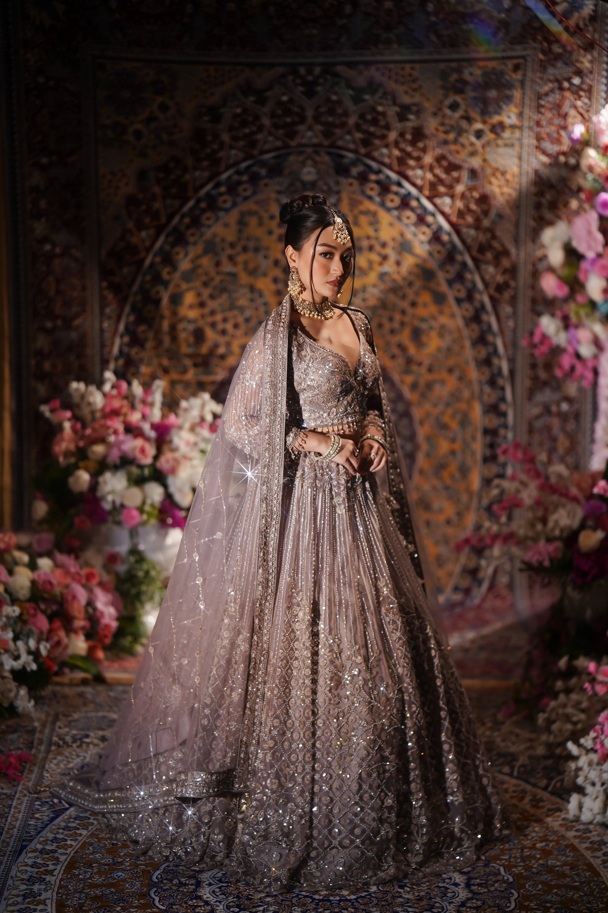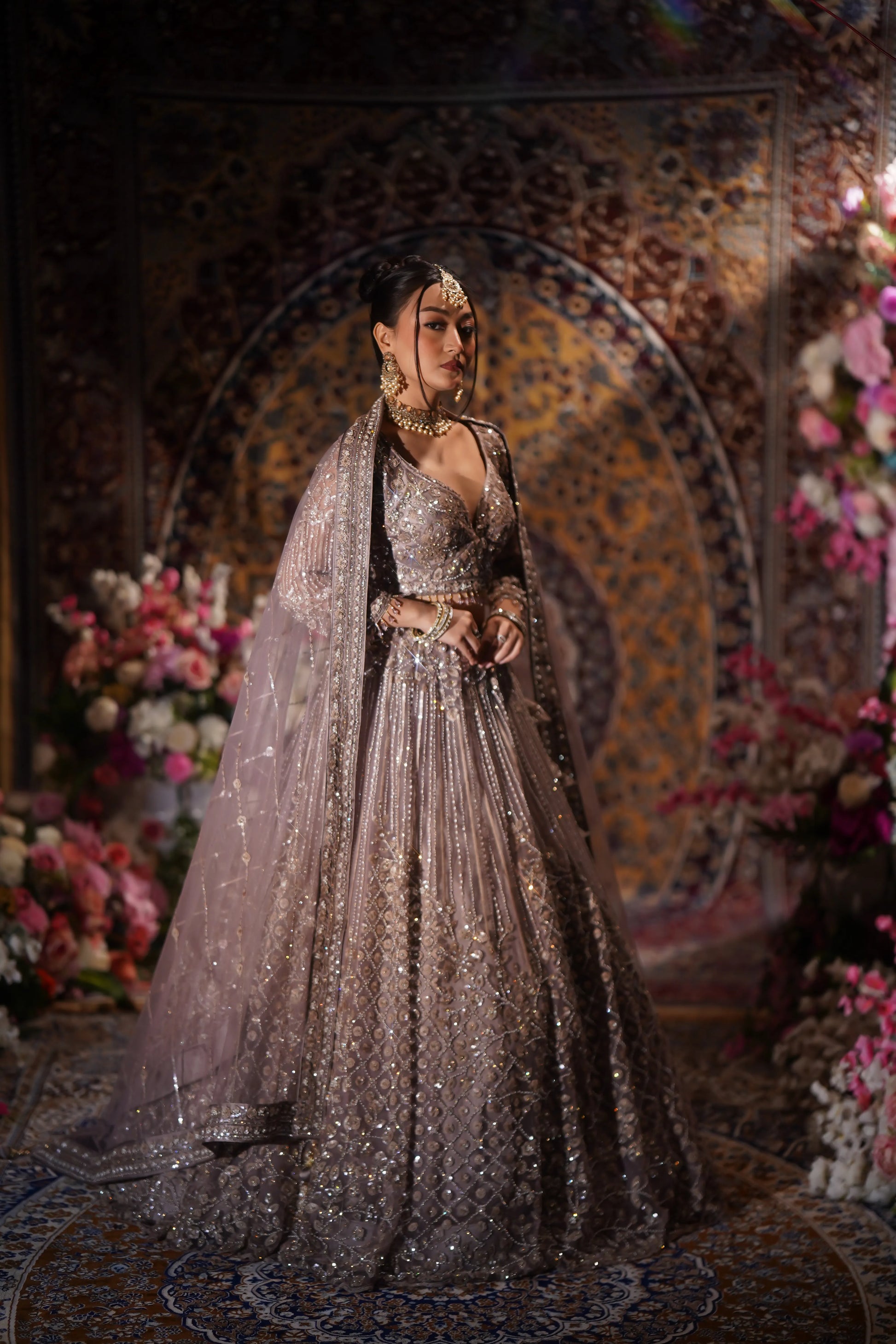Radiate ethereal beauty with this breathtaking Dusty Mauve Lehenga Set. This majestic ensemble features intricate crystal and sequin embroidery that mimics a starry night, combining understated hues with high-impact shine. Perfect for the sophisticated bride or bridesmaid looking to make a grand entrance at receptions and engagement ceremonies.