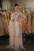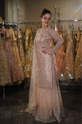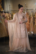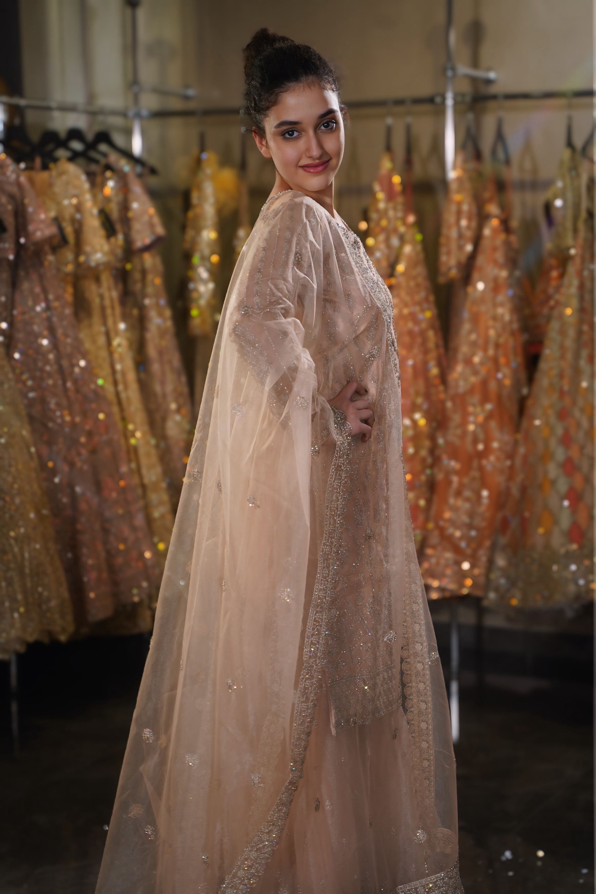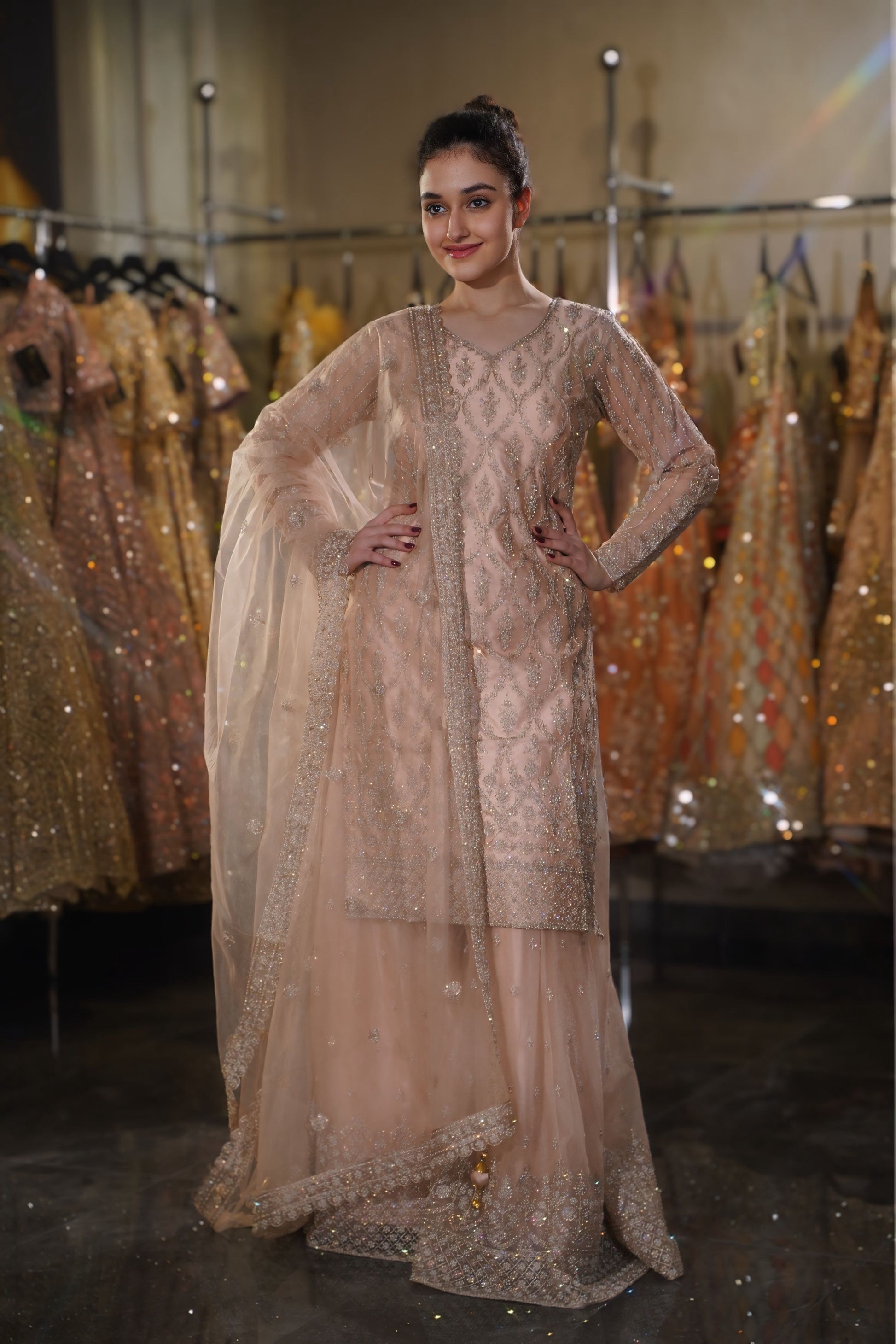 Blush Peach Geometric Lattice Embroidered Long Kurta Sharara Set