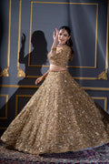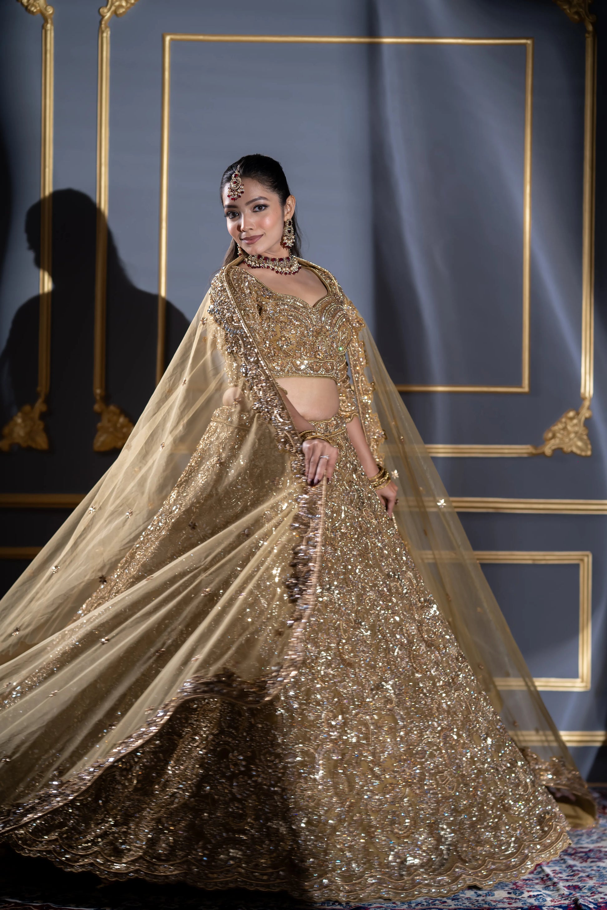 Illuminate the night with this spectacular Antique Gold Bridal Lehenga. A vision of absolute luxury, this ensemble is designed for the bride who commands attention with a look that rivals the richness of royalty. Perfect for a grand reception or an evening wedding, this outfit offers an all-over metallic sheen that is both commanding and sophisticated, ensuring you look like a queen from every angle.