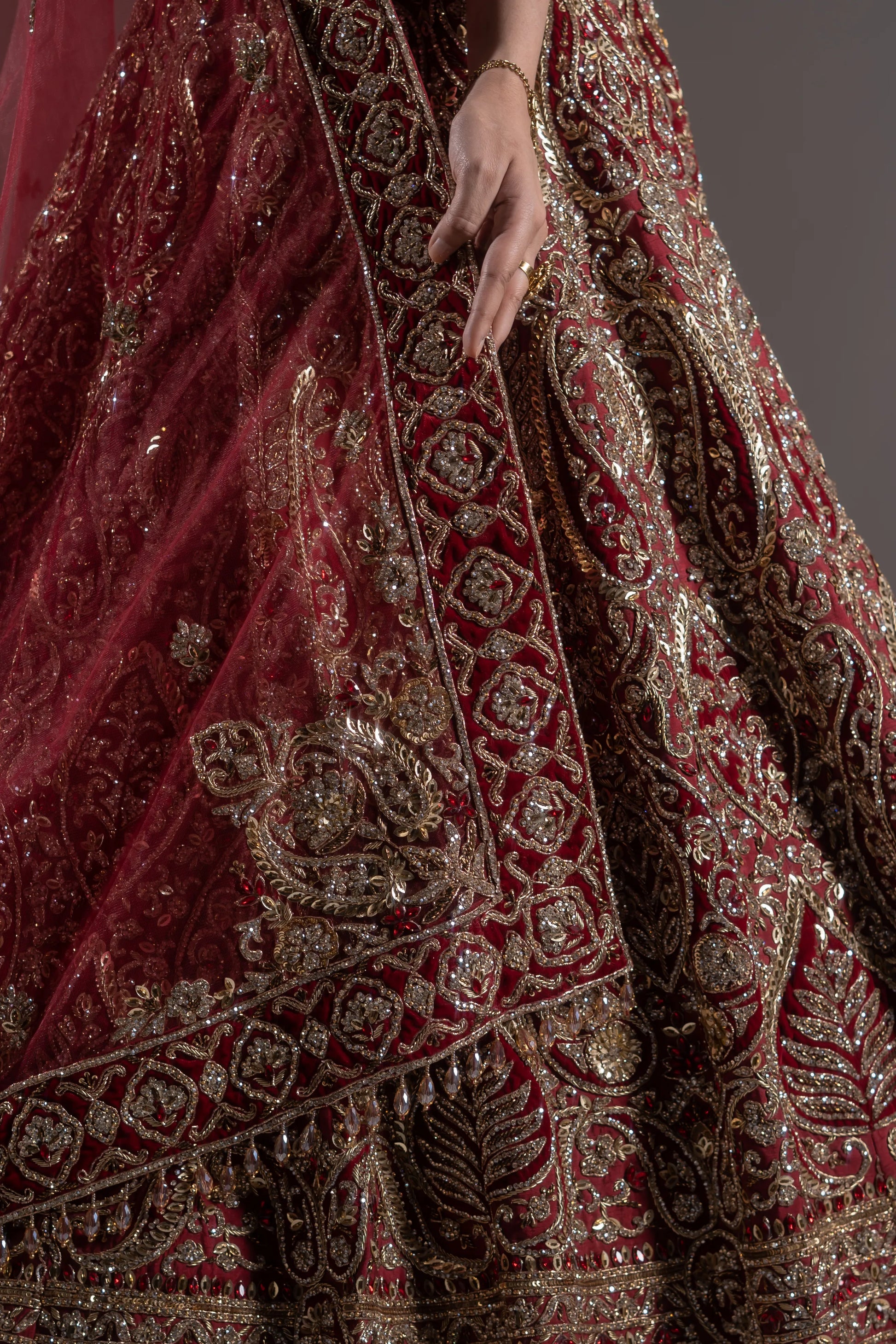 Royal Silhouette: The sheer weight of the hand-embroidery ensures the skirt holds a perfect, voluminous A-line shape that looks grand in photographs.
