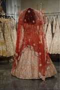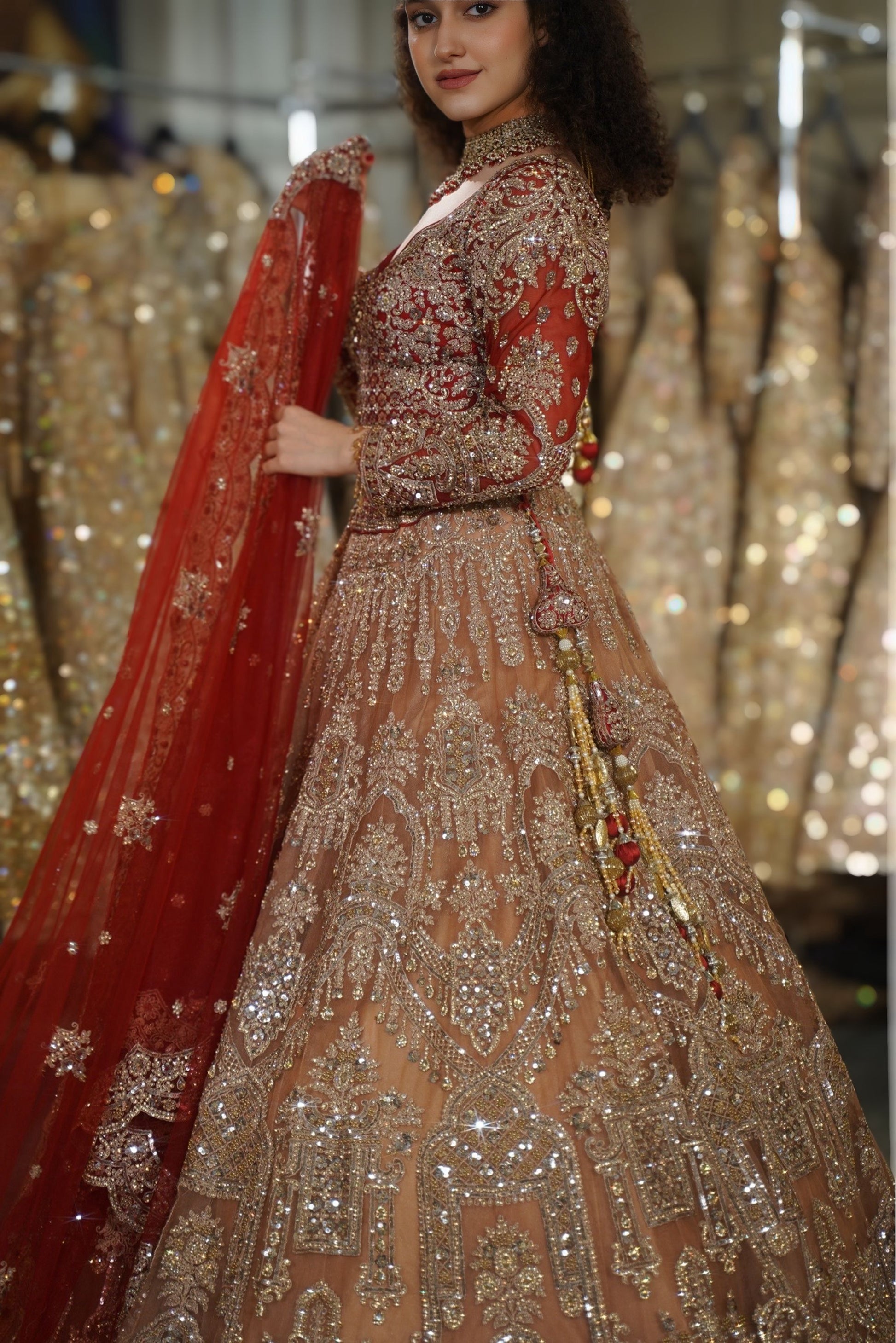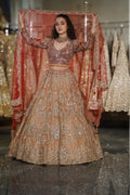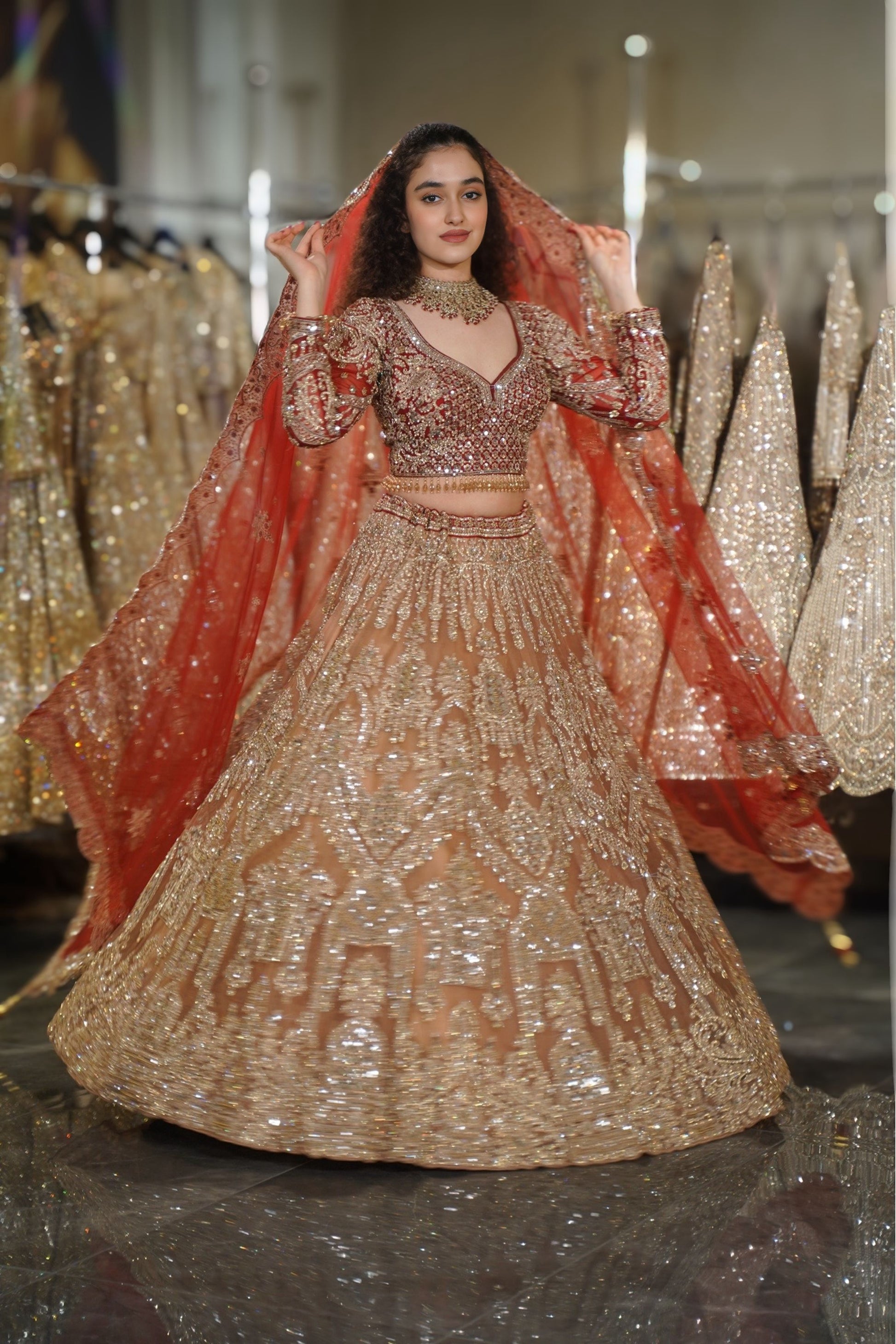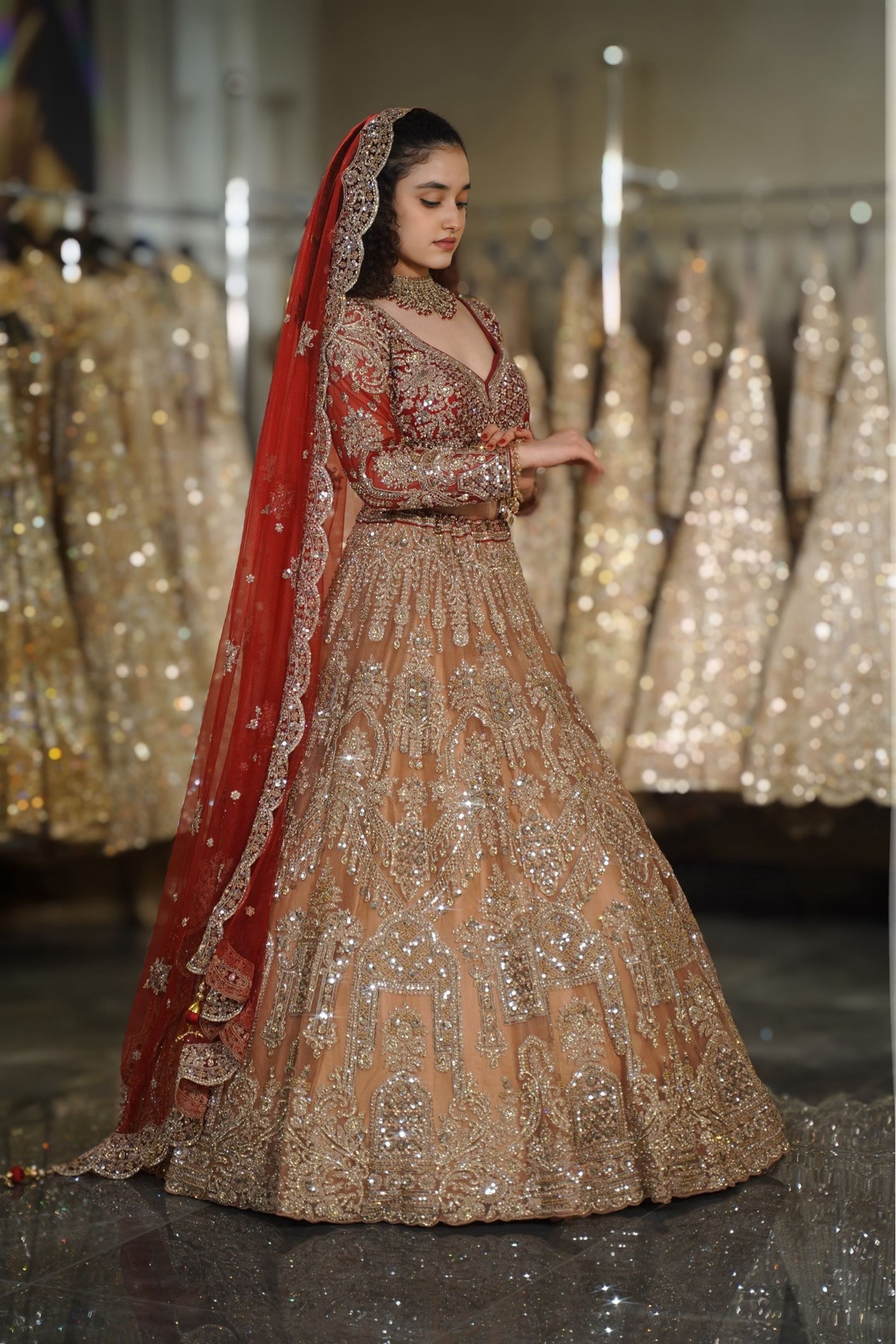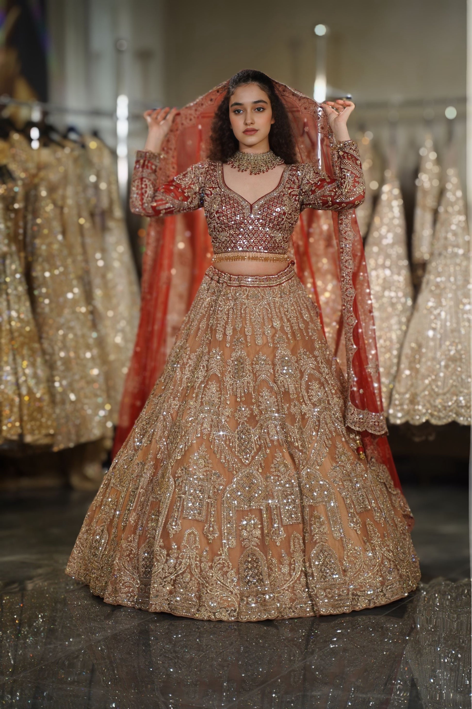 Apricot Peach & Rust Red Architectural Sequin Embroidered Lehenga Set
