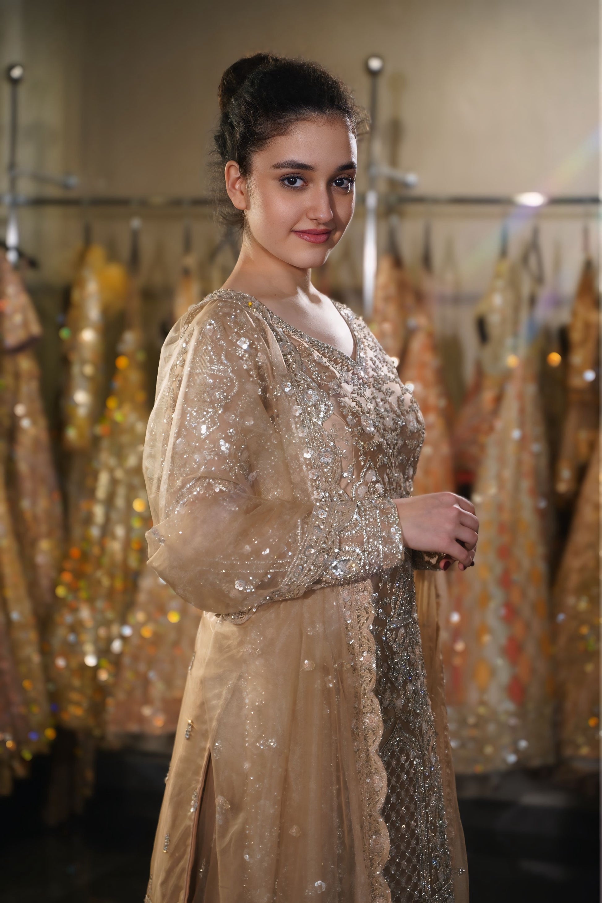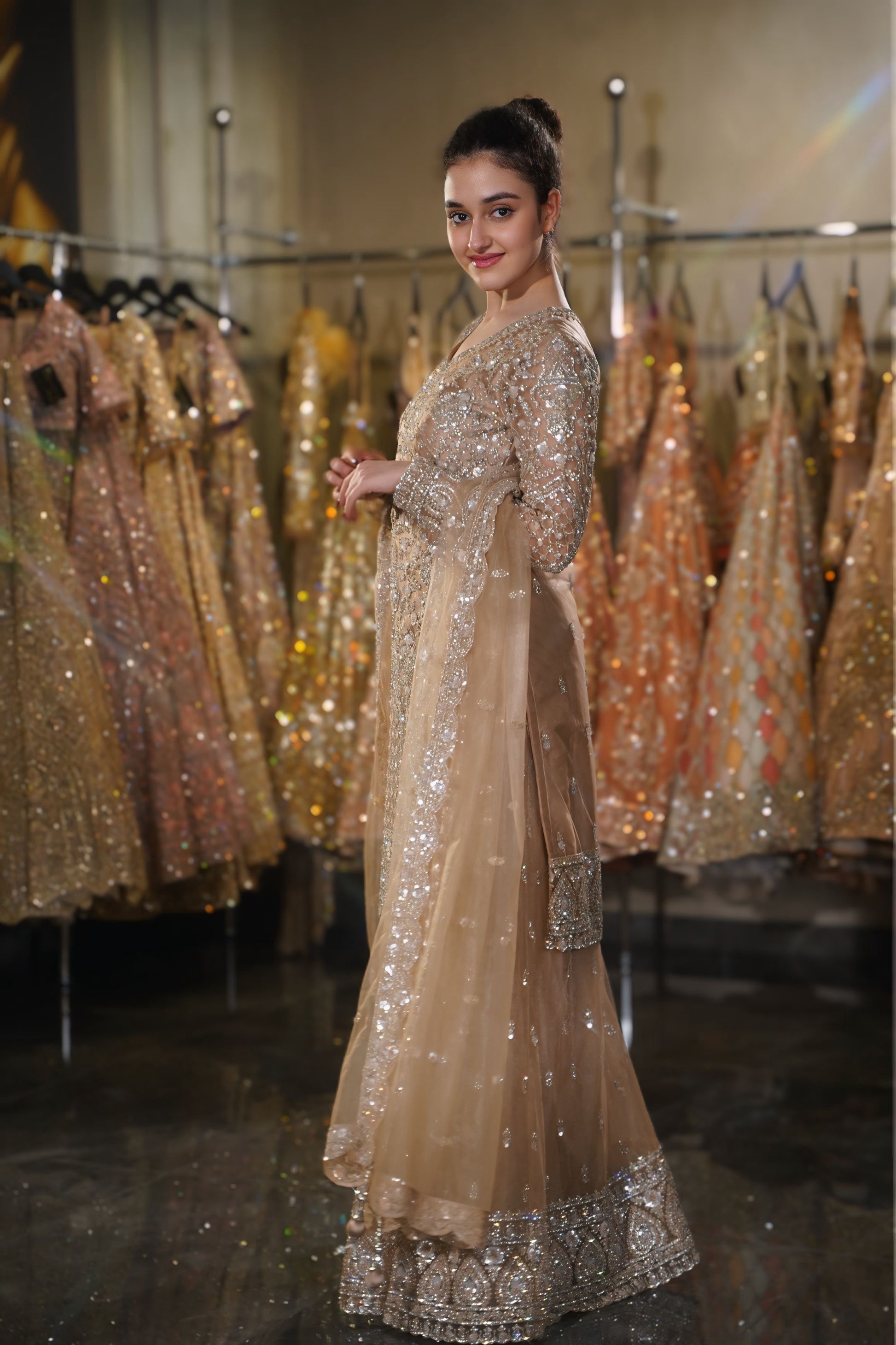 | Dupatta | Sheer champagne net dupatta with a matching embroidered border and scattered sequins |