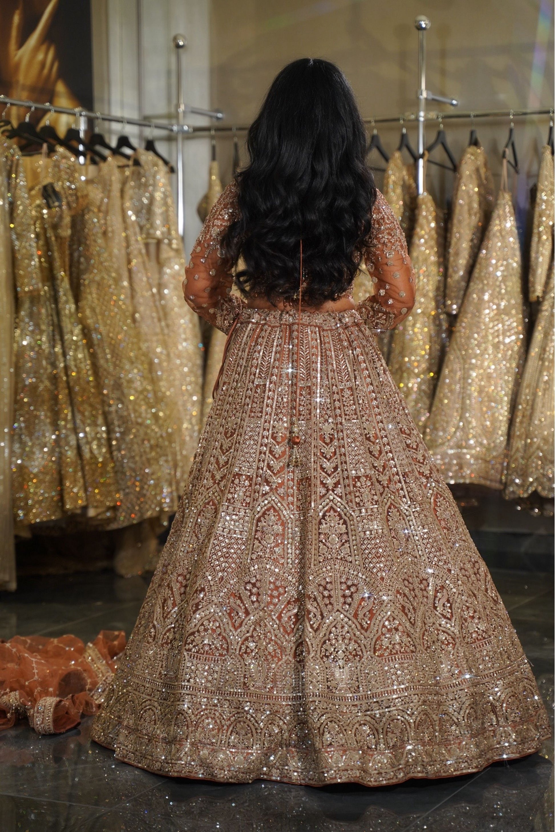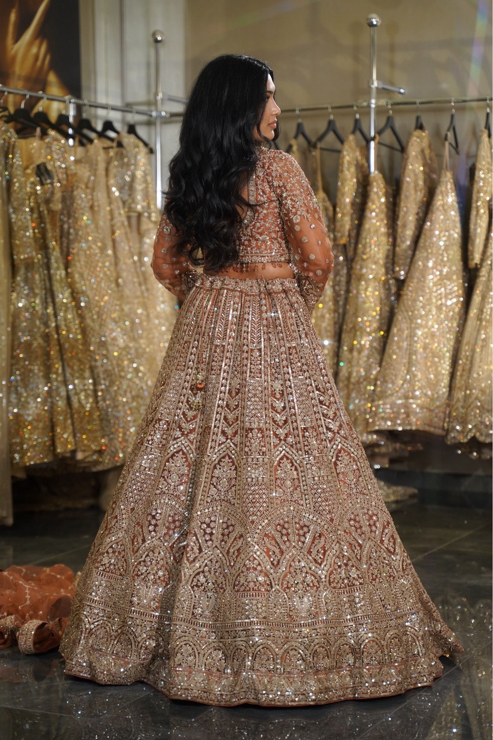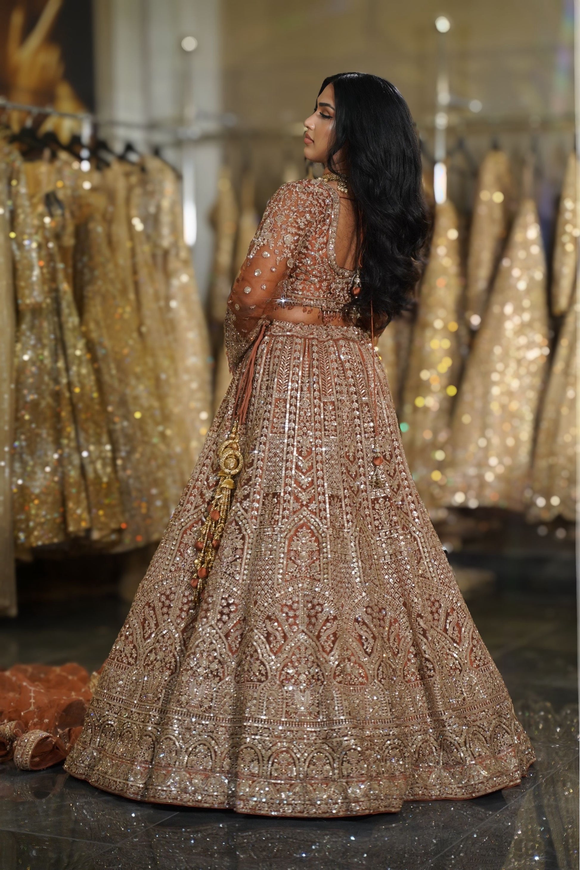 Rust Copper Architectural Sequin & Crystal Embroidered Lehenga Set