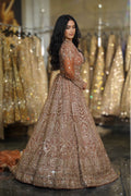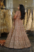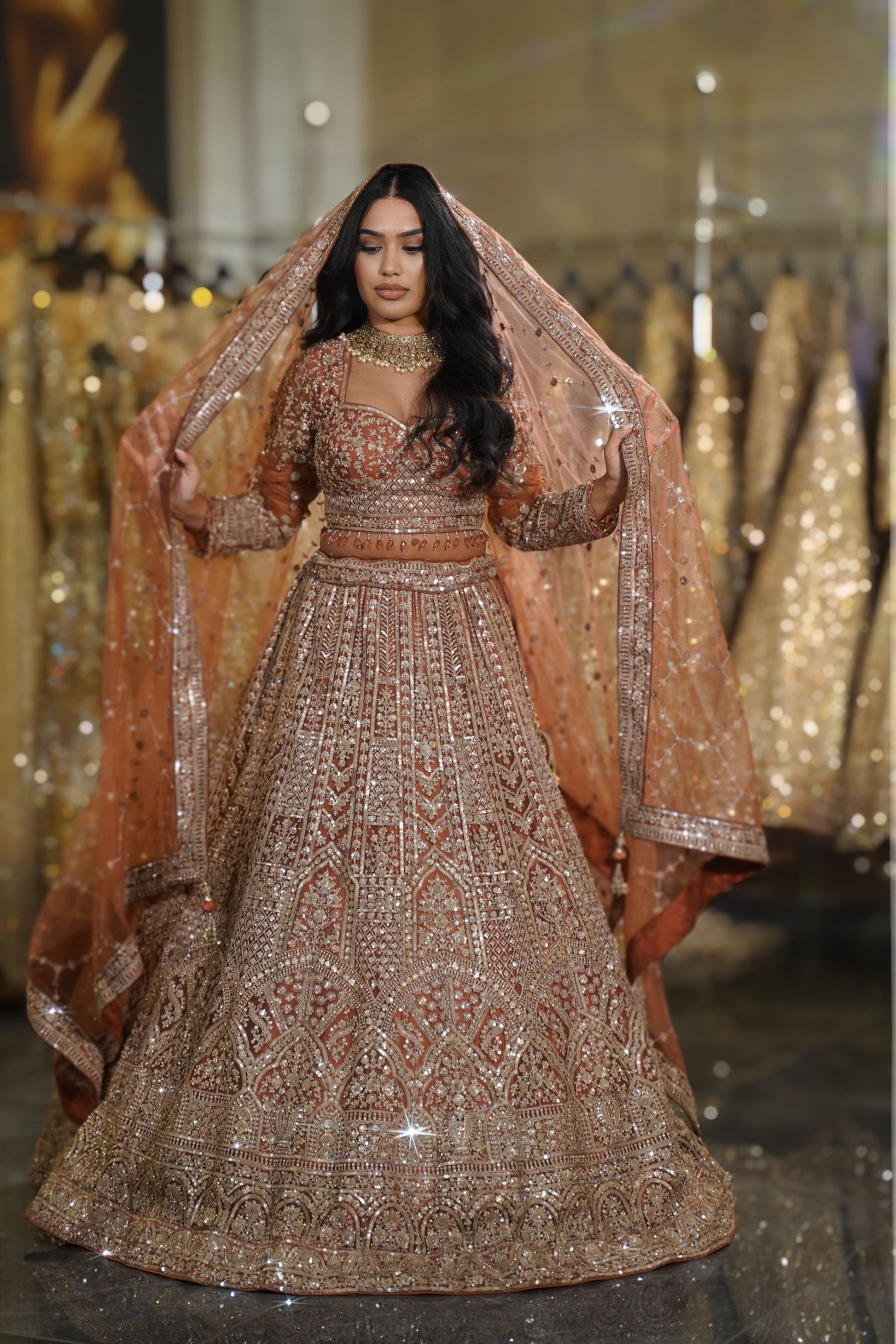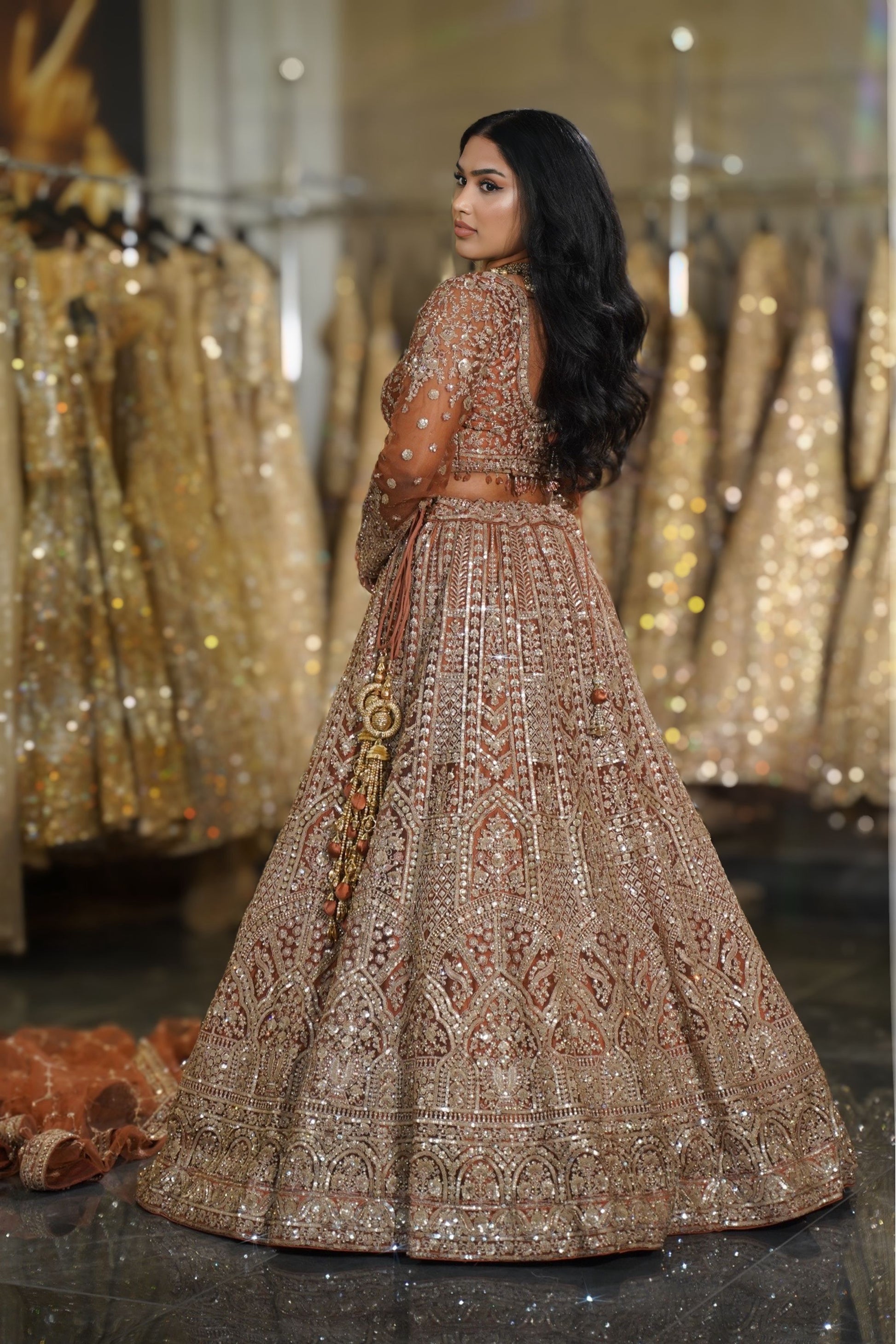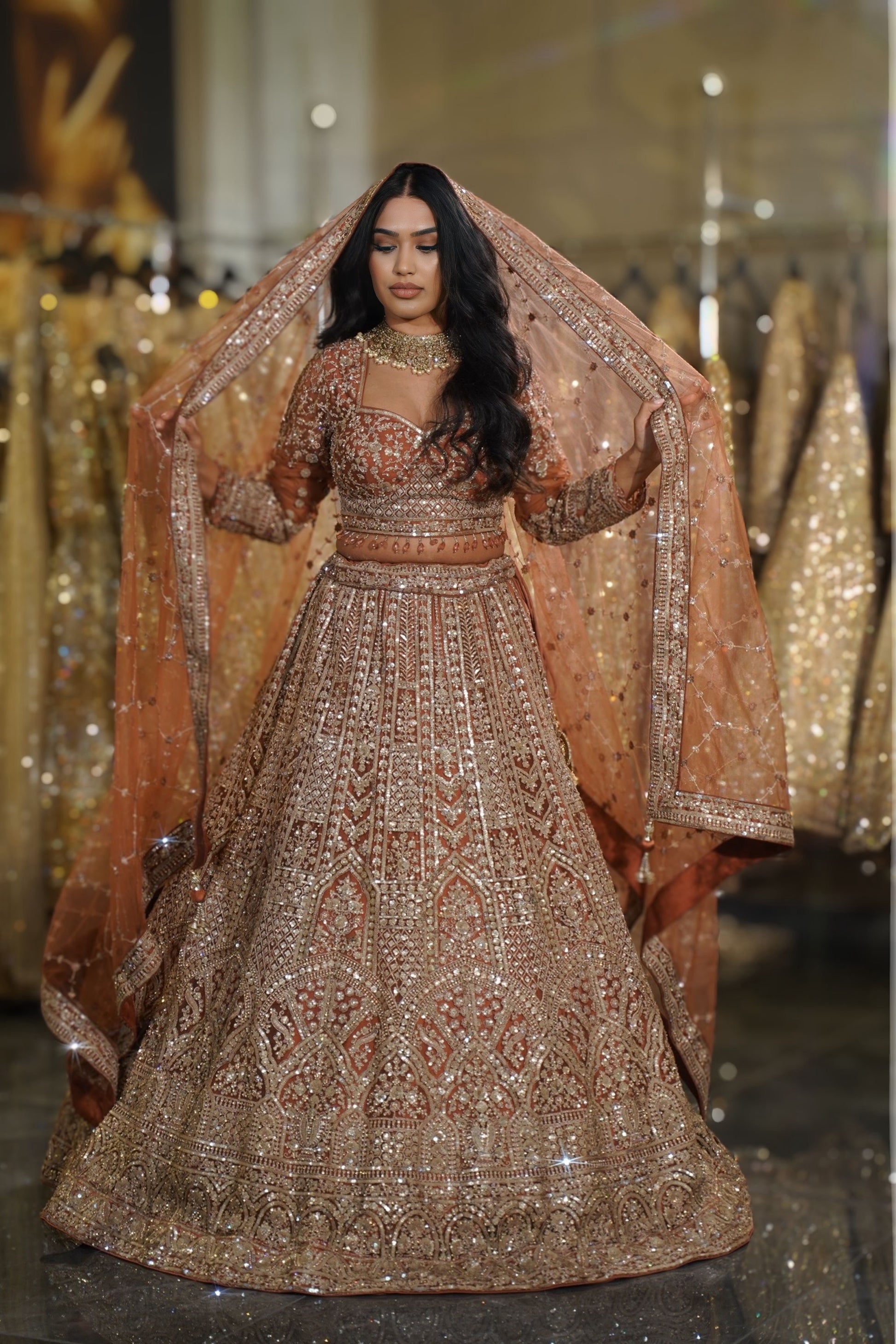 Rust Copper Architectural Sequin & Crystal Embroidered Lehenga Set