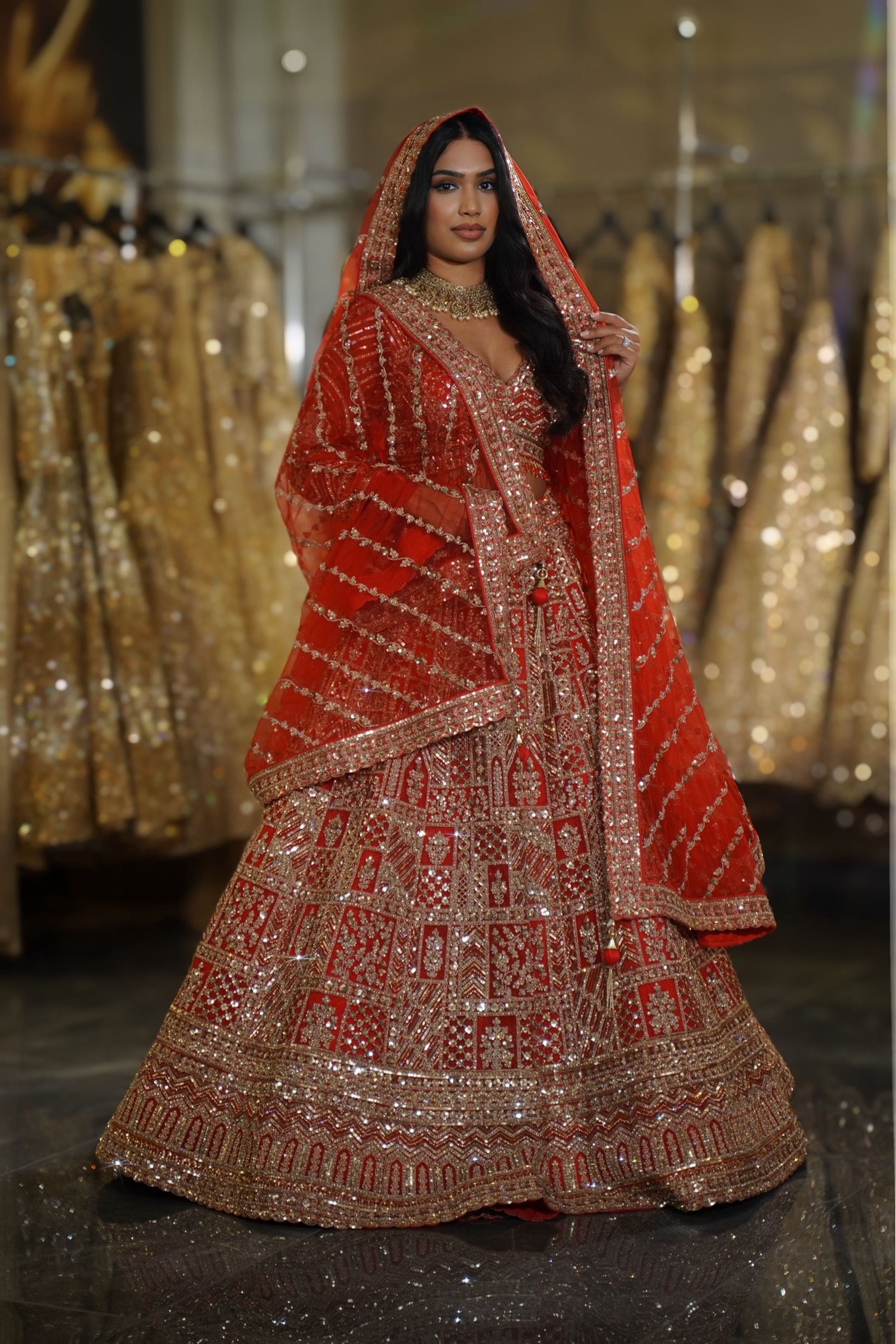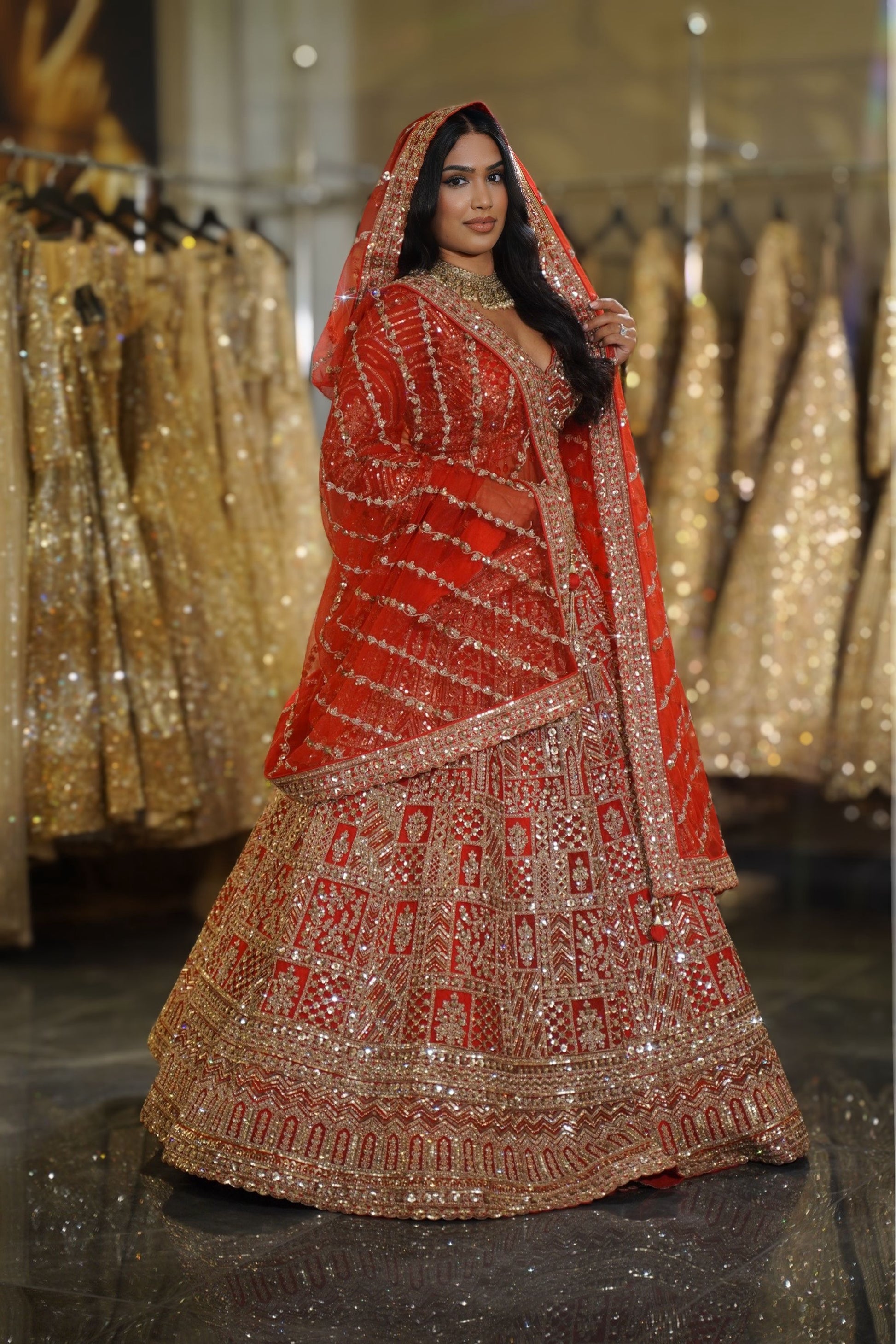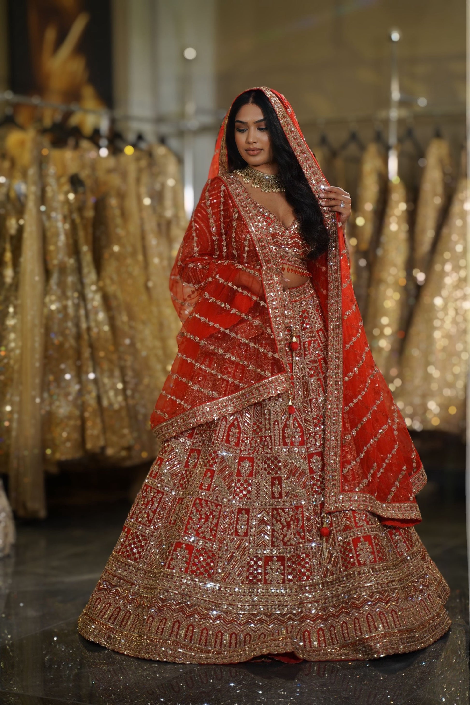 The vibrant bright red hue is the quintessential bridal color, ensuring you look the part of the traditional Indian bride with a majestic presence.