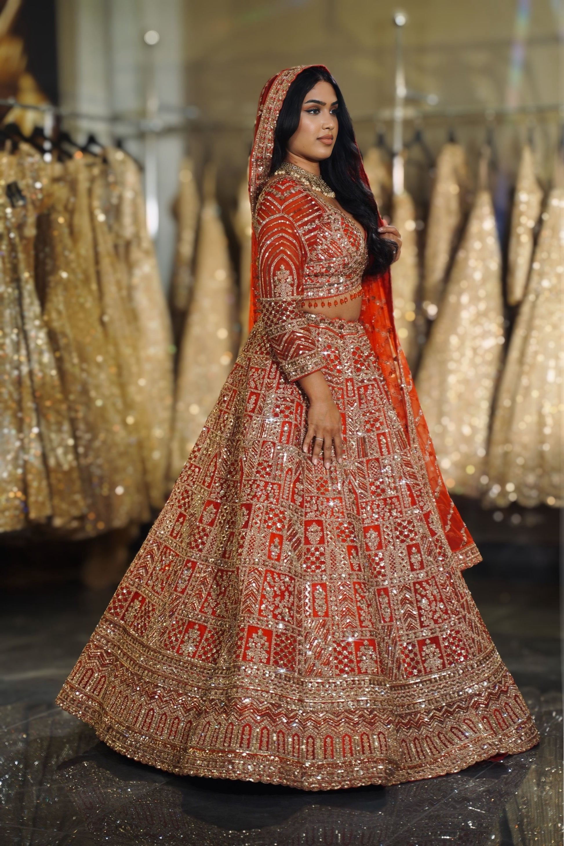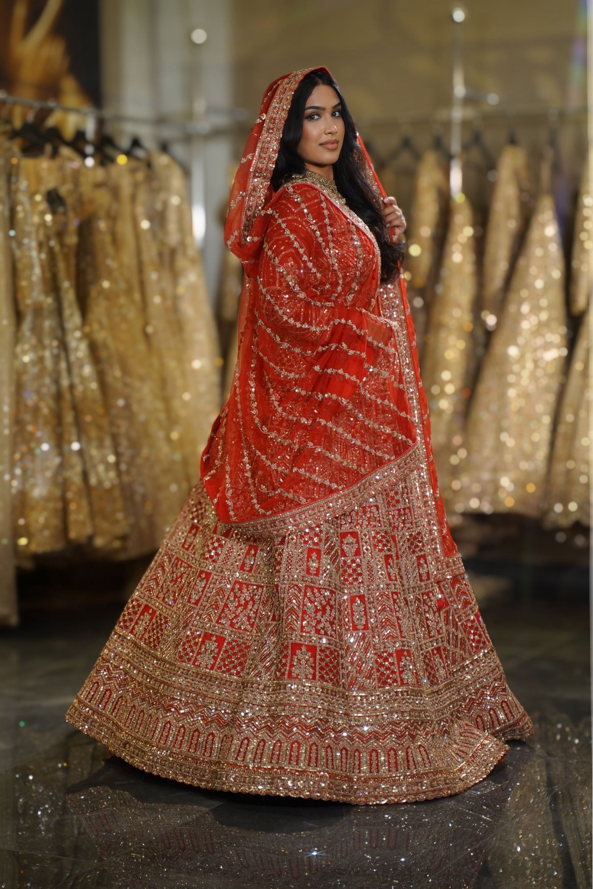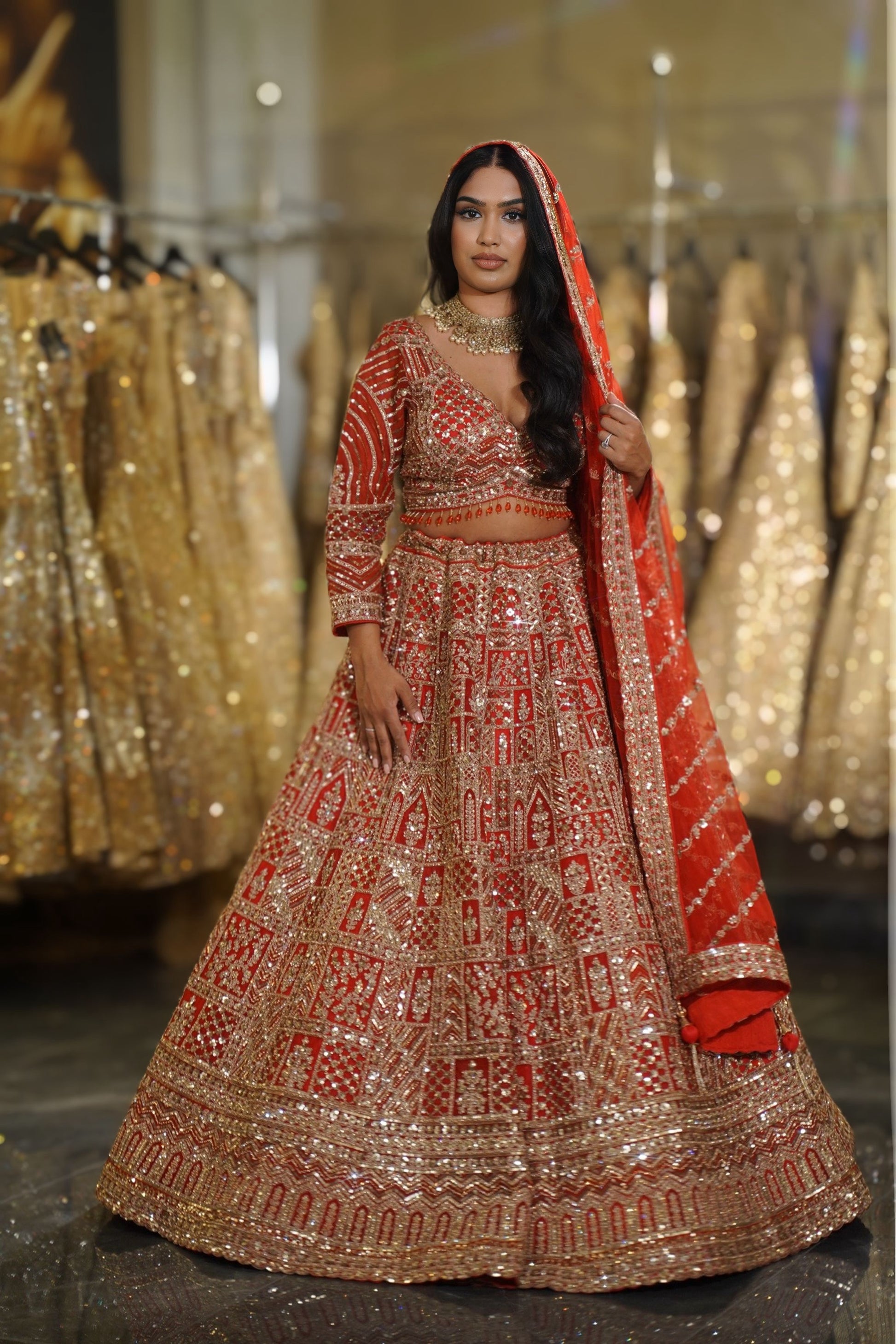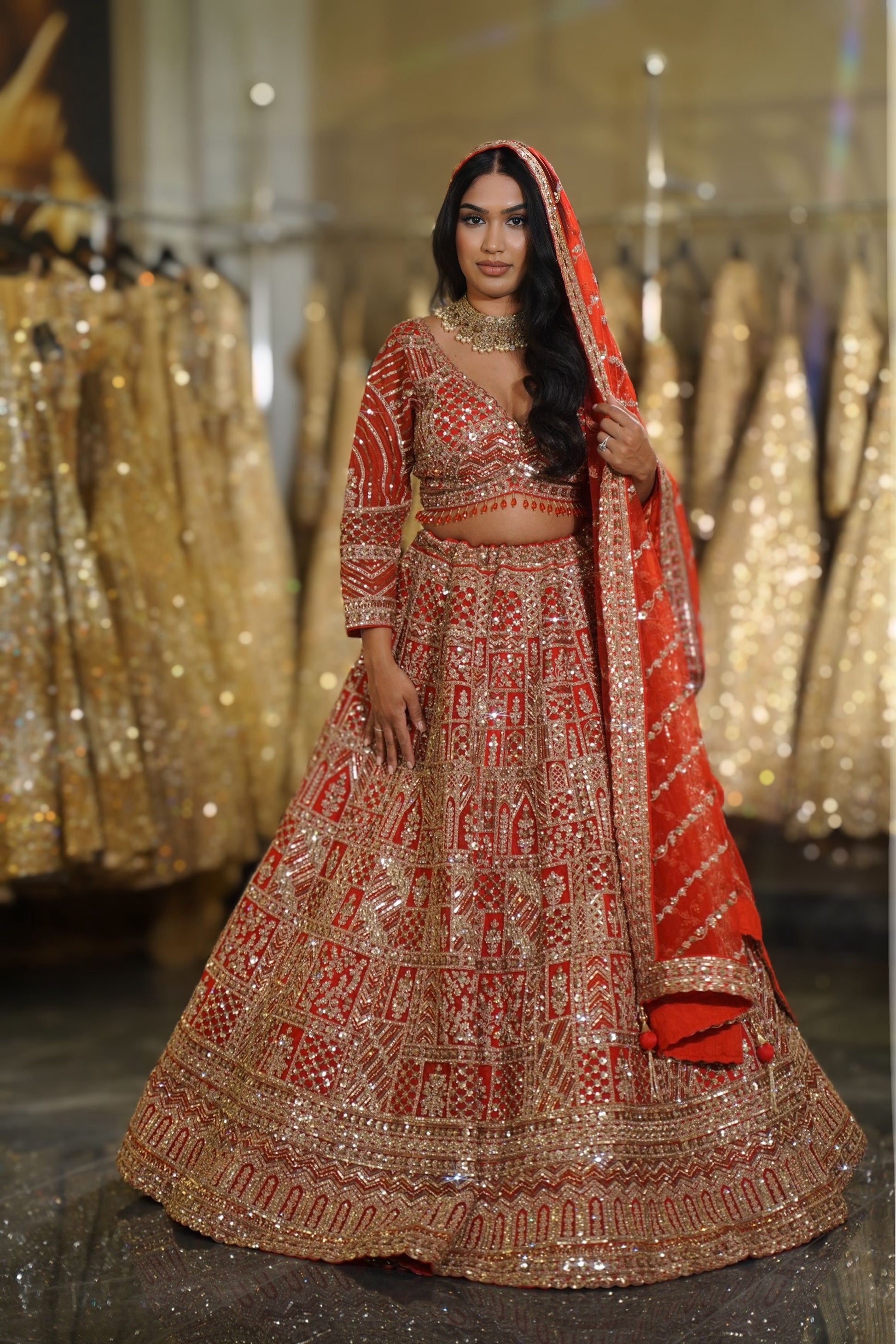 The vibrant bright red hue is the quintessential bridal color, ensuring you look the part of the traditional Indian bride with a majestic presence.