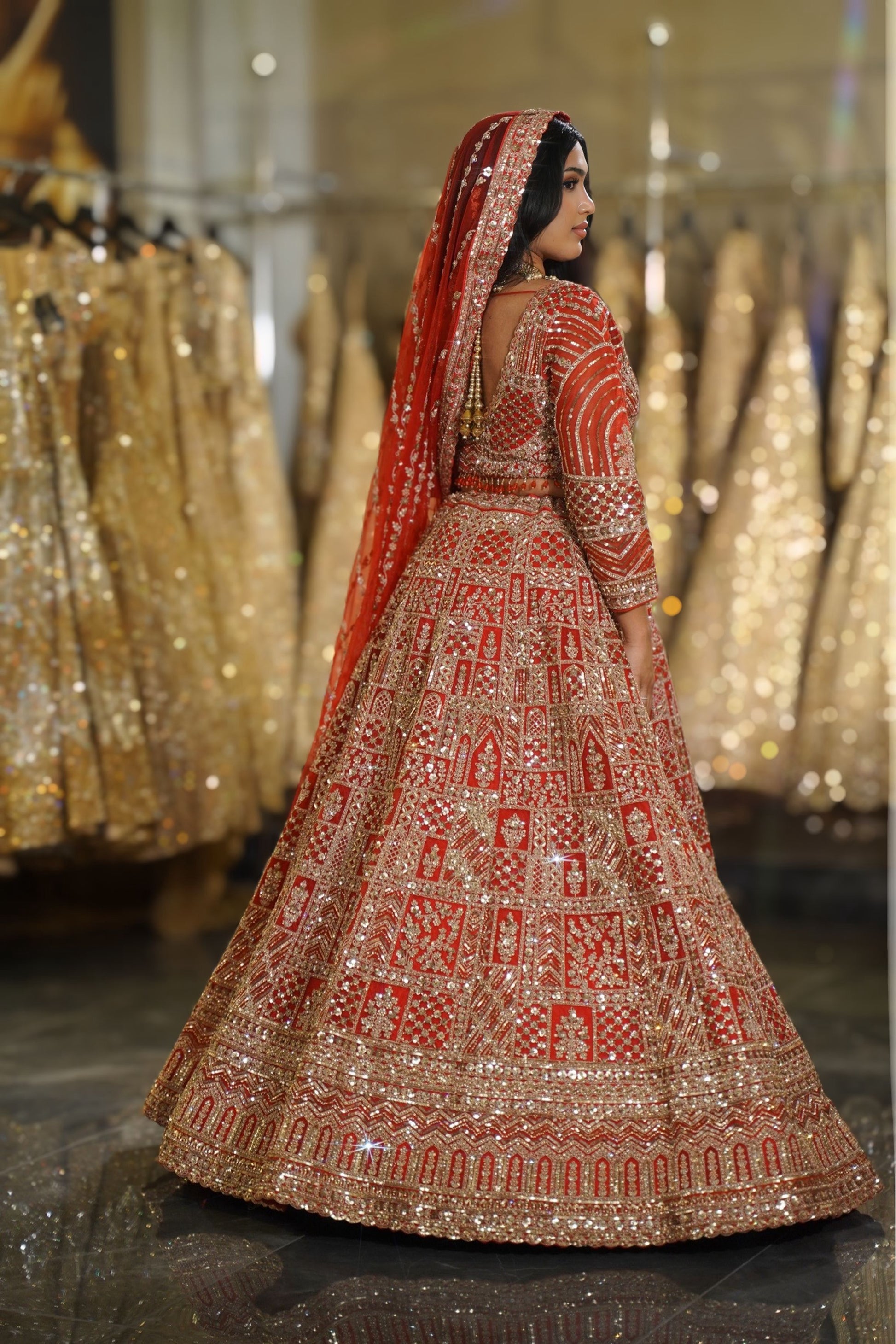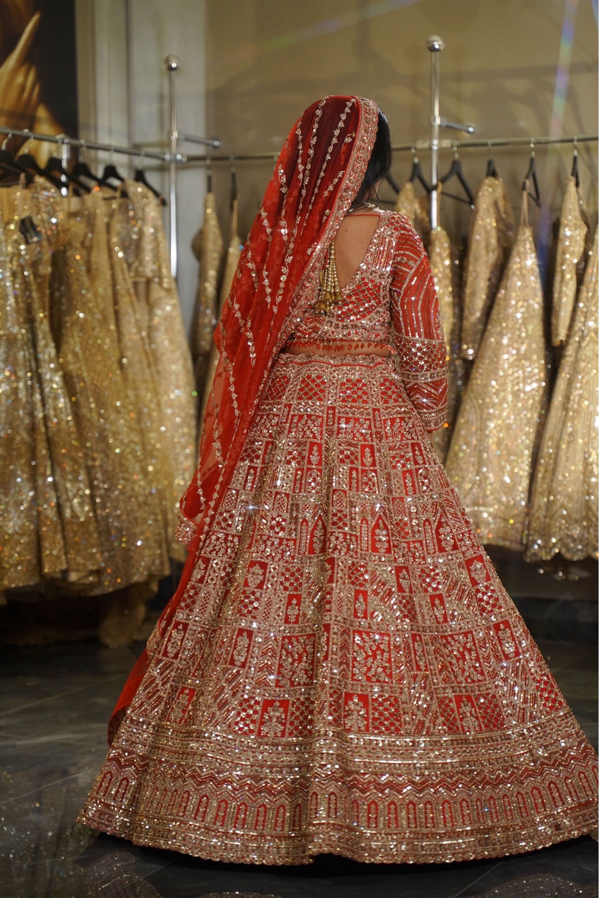 Gold on Red: The classic combination of bright gold zari and sequins against the crimson red base creates a rich, auspicious glow that is perfect for wedding pheras 💎