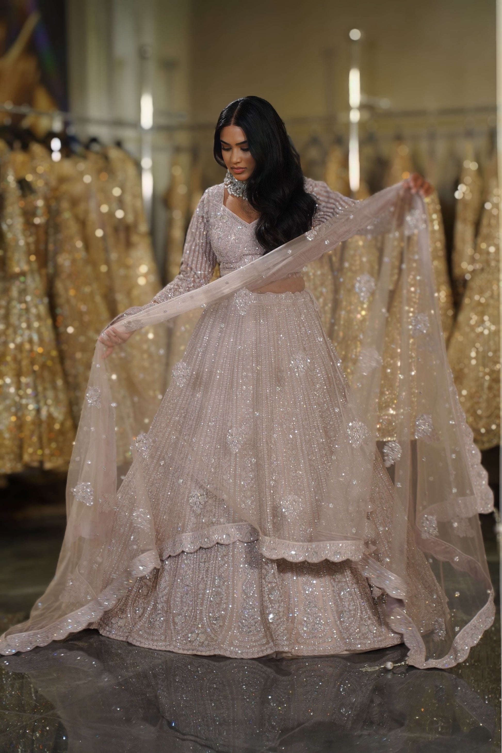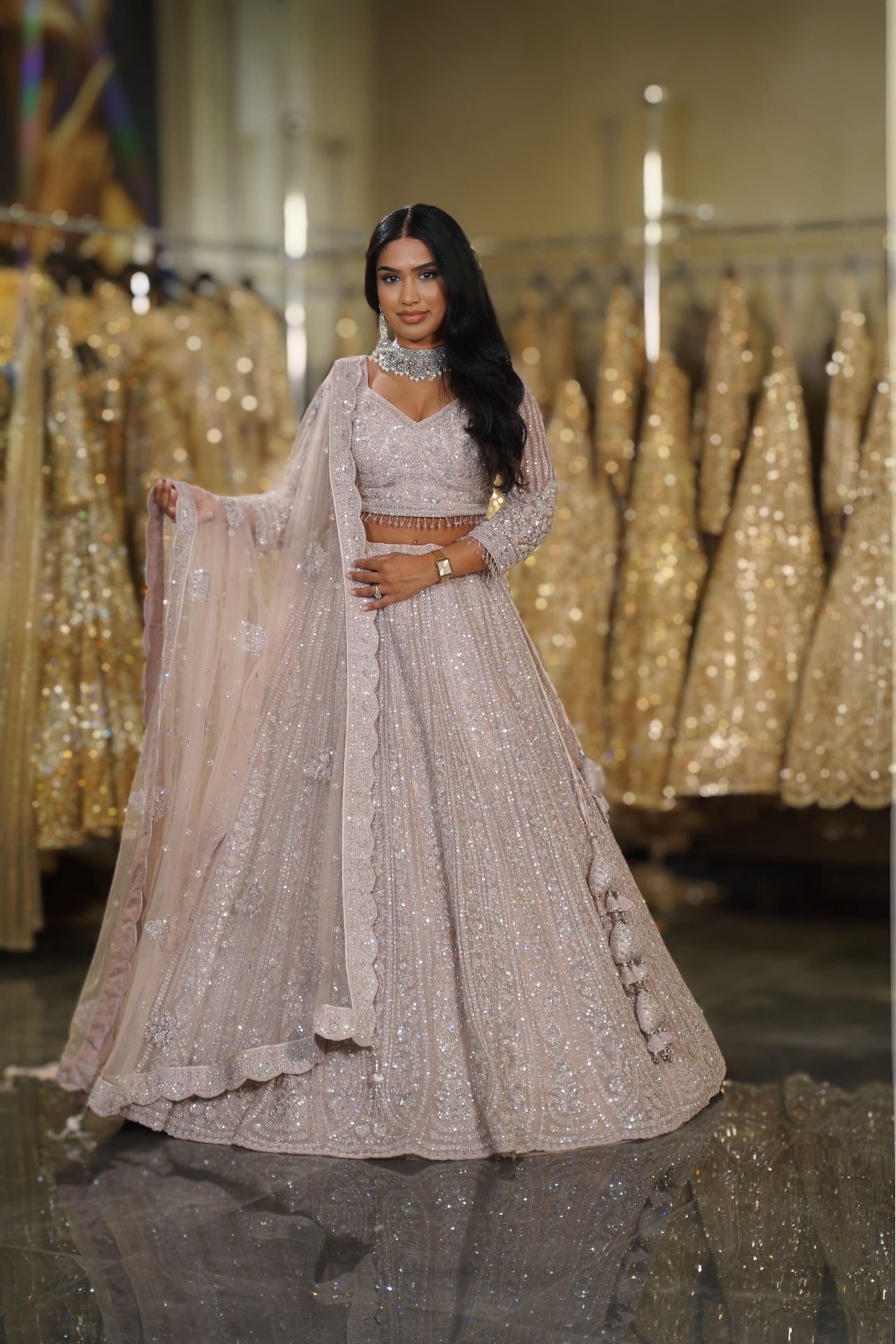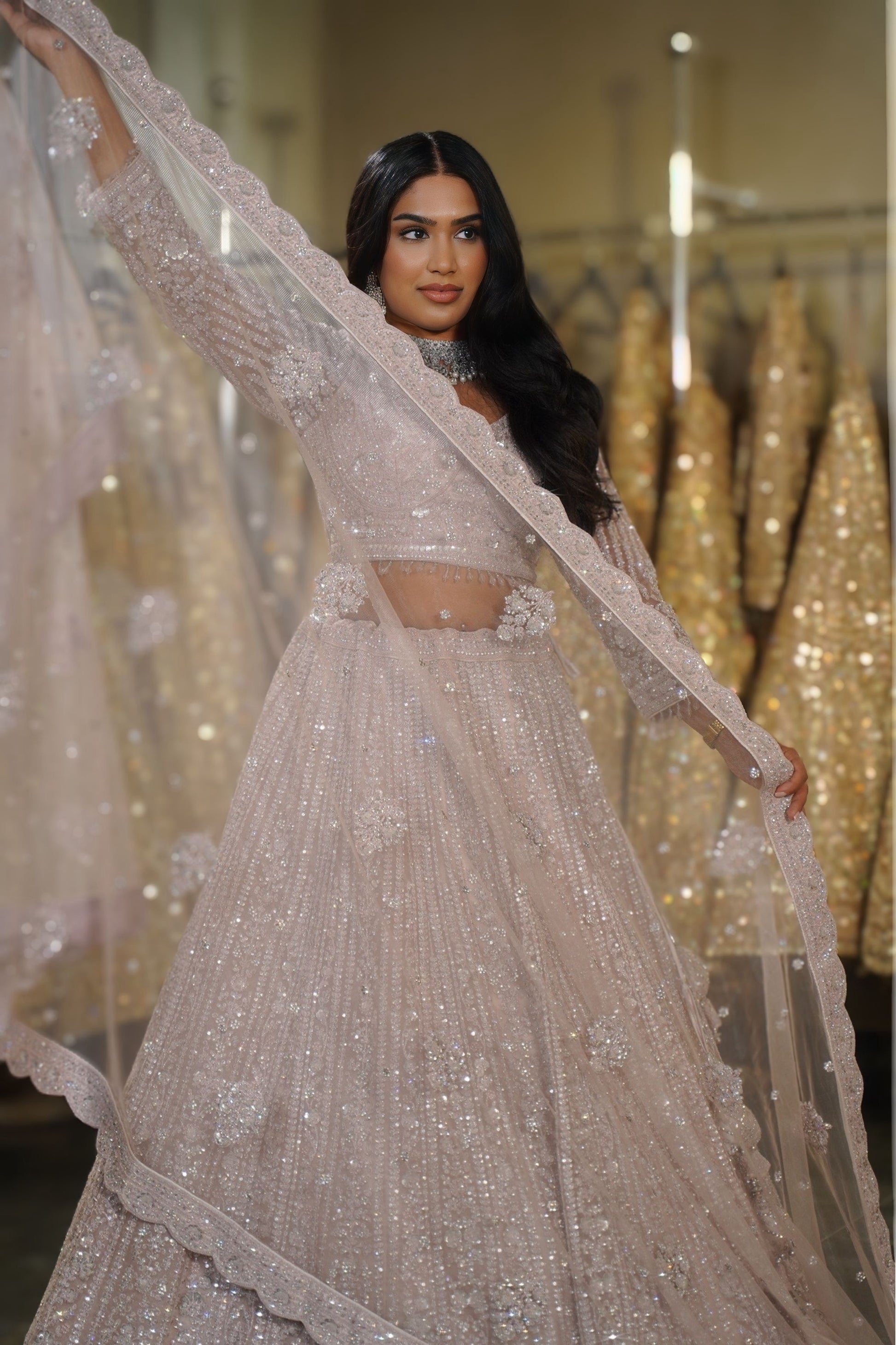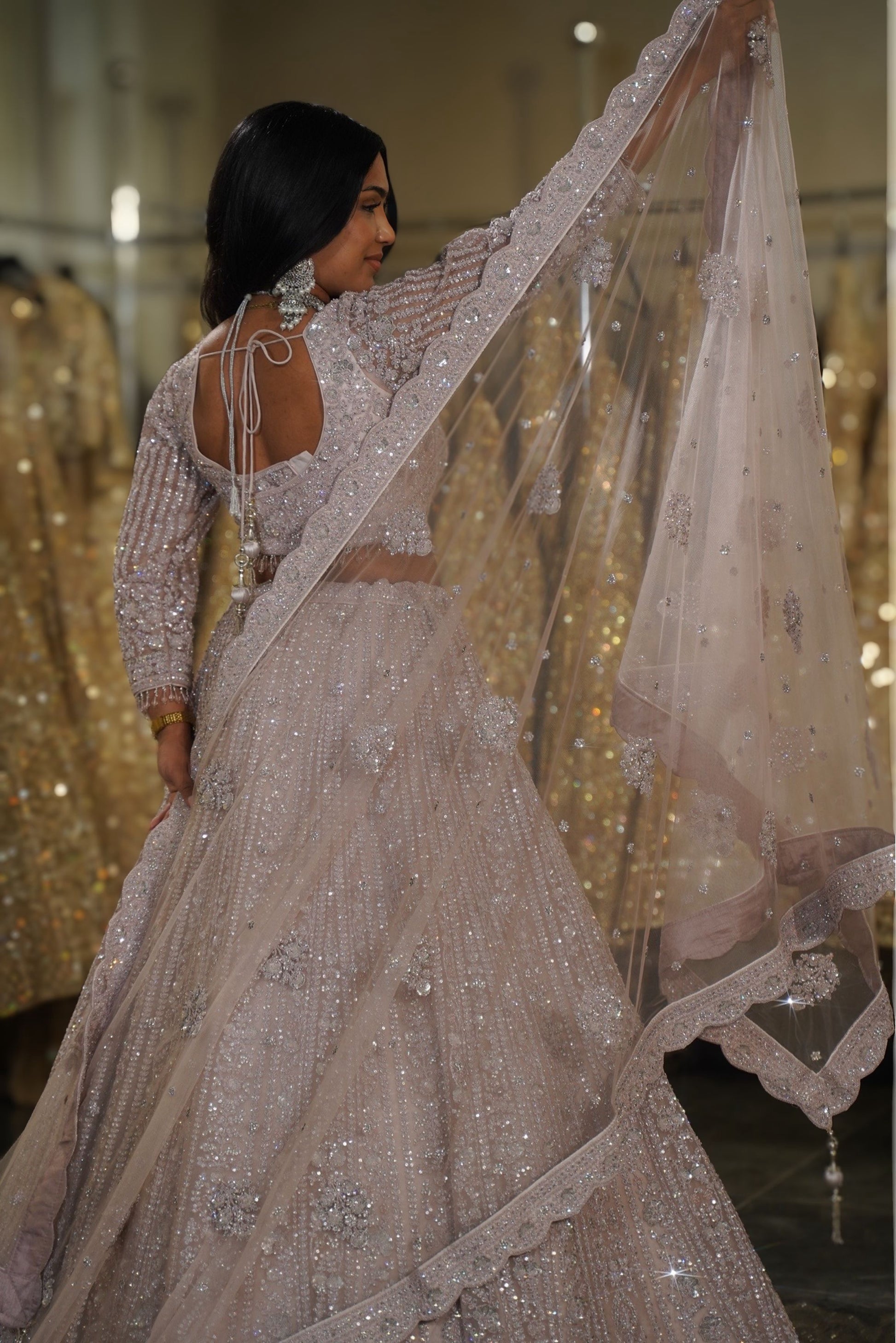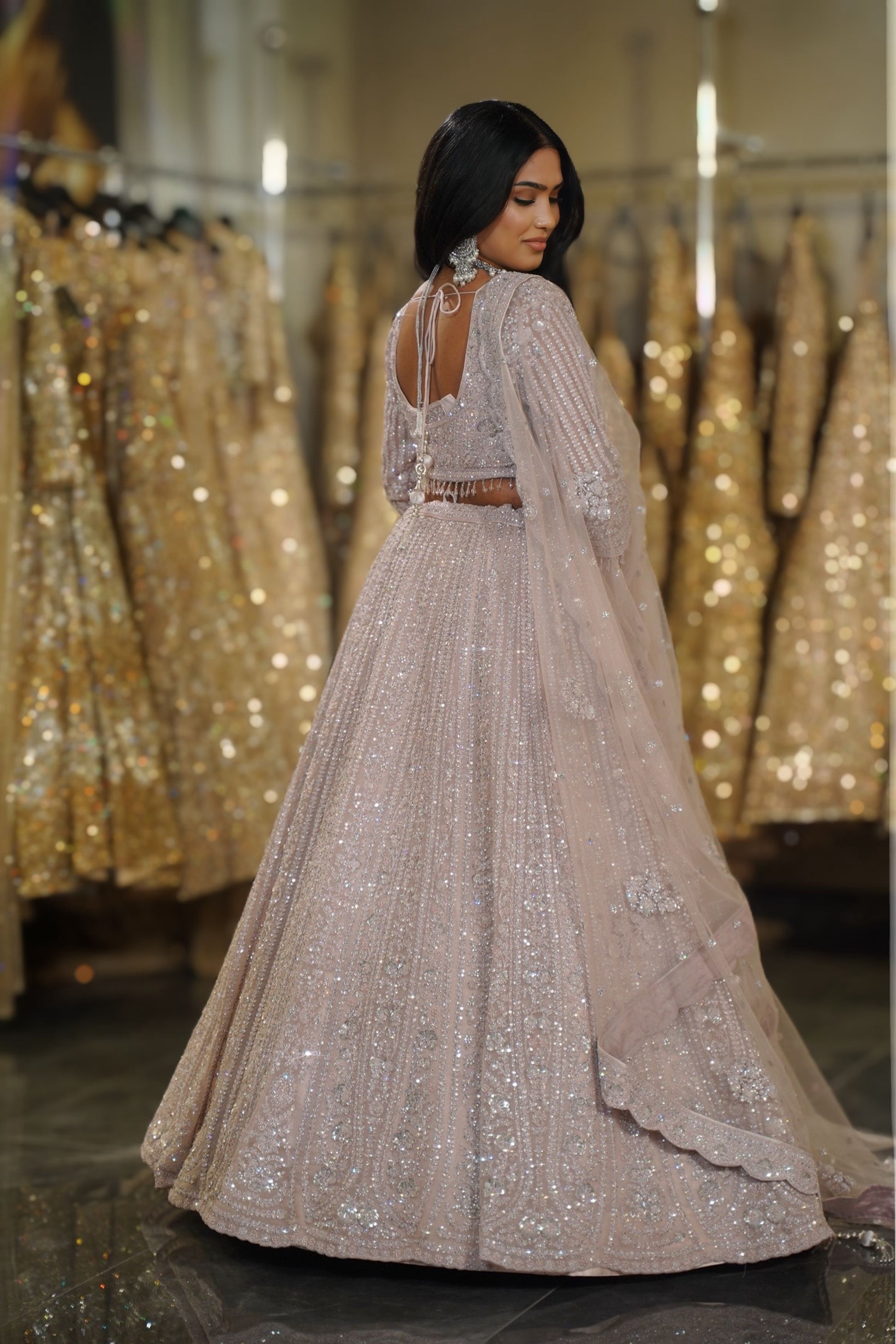 Frosted Silver Glow: The heavy application of silver crystals and sequins against the cool lilac-pink net creates a stunning "frosted" effect that catches the light beautifully