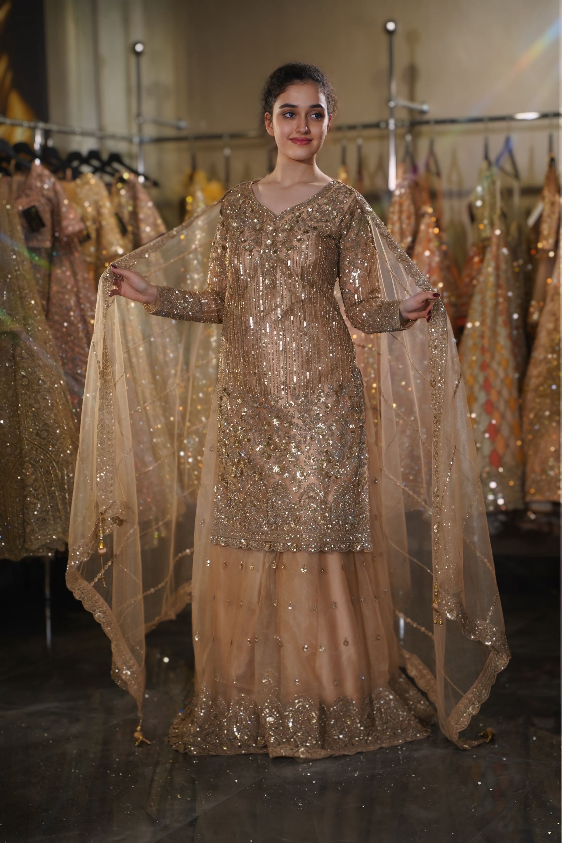 Ornate Sharara Hem: The wide-legged sharara bottoms feature scattered sequin sparkles on the legs, transitioning into a massive, heavily embroidered border at the hem for a royal finish 🏛️