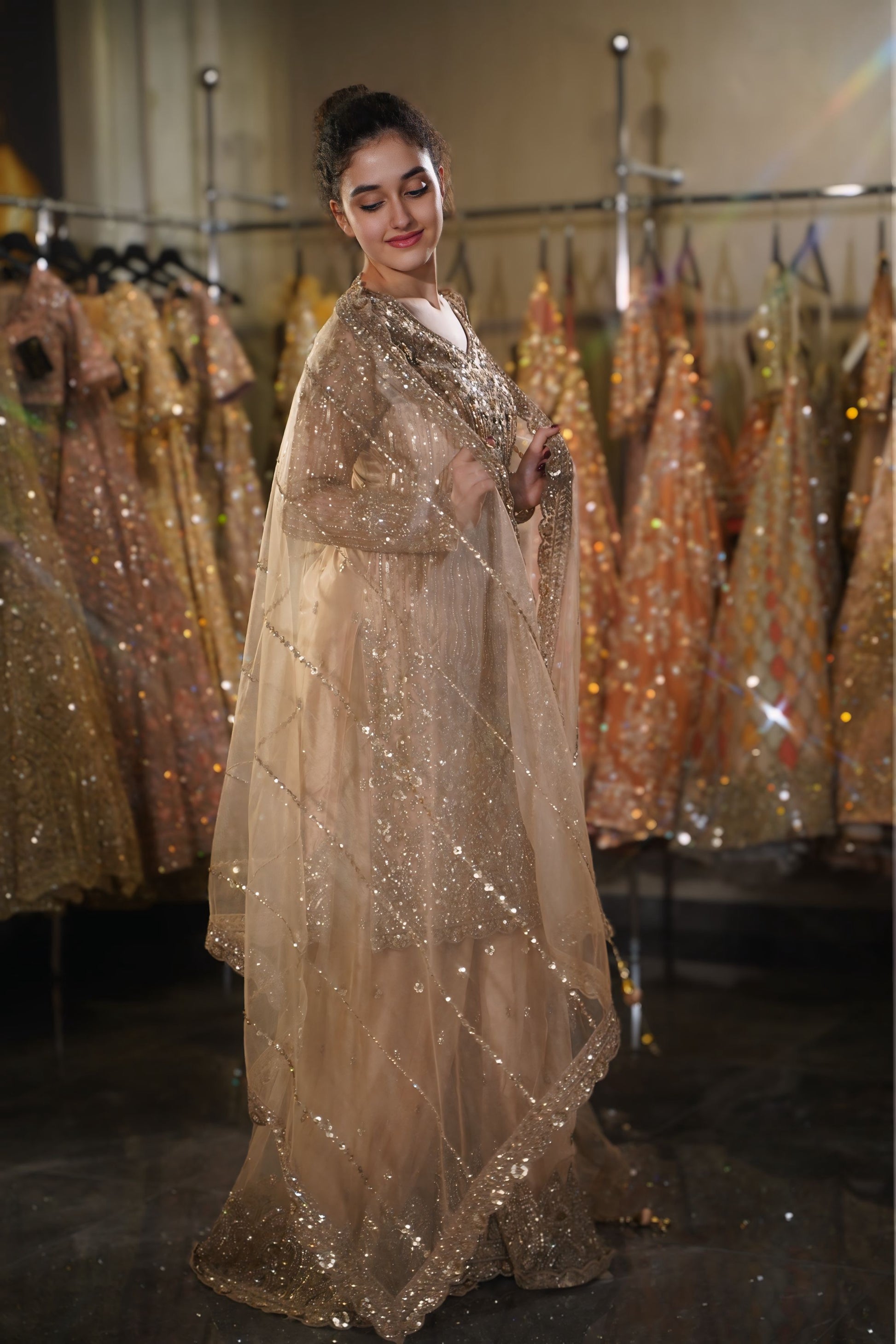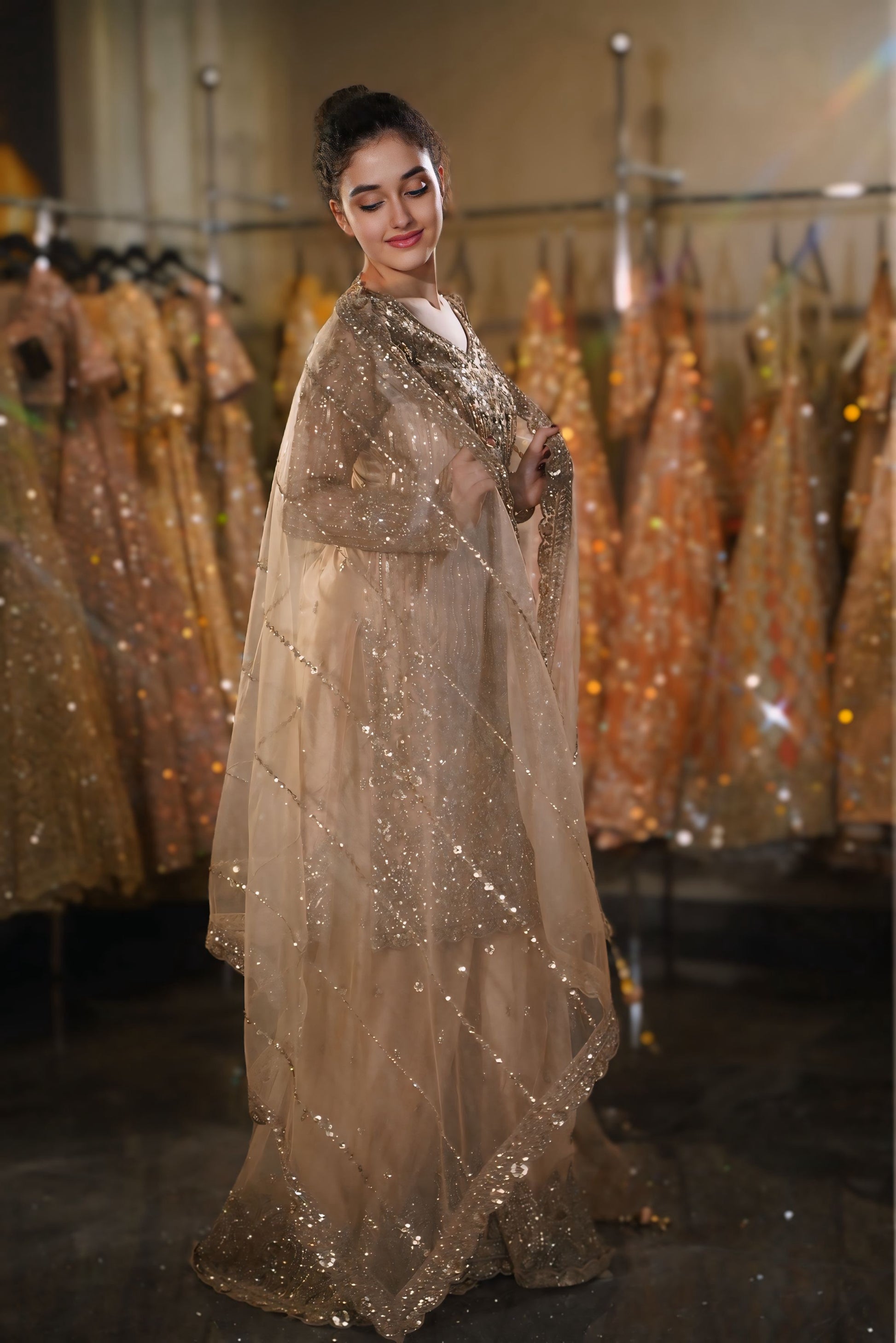 Monochromatic Glow: The tone-on-tone pairing of the champagne fabric with metallic embellishments creates a sophisticated, neutral palette that radiates understated luxury 👑