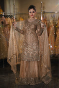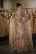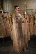 Glow with the warmth of a thousand sunsets in this breathtaking Champagne Gold Sharara Set. A masterpiece of linear precision and soft luxury, this ensemble features a graceful, knee-length straight kurta paired with voluminous wide-legged sharara pants. The soft beige-gold base is completely illuminated by shimmering sequins arranged in vertical patterns, creating a look that is both slimming and dazzling. Perfect for a golden-hour Engagement, a sophisticated Sangeet, or a grand Reception.