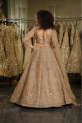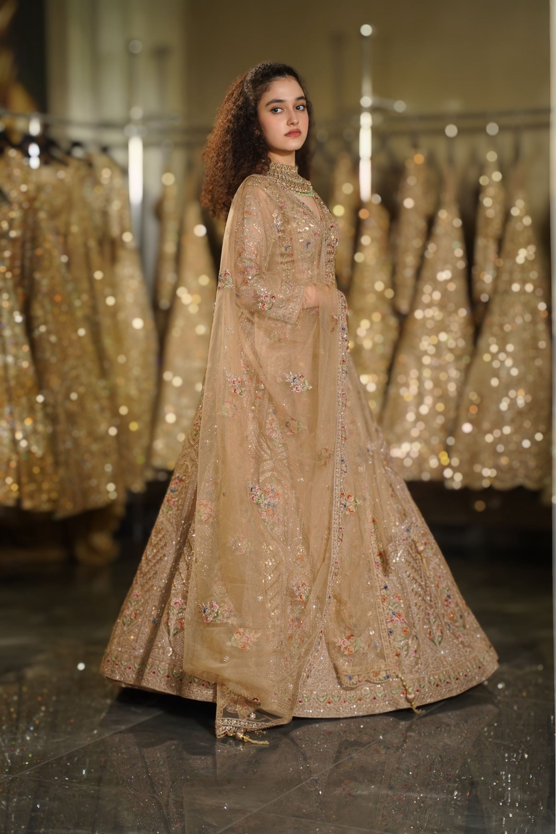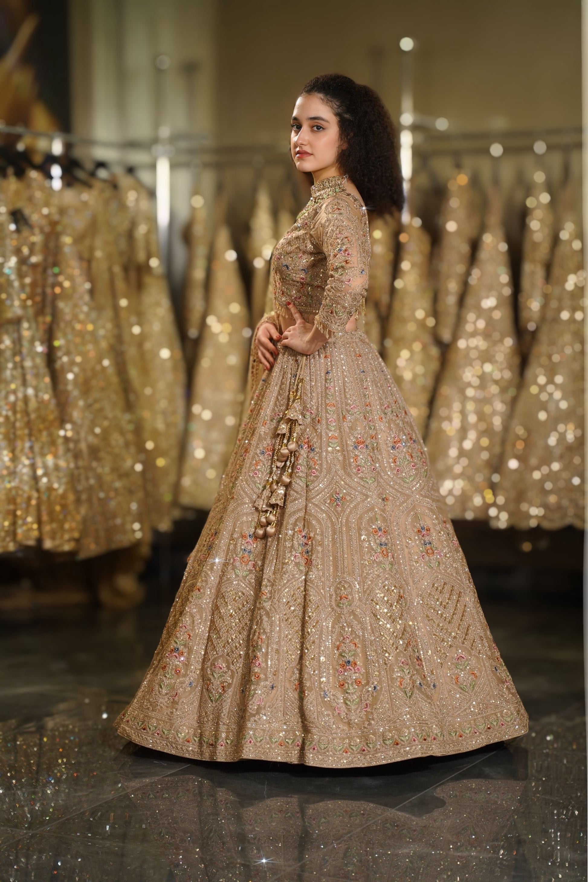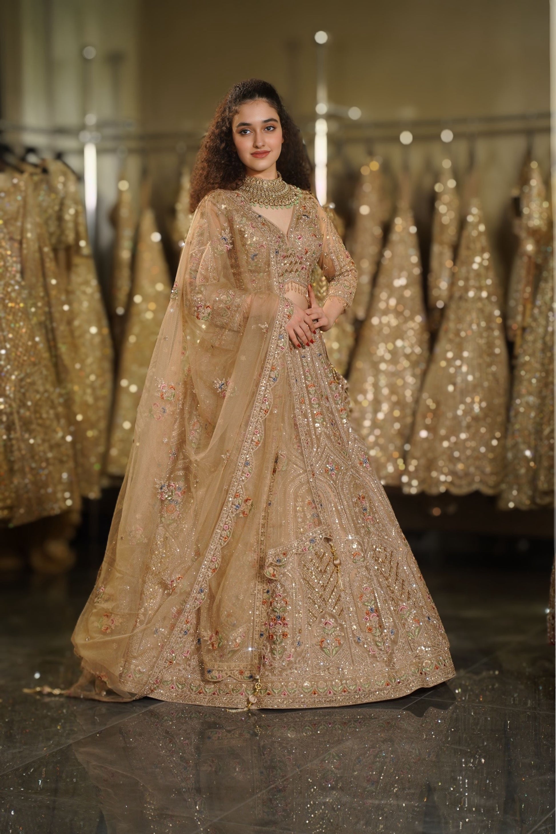 Step into a whimsical garden of luxury with this captivating Beige Gold Lehenga Set. This exquisite ensemble beautifully balances a sophisticated neutral base with the joyful vibrancy of multi-colored floral thread work. Delicate blooms in shades of pink, blue, and orange are woven into the shimmering gold embroidery, creating a fresh, romantic aesthetic. Perfect for the bride who wants a look that is both grounded in tradition and alive with colorful energy for her sangeet or day wedding.