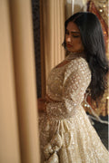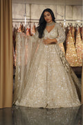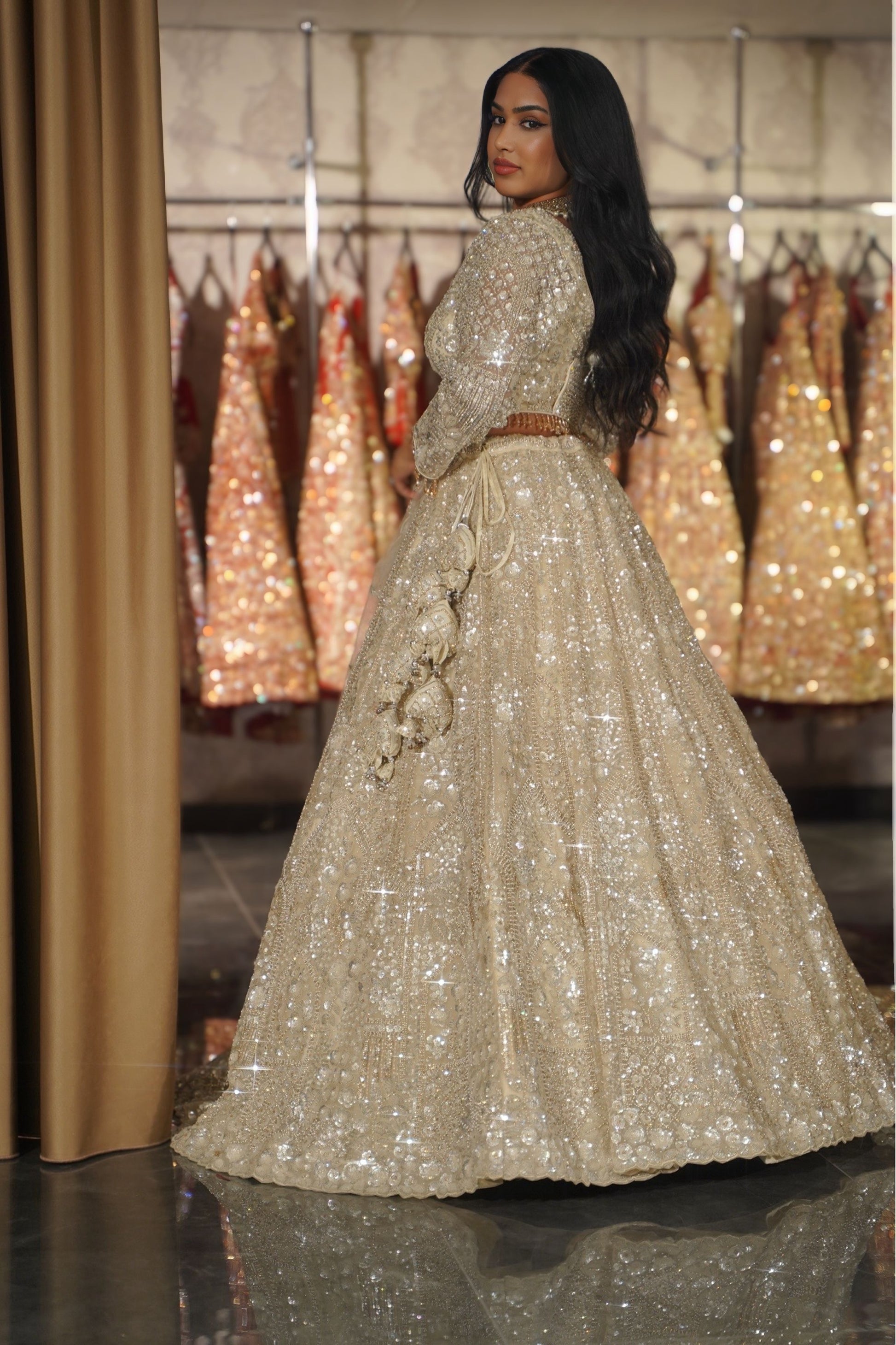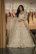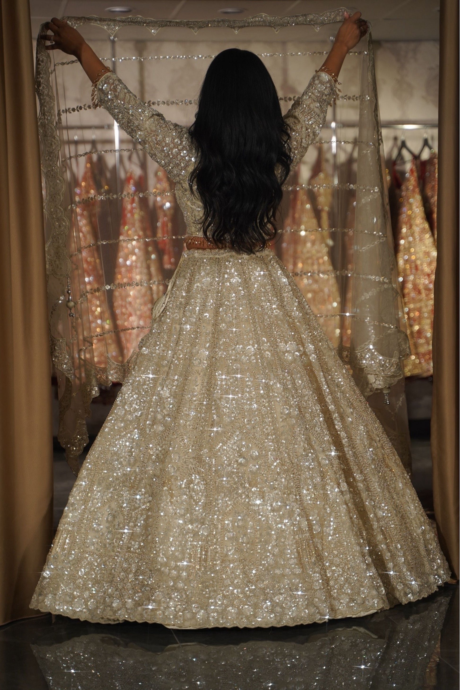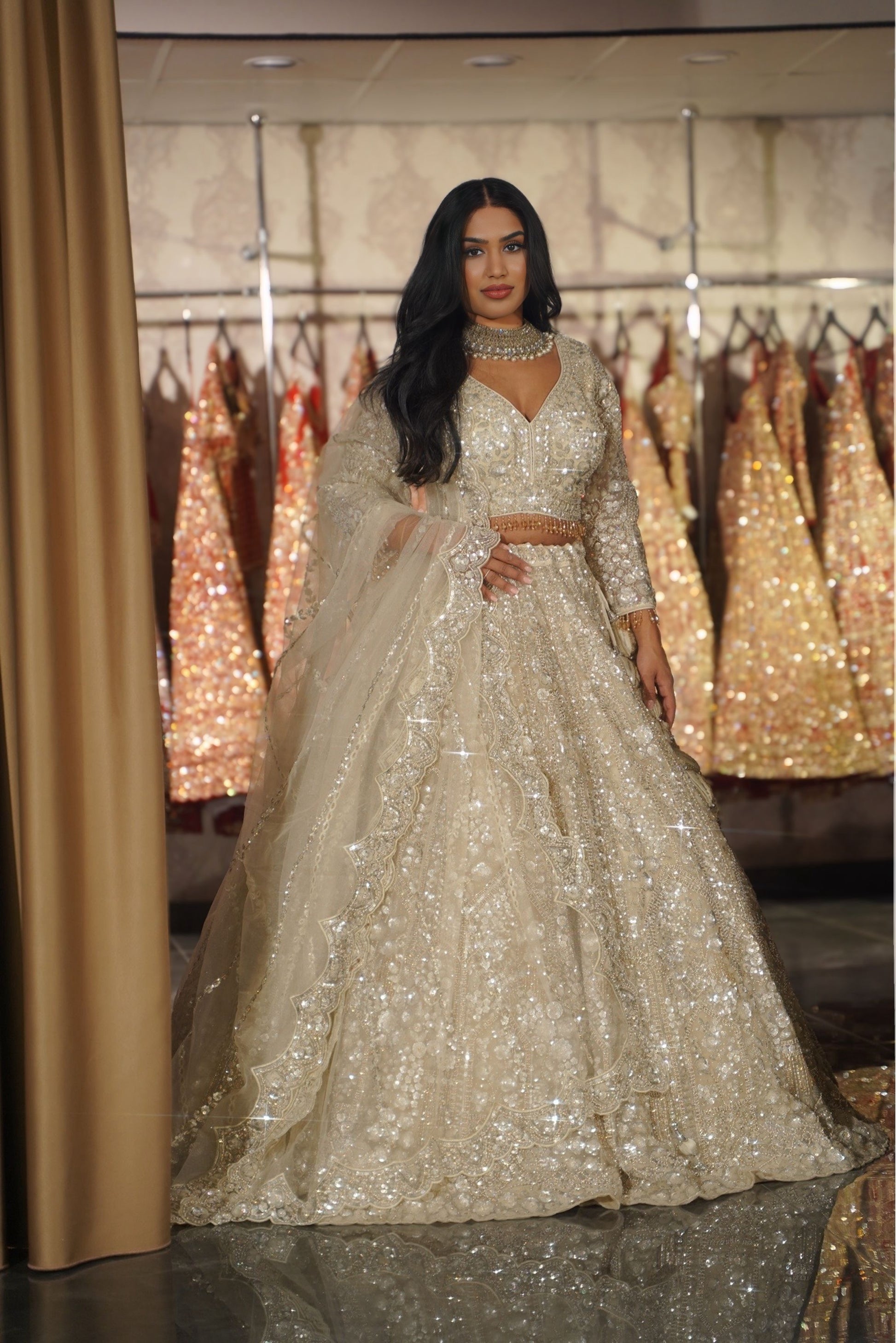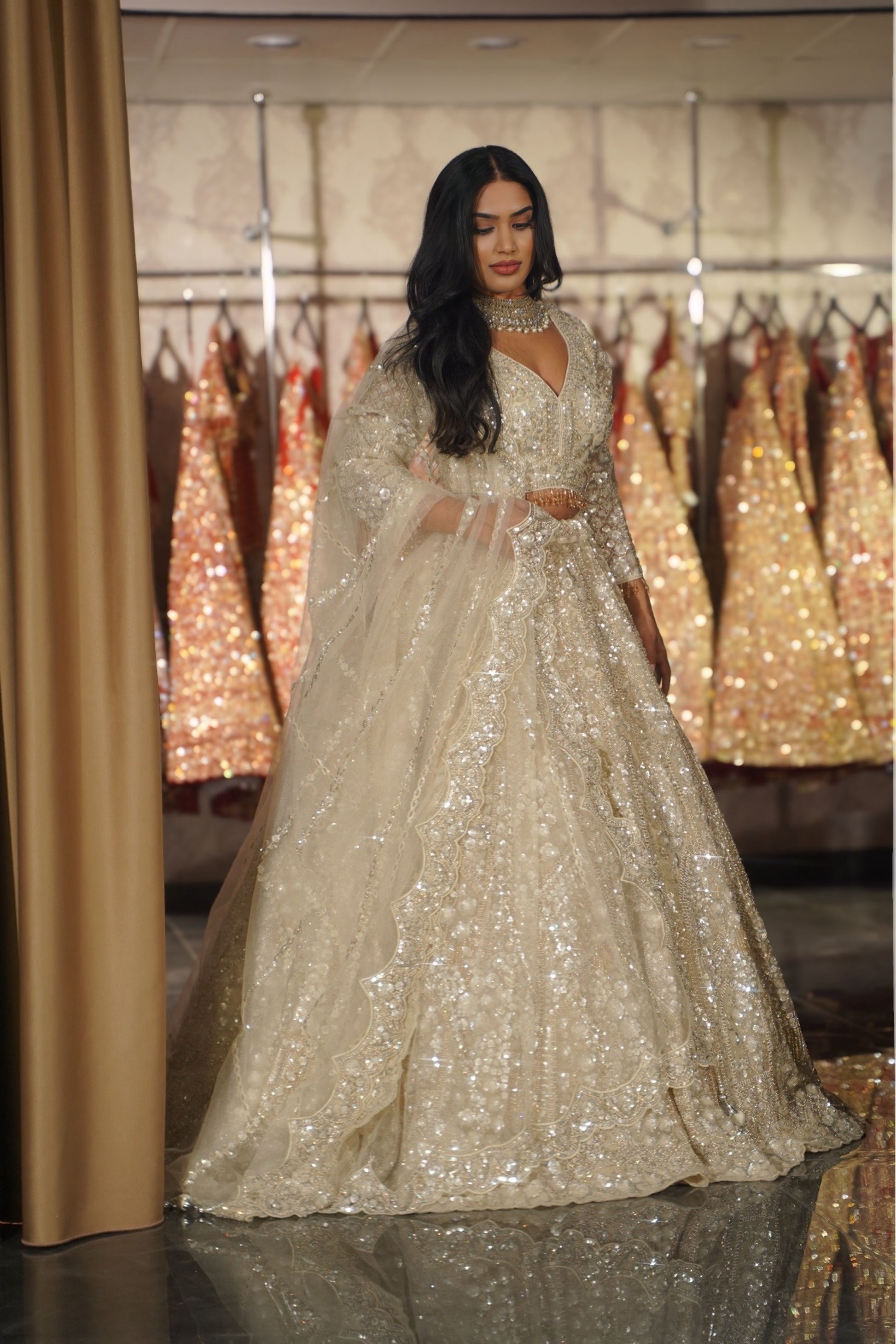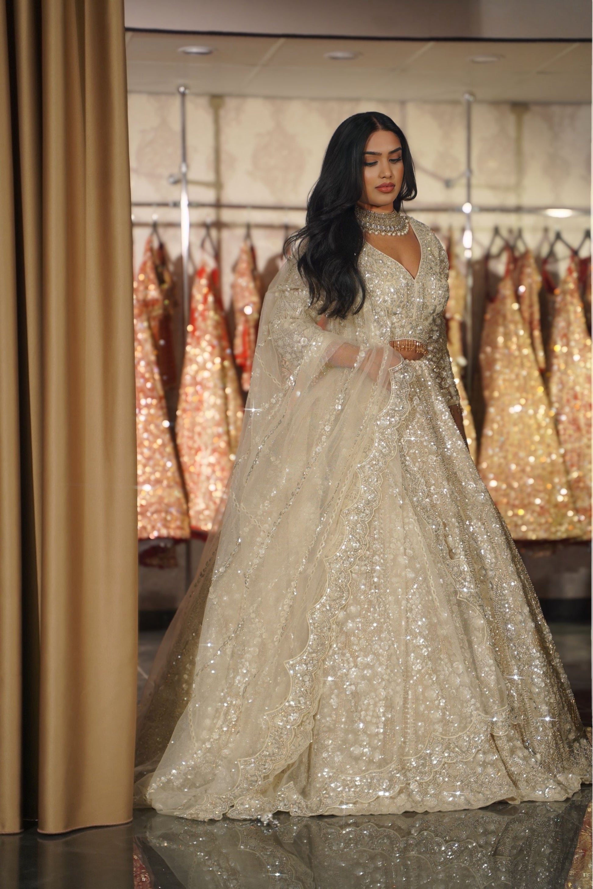 Walk into a winter wonderland with this mesmerizing Ivory Silver Bridal Lehenga Set. This ethereal creation captures the essence of a fairytale wedding, featuring a pristine ivory base heavily encrusted with silver sequins and crystals that glisten like fresh snow. It is a show-stopping choice for the modern bride who dreams of a "white wedding" aesthetic with the grandeur of traditional Indian craftsmanship, perfect for a reception or a starry evening engagement.