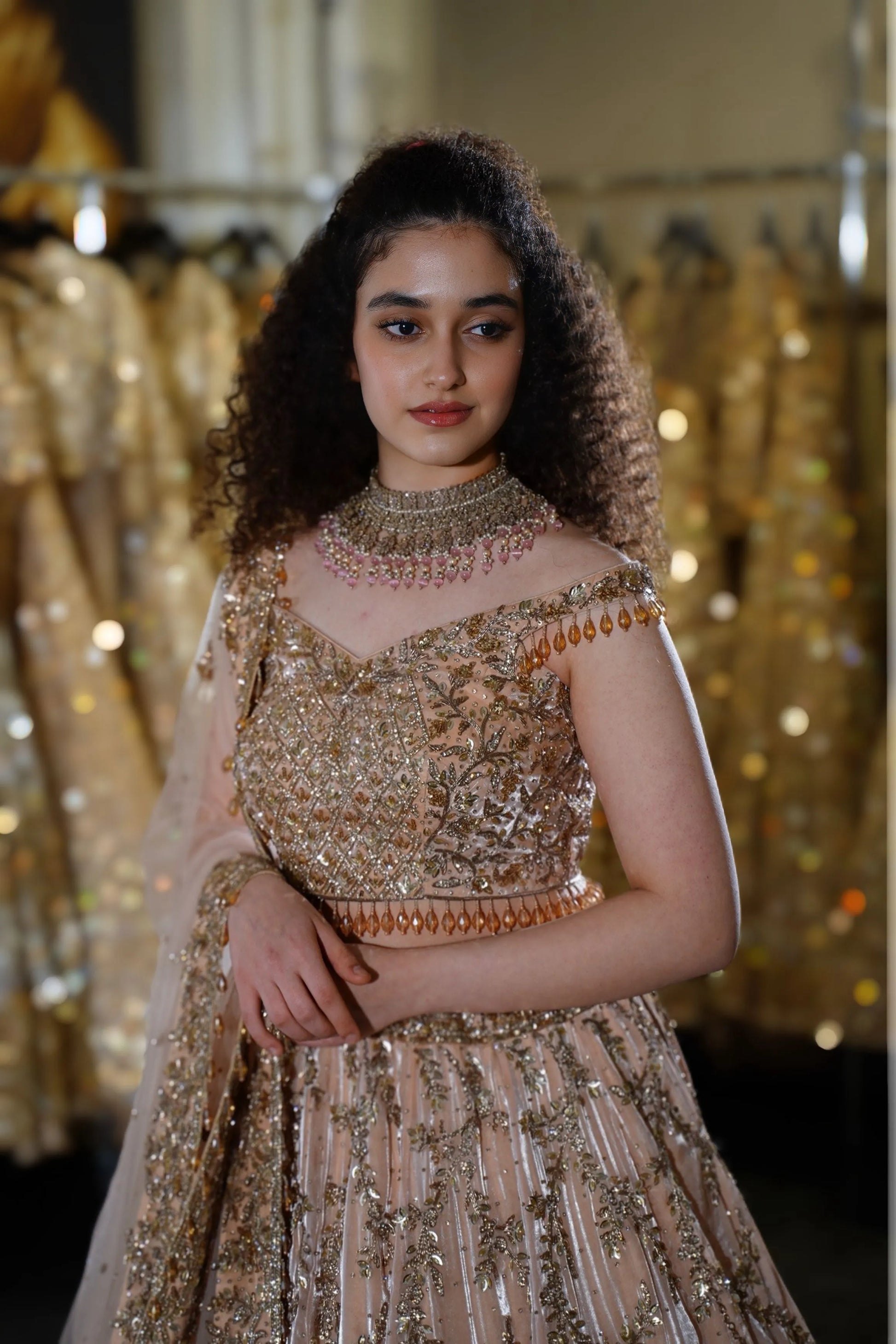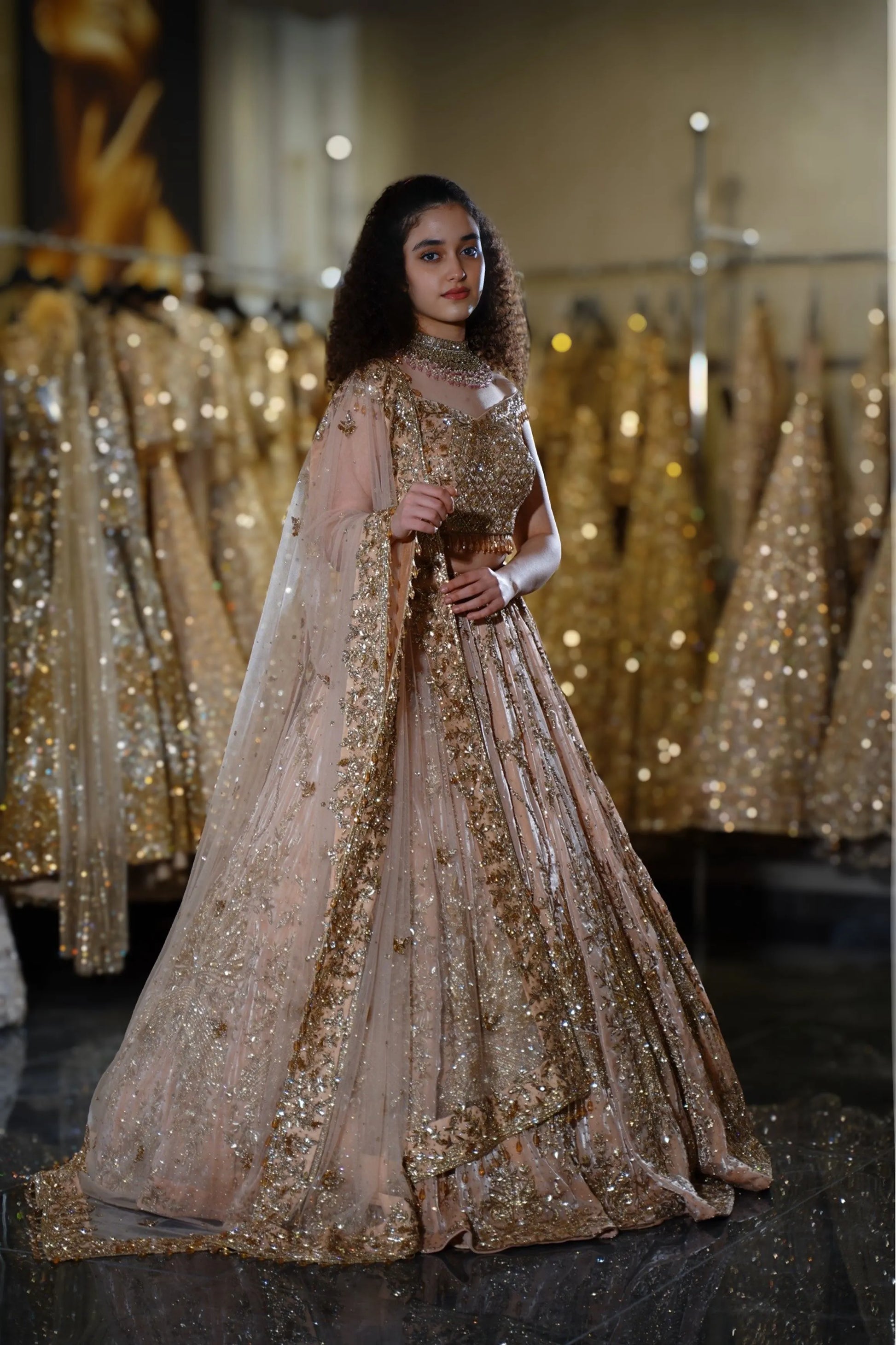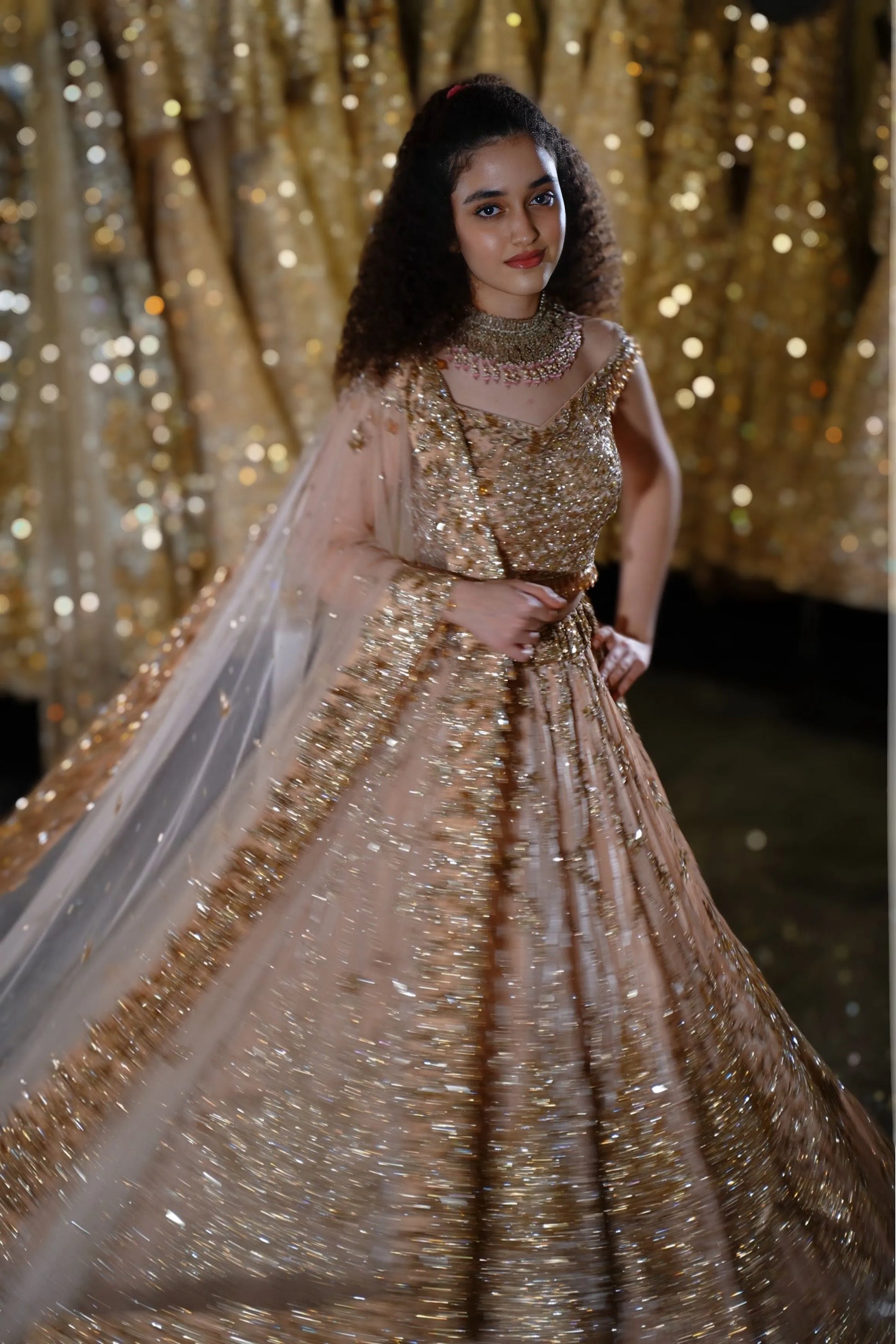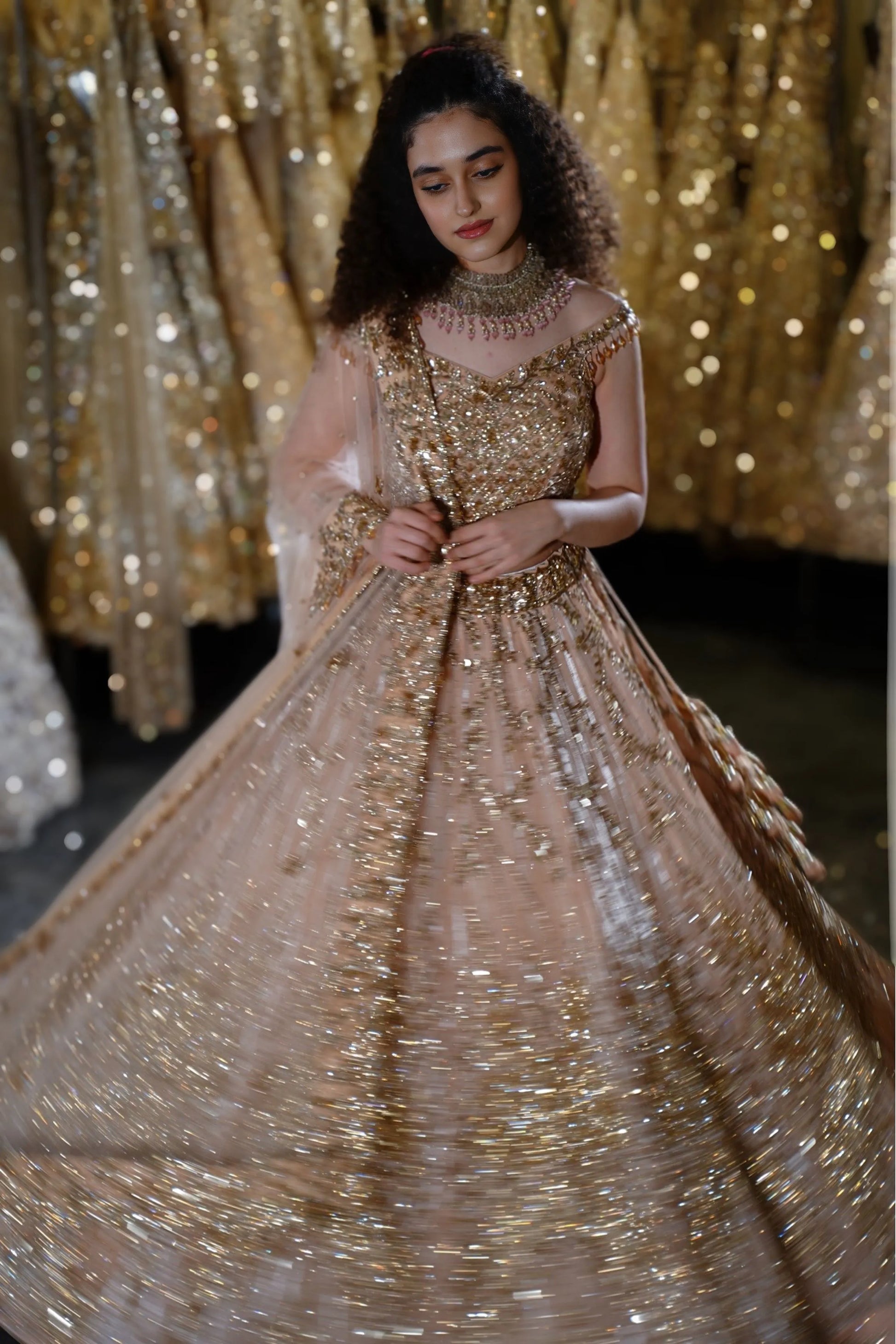 Step into your fairytale moment with this breathtaking Champagne Gold Lehenga. This opulent ensemble combines soft champagne tones with heavy gold sequin work, creating a look that radiates warmth and luxury. Perfect for the bride who desires to shine with sophisticated glamour while maintaining an elegant, romantic aesthetic at her wedding celebrations.