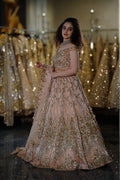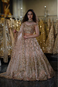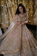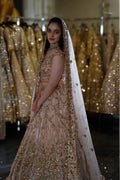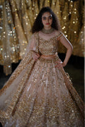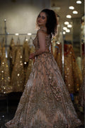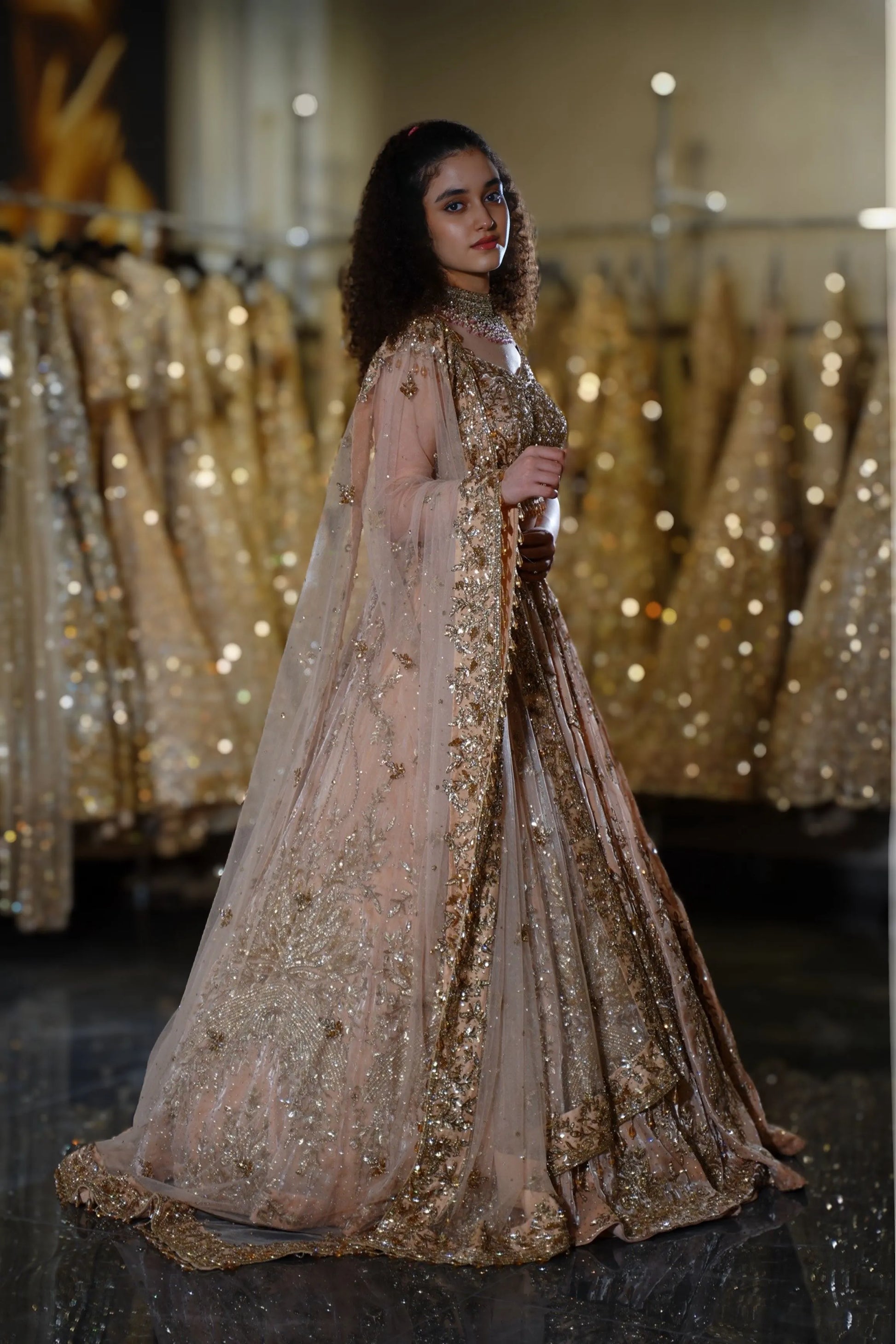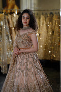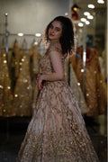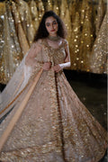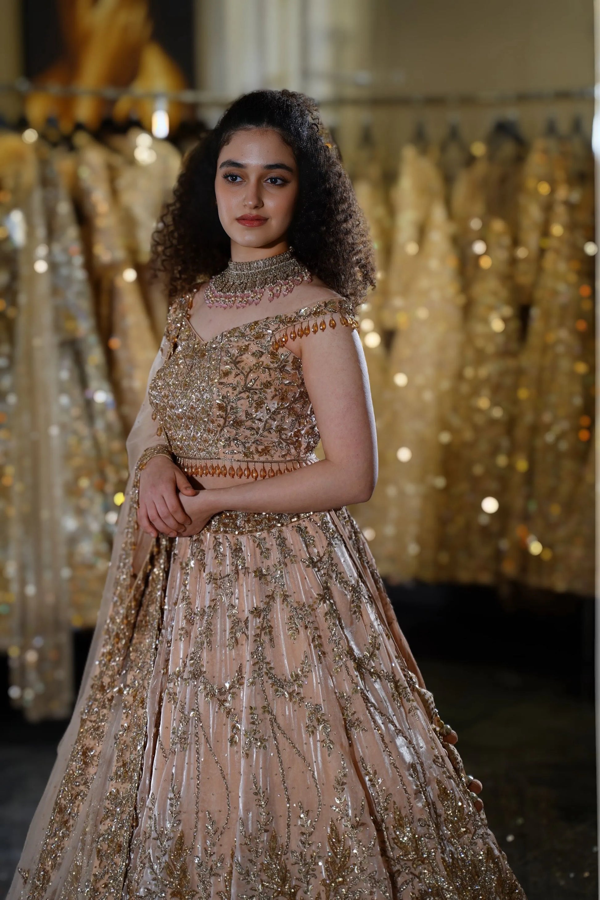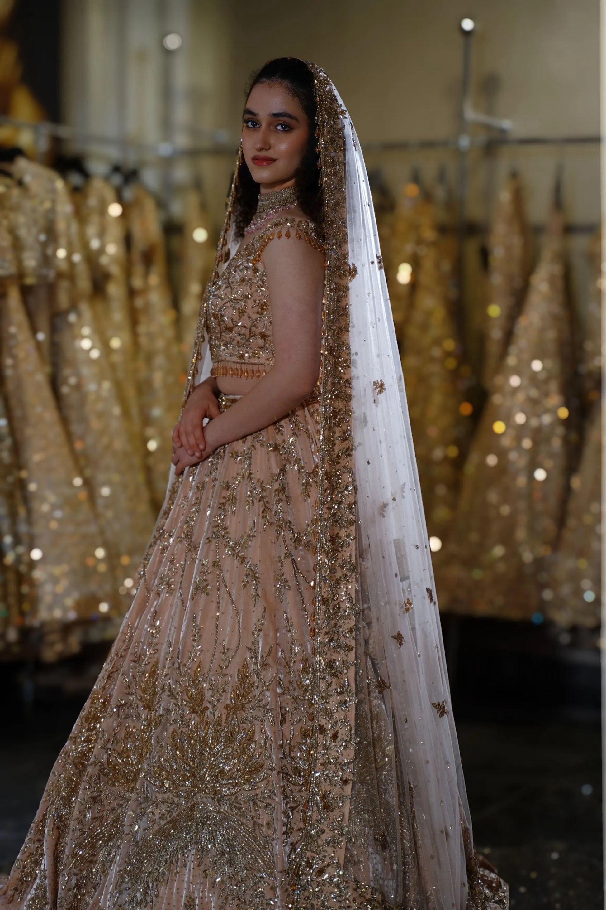 Step into your fairytale moment with this breathtaking Champagne Gold Lehenga. This opulent ensemble combines soft champagne tones with heavy gold sequin work, creating a look that radiates warmth and luxury. Perfect for the bride who desires to shine with sophisticated glamour while maintaining an elegant, romantic aesthetic at her wedding celebrations.