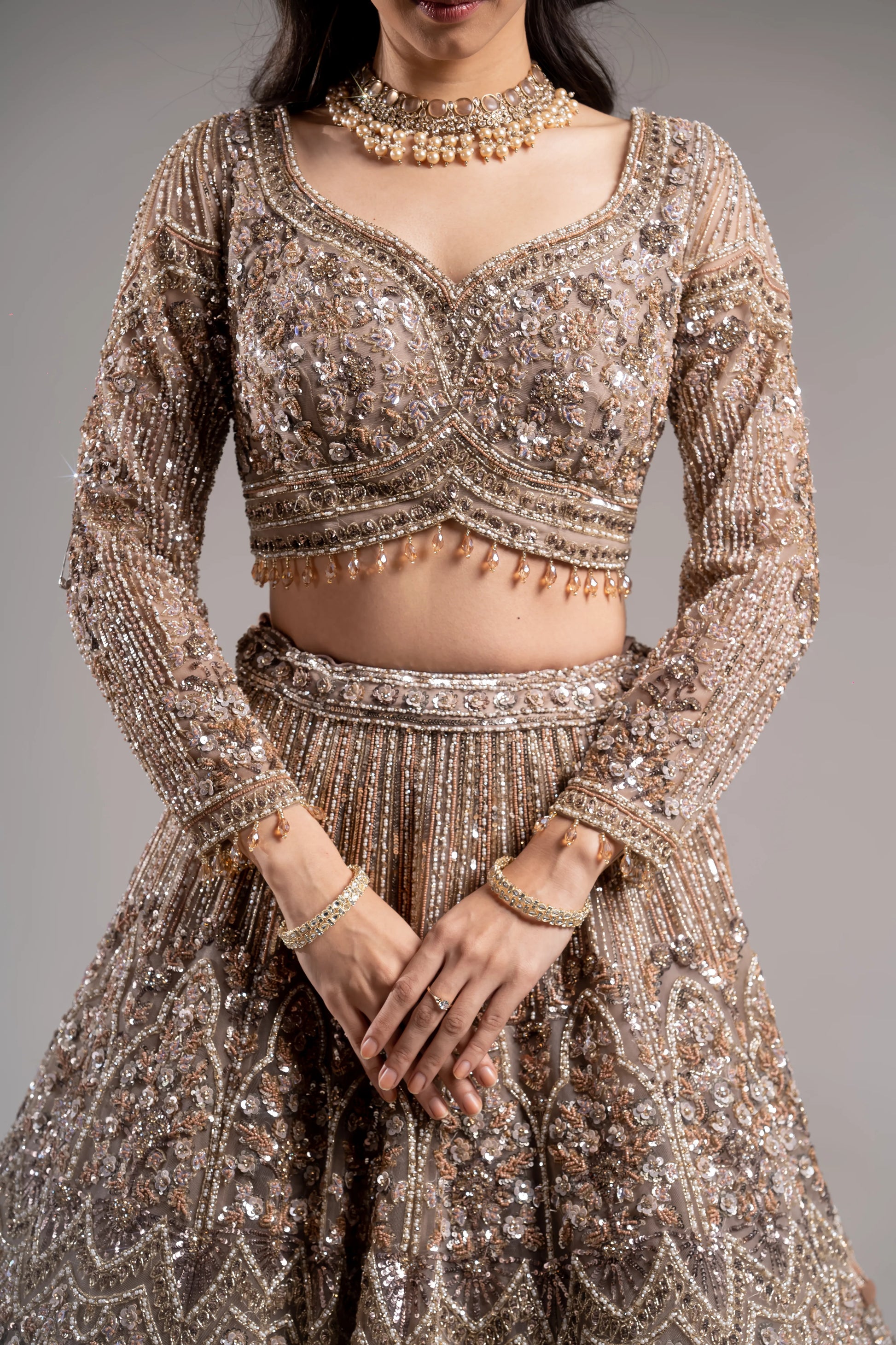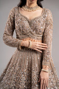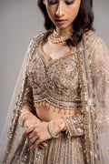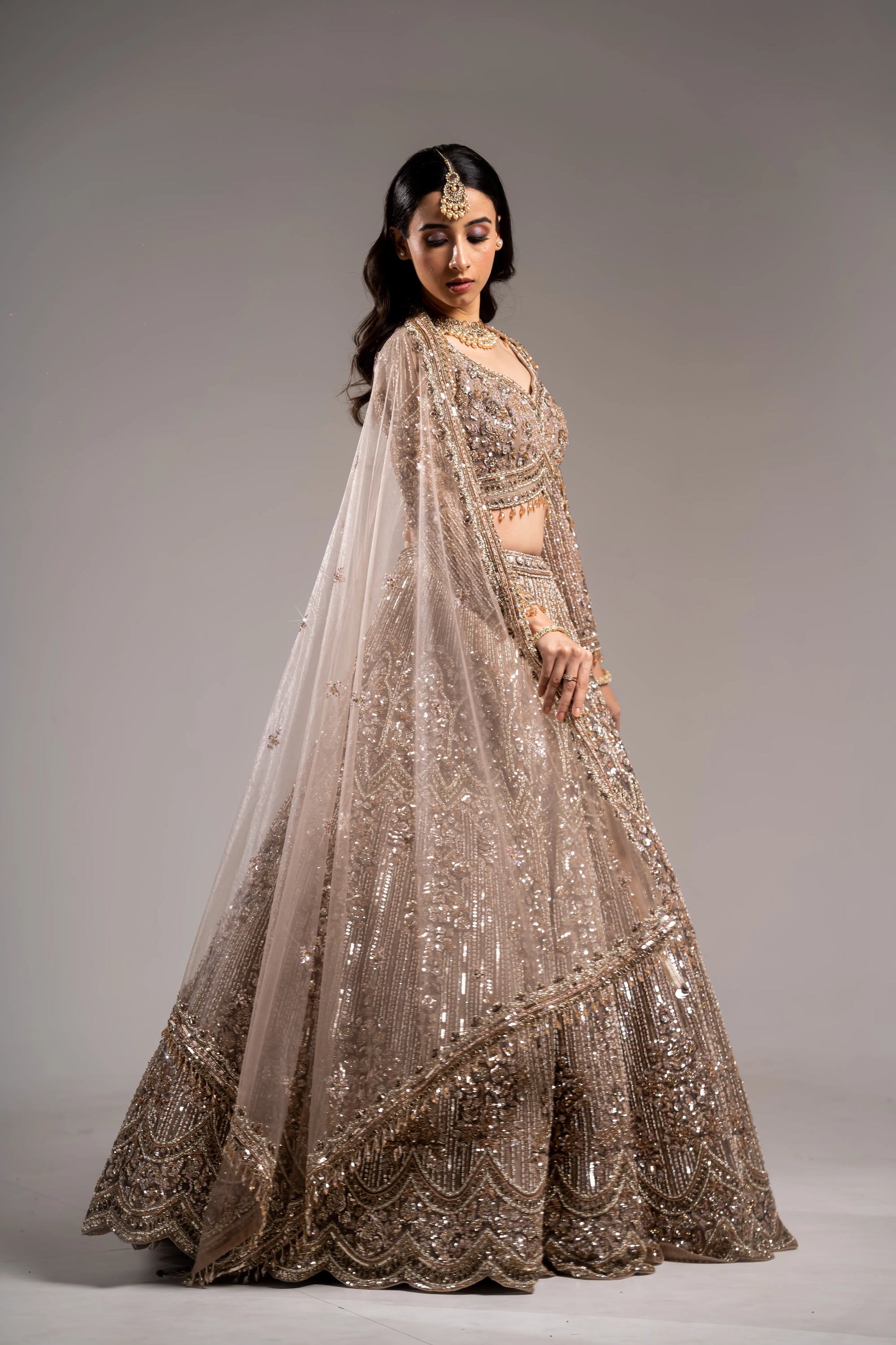 Dusty Taupe Champagne Scalloped Sequin Embroidered Bridal Lehenga